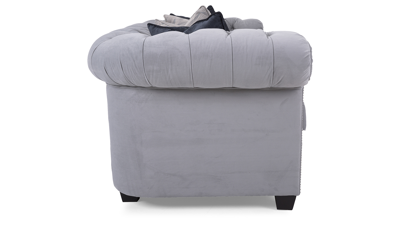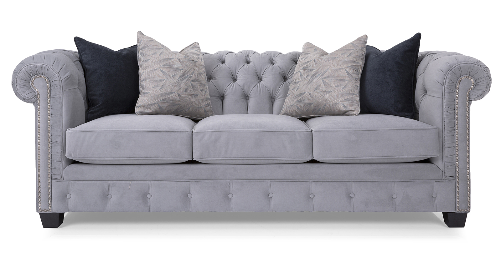 This hand tufted sofa is a reminiscent of the classic chesterfield style. This sofa evokes the feel of a grand gentlemen’s club with is high rounded arms and nail head detailing. Velvet can turn this sofa into a lady’s best friend, create that glamour factor or prestigious charm.