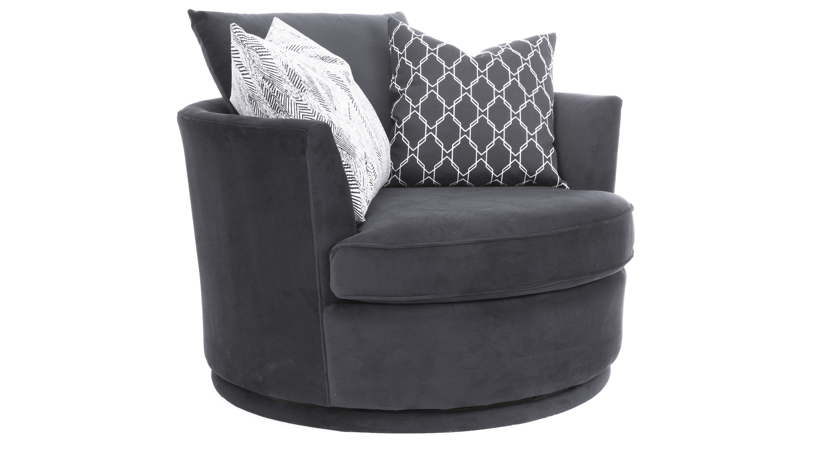 Round out your living room with the contemporary curves of this chair lounger. This inviting swivel chair beckons you to kick off your shoes and snuggle up. A tight barrel back completes the circle with a loss back pillow and several oversized throw pillows.