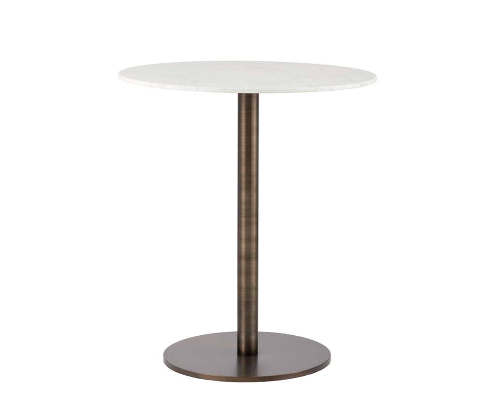 An Art Deco inspired round bar table, featuring a solid carrara marble top with an antique bronze steel base. Perfect for bars, lounges and restaurants. As marble is a natural material, unique veining, pitting, fissures, micro-cracks and colour variations are all characteristics that add to the uniqueness and beauty of each piece.