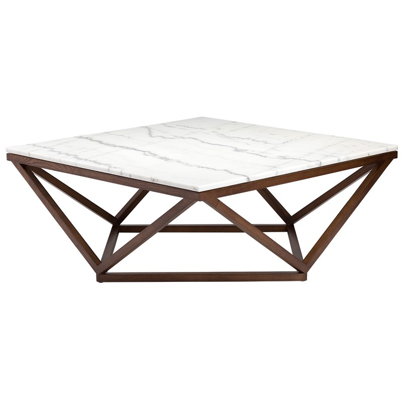 The Jasmine coffee table is notable both for its innovative design and structural grace. A solid marble tabletop rests on a delicate framework of squares and triangles constructed in solid American Ash stained Walnut, inspiring a sense of lightness and refinement. Each piece of marble is expertly crafted out of a unique piece of natural stone, creating beautiful variations and one-of-a-kind details.