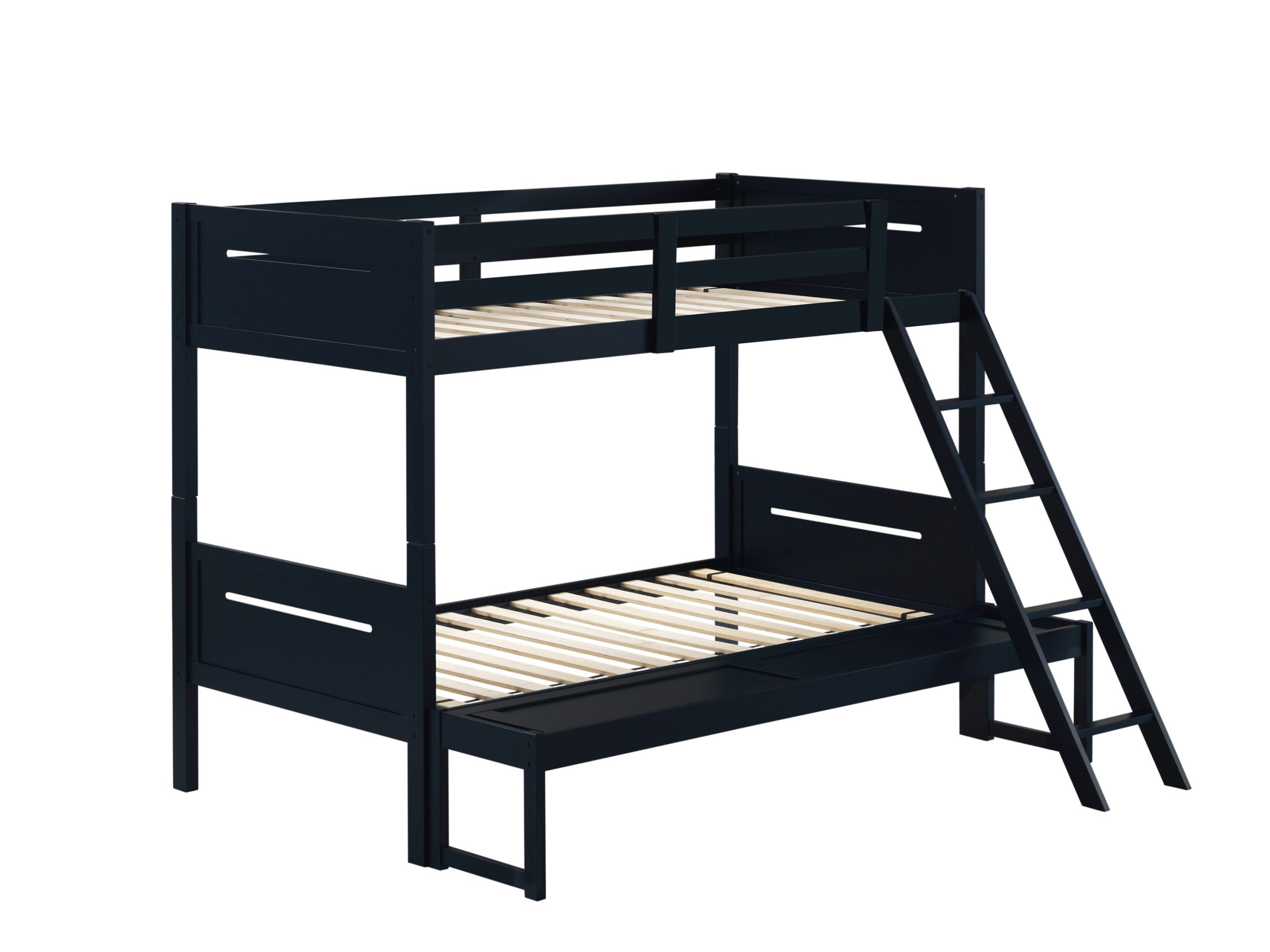 Space-saving with a clean and minimalist aesthetic, this youth bunk bed features a modern style frame that lends a masculine vibe.Perfect for making more floor space, this bunk bed offers a square design with a straight headboard and footboard, each with a slim notched out space.Available in several colors, this bunk bed complements any room’s current color palette.An angled ladder allows kids to get to the top bunk, which also offers secure guardrails on each side.The bunk bed can be separated into two to create side by side beds as well.