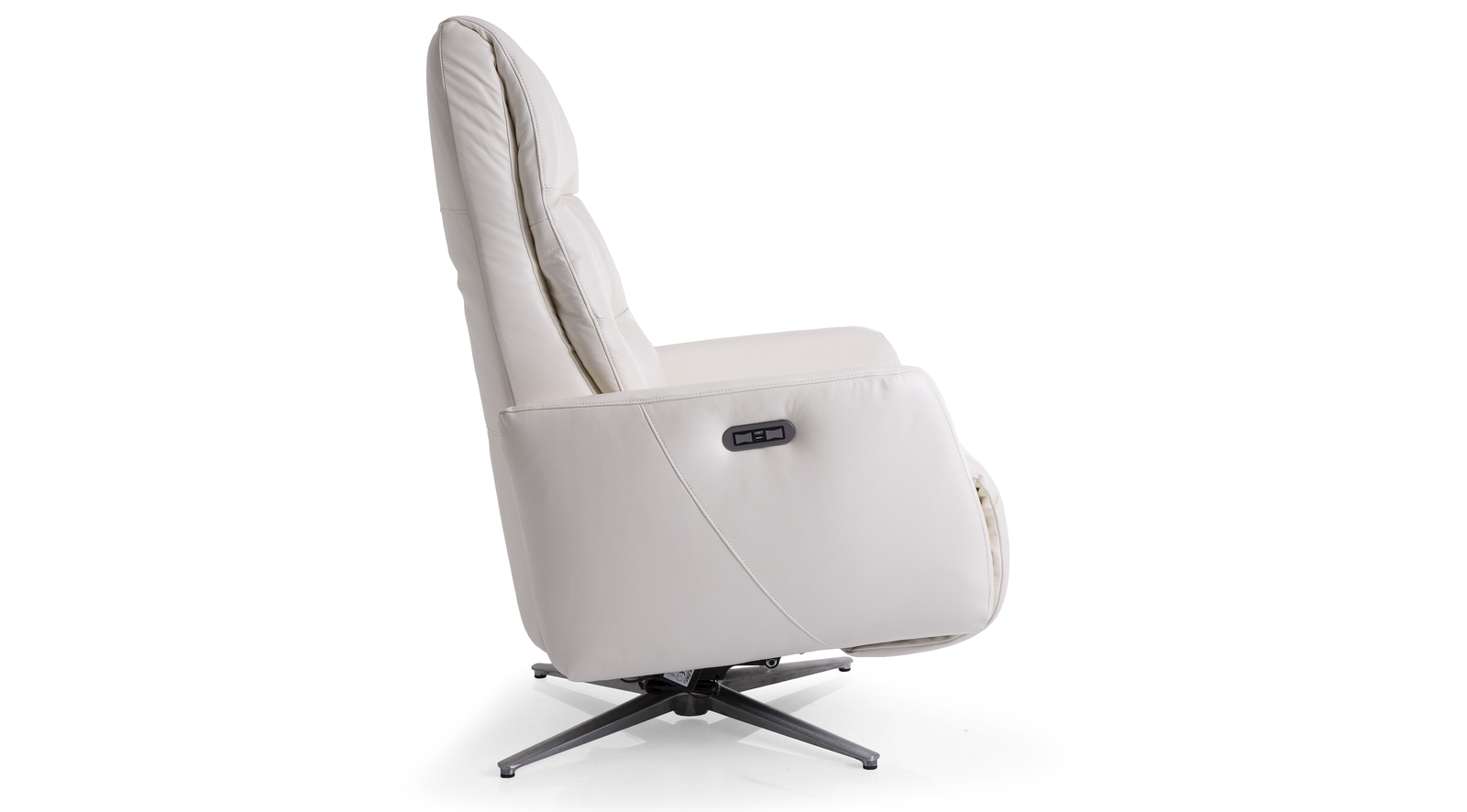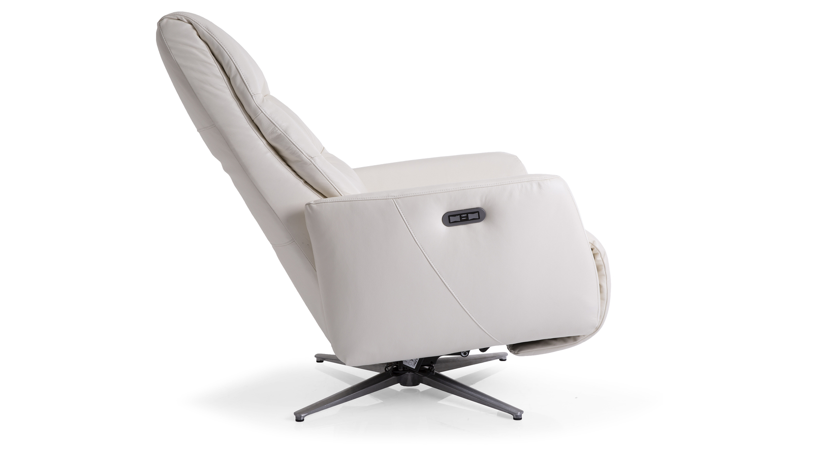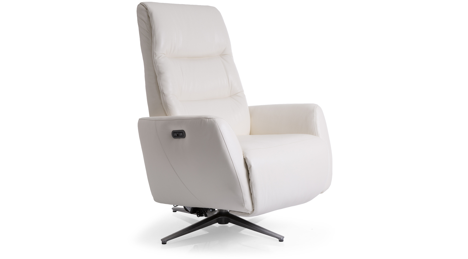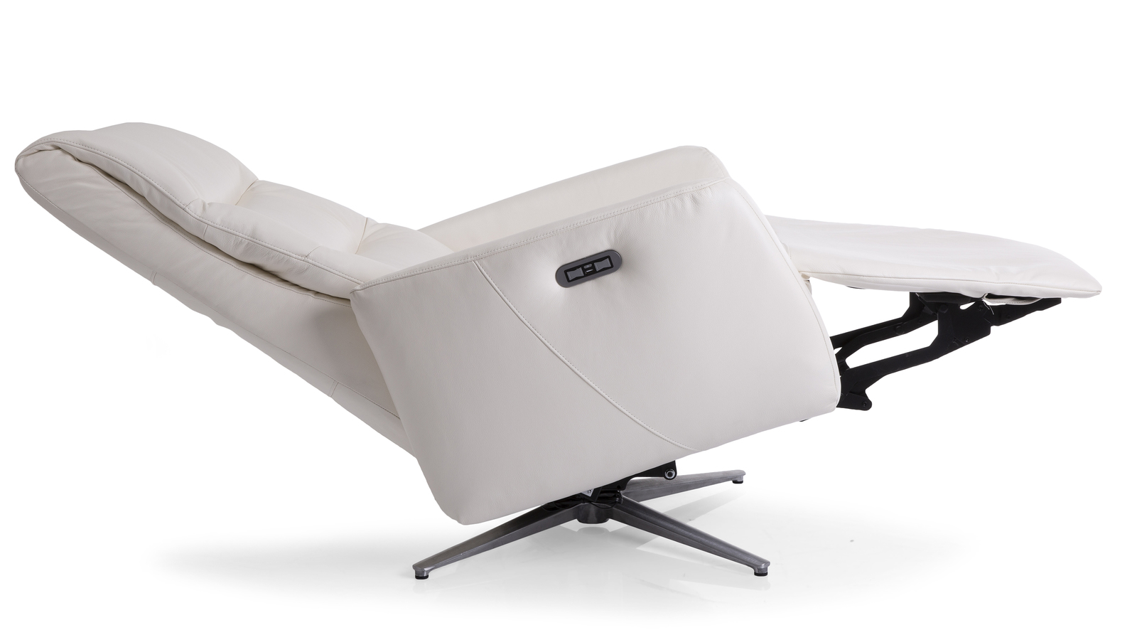 Modern power recliner with futuristic design. This chair boosts 2 motors, adjustable headrest, molded foam seats and a metal chrome base. Optional battery back-up available. Available in fabric or leather.