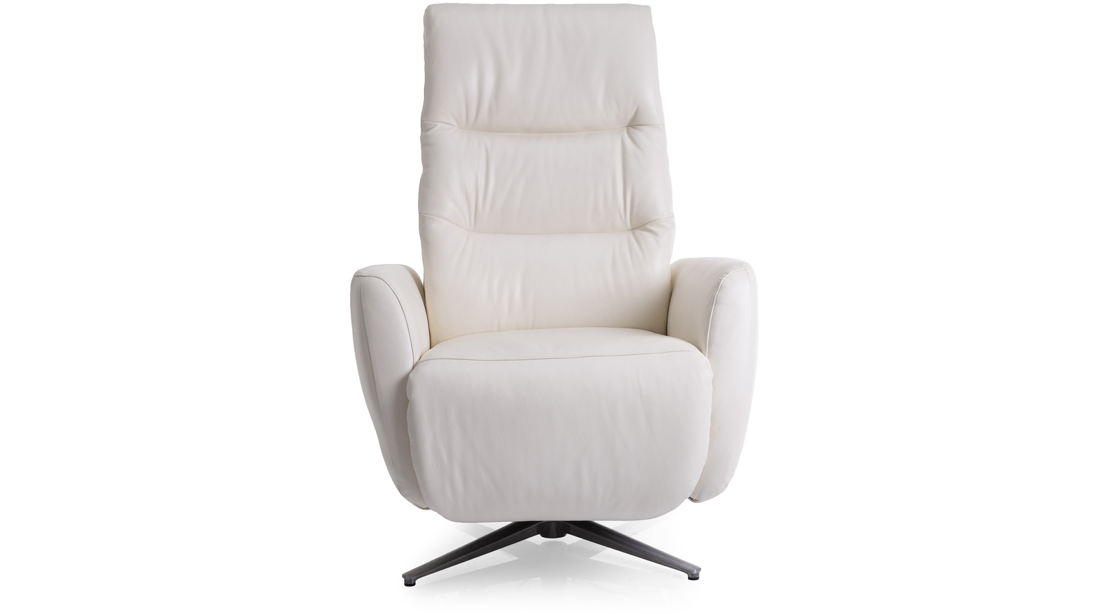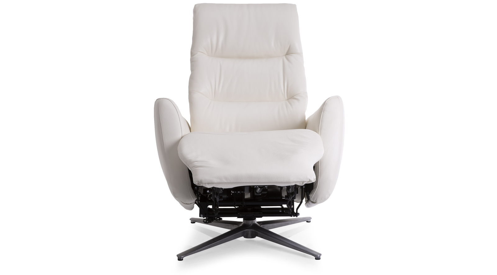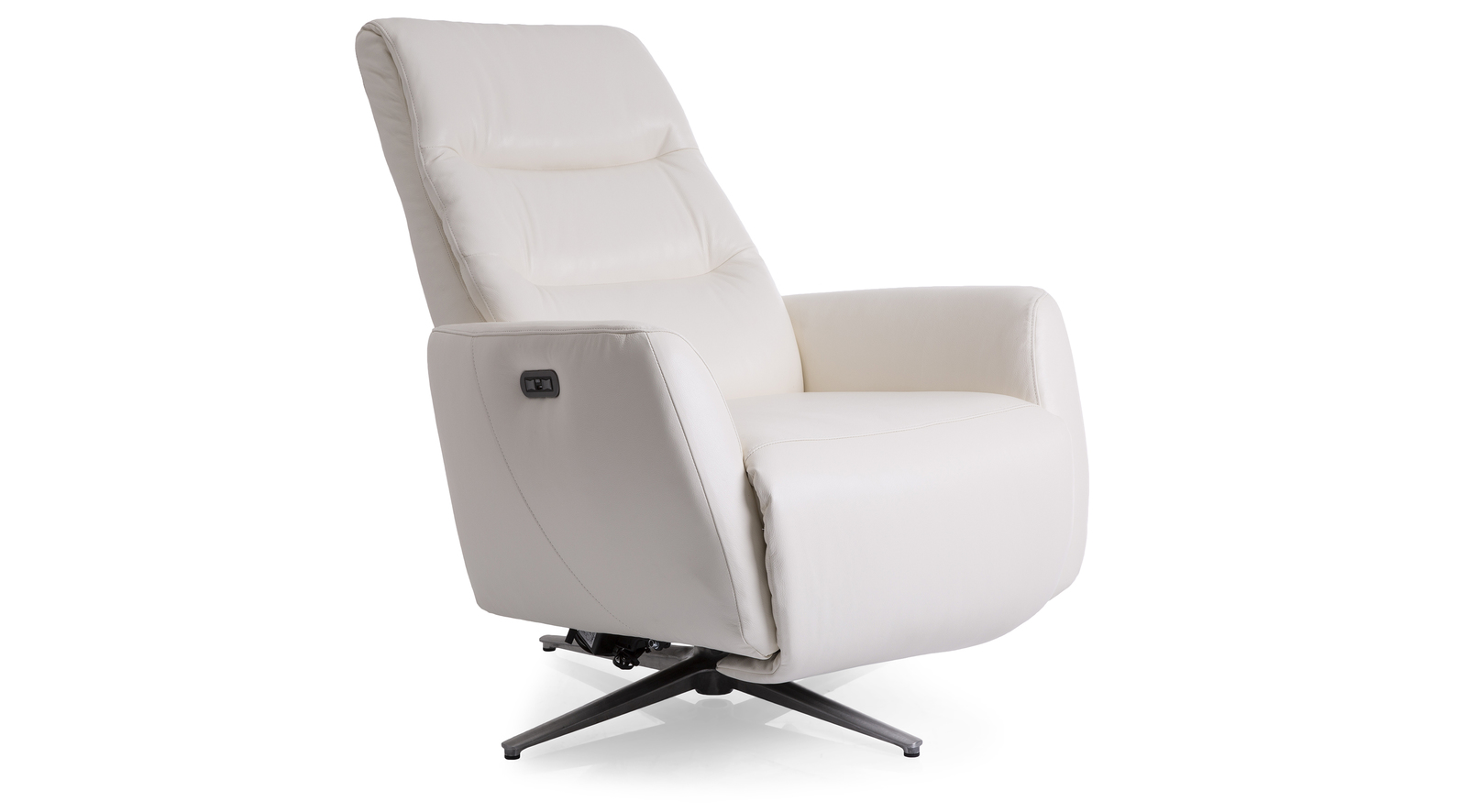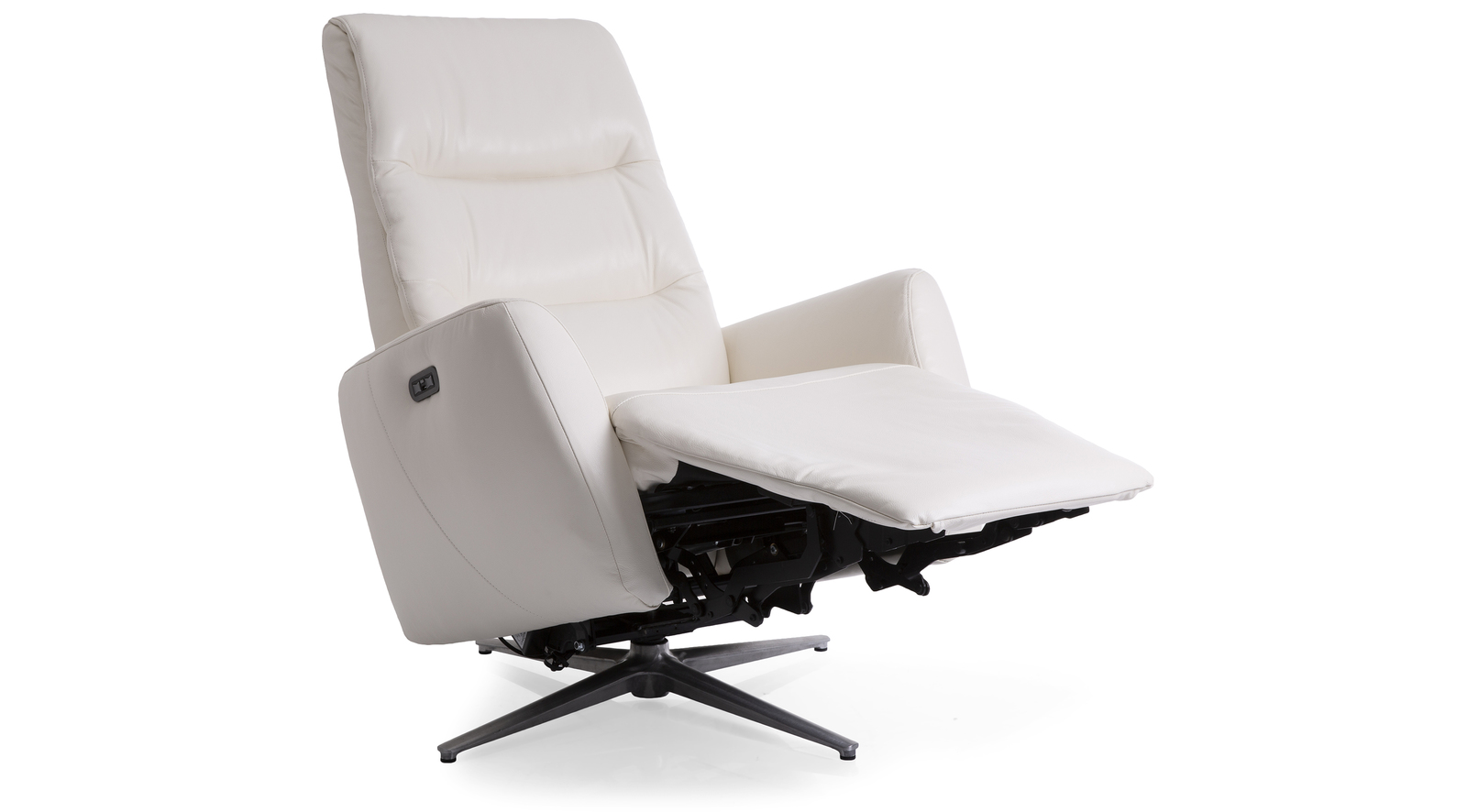 Modern power recliner with futuristic design. This chair boosts 2 motors, adjustable headrest, molded foam seats and a metal chrome base. Optional battery back-up available. Available in fabric or leather.
