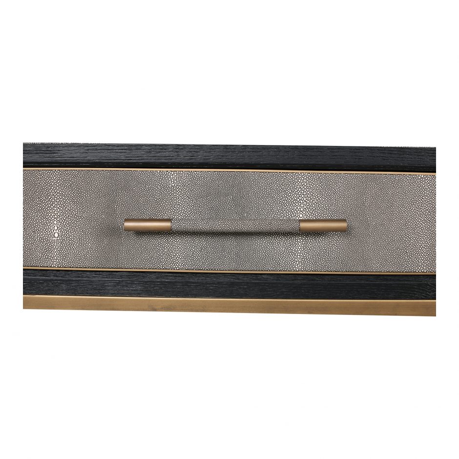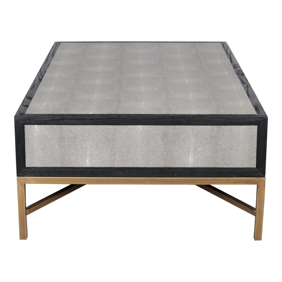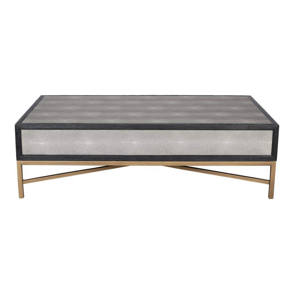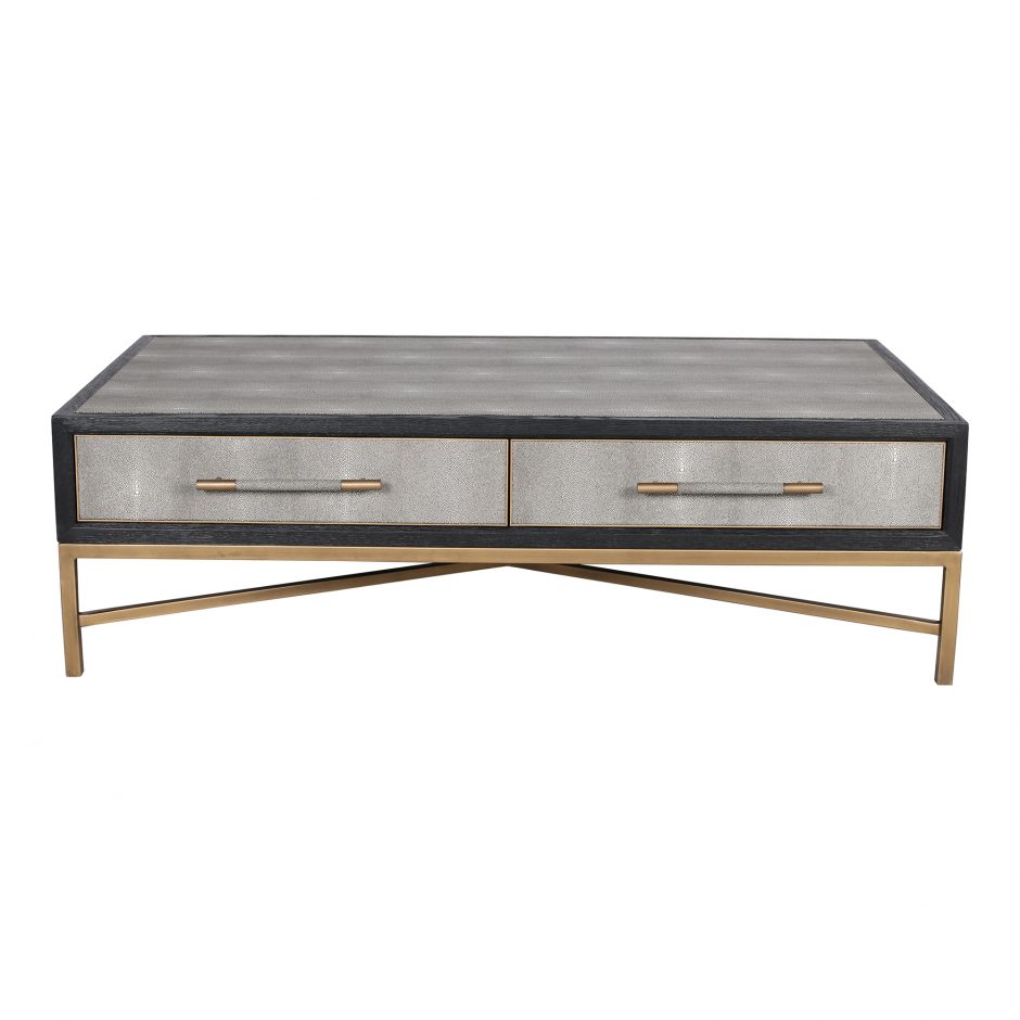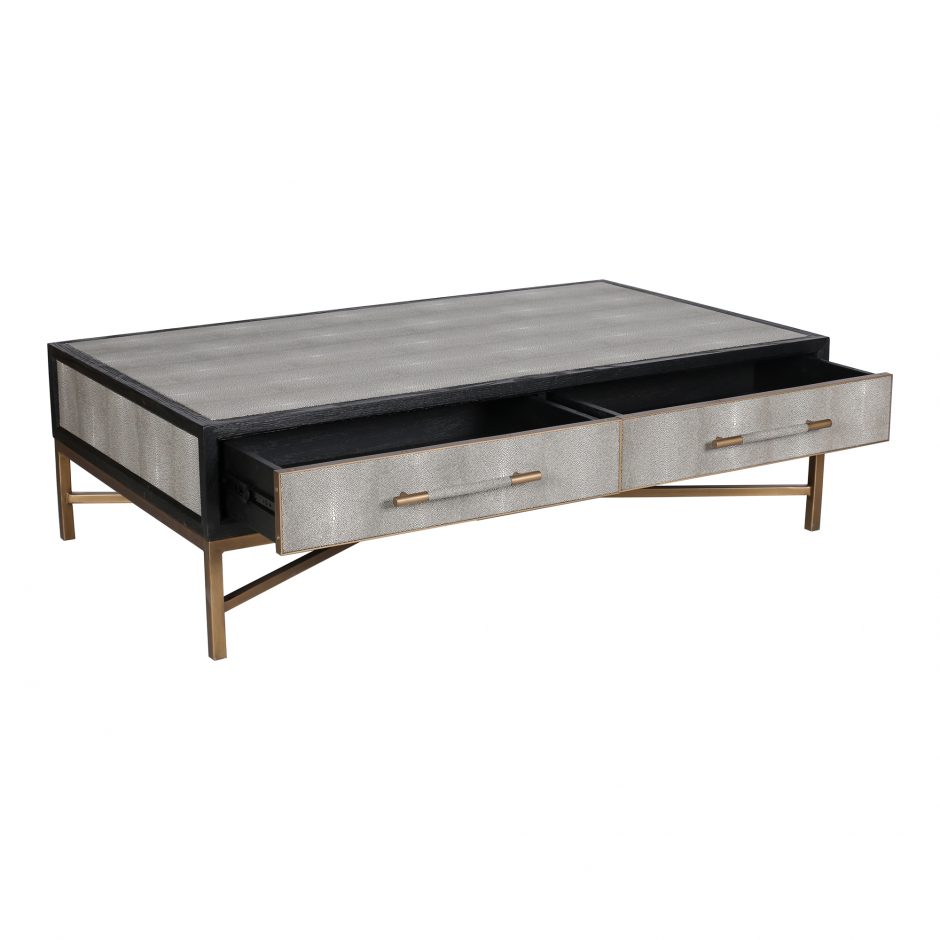 Feeling for the timeless glamor of art deco with a modern twist? Meet the Mako collection. With each item upholstered in the highest quality vegan leather shagreen, the Mako collection brings effortless style, visual texture and substance to your living space. The perfect centerpiece to tie your living room together, this coffee table’s black oak frame and brass-finished metal legs deliver personality and durability. Two easily accessible slide out drawers provide ample storage, ensuring the Mako coffee tables reputation as a true modern classic.