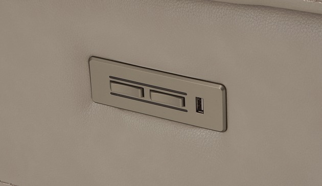 Power recline and power headrests operated by a brushed metal power switch with integrated USB charging
