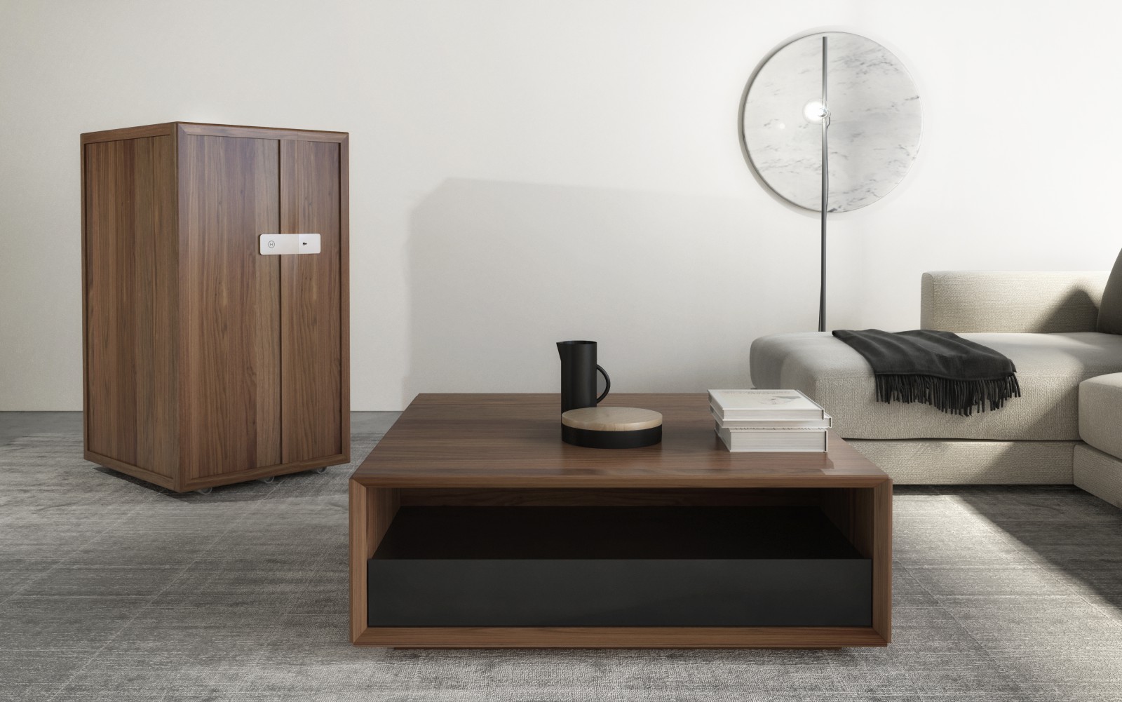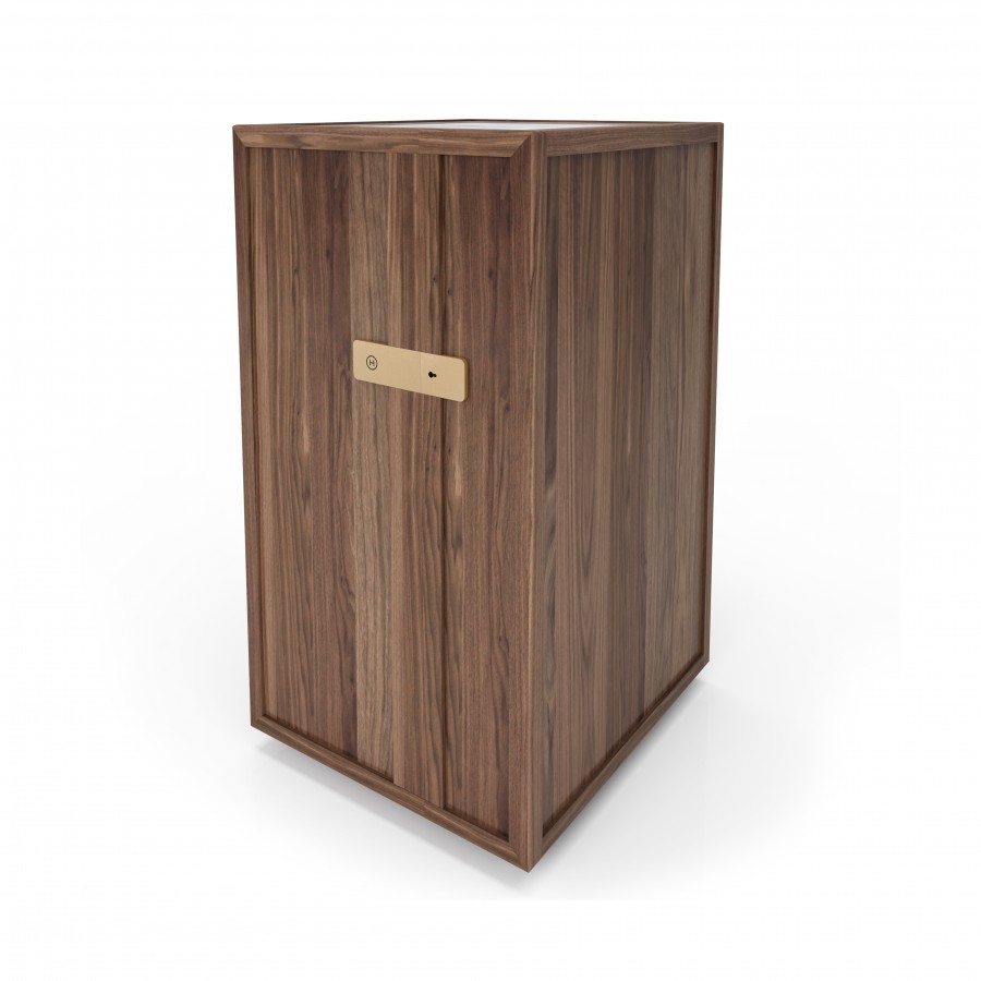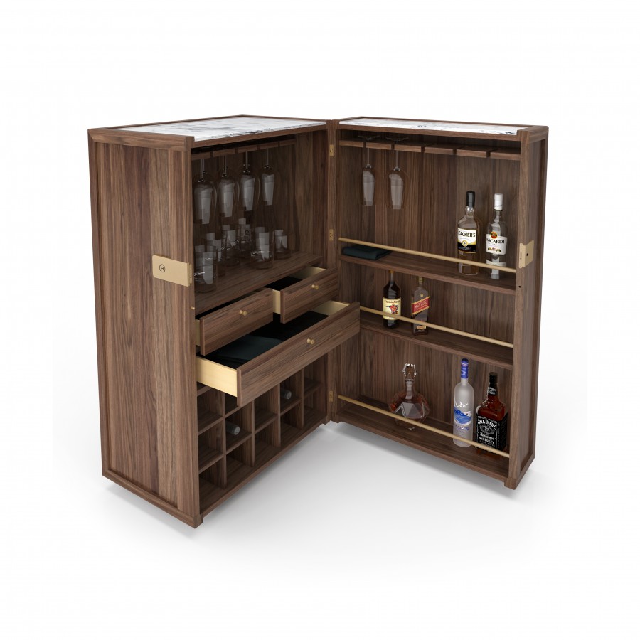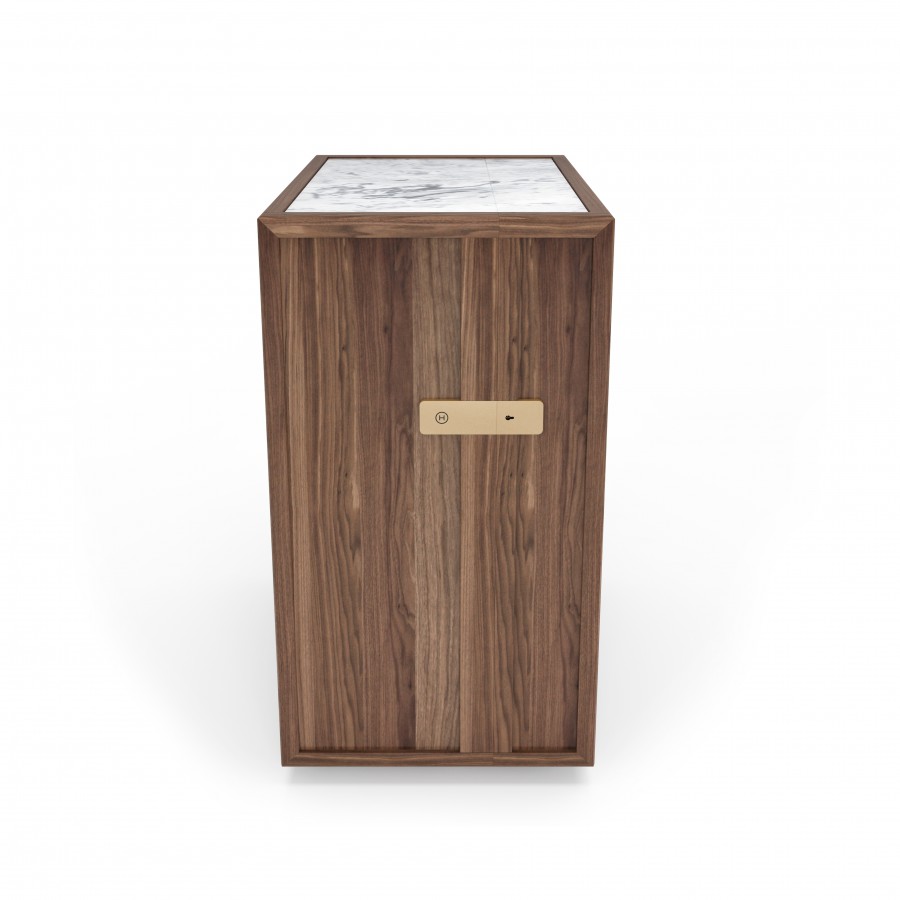 Made of American black walnut, The “50th Anniversary” Ray Bar features an elegant white marble or black granite top and is adorned with a solid brass lock and hardware as well as drawers lined with merino wool felt.