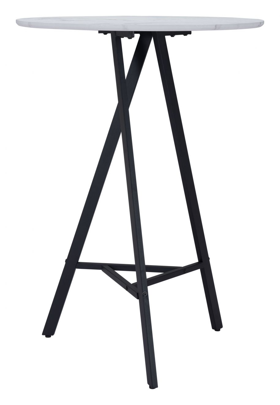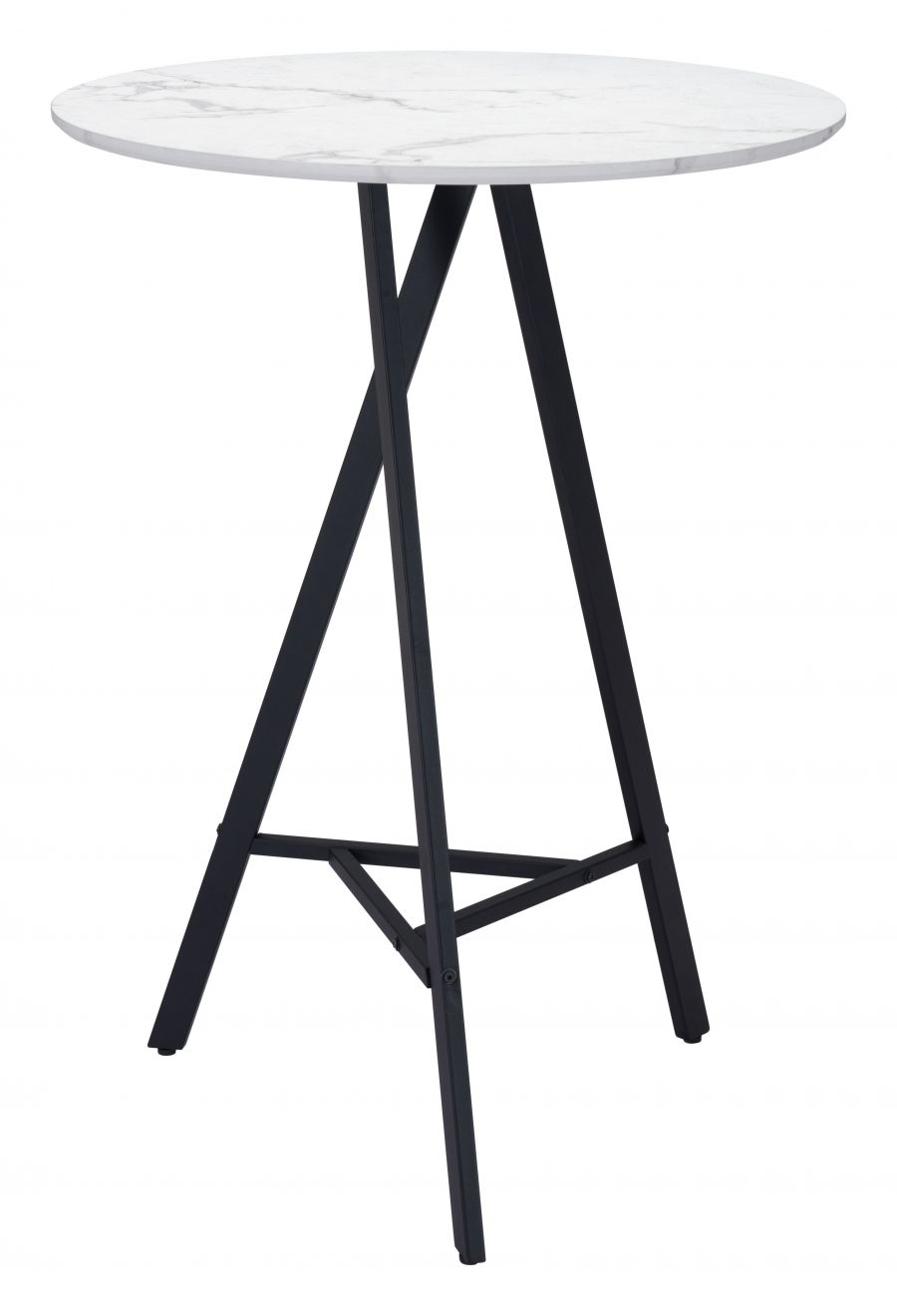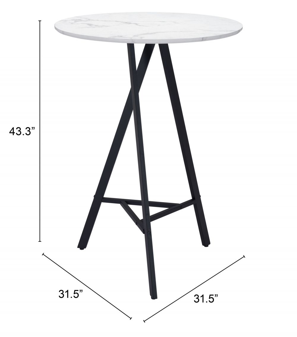 A classic round table, the Rouen Bar Table fits any mid century modern space, perfect for any space, dining, work, or open plan. The top is a durable MDF laminate top with a marble print and steel legs powder coated in black.
