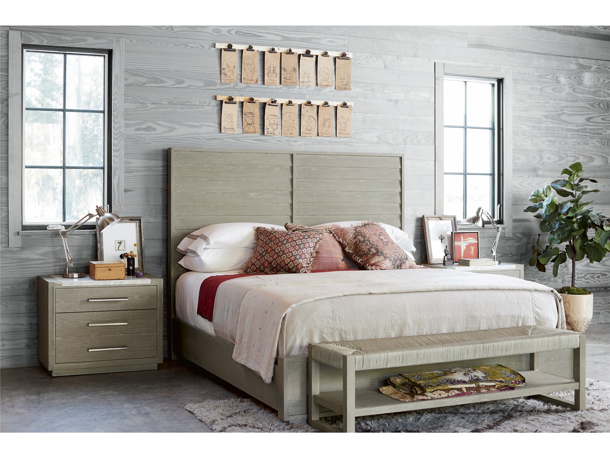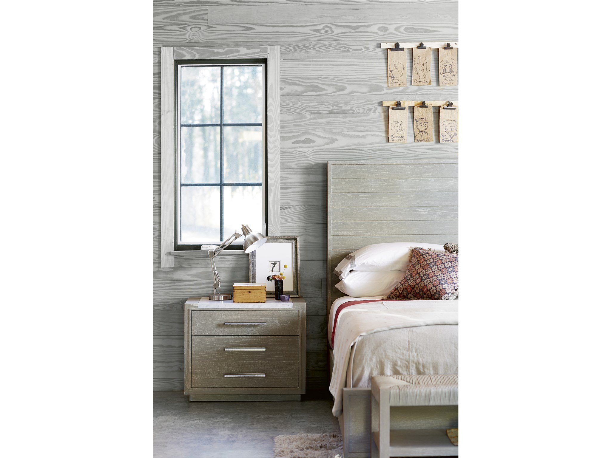 The Zephyr Nightstand with Stone Top features three drawers, an inset stone top, and sleek silver bar hardware; bringing a one-of-a-kind touch to bedroom spaces.