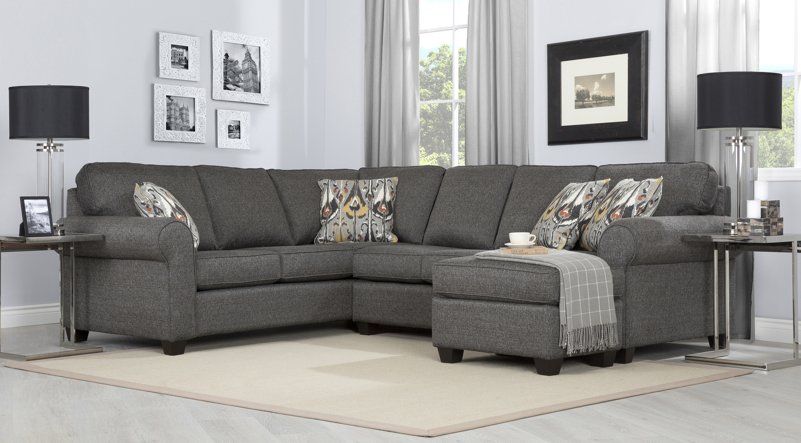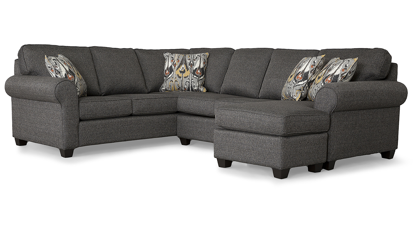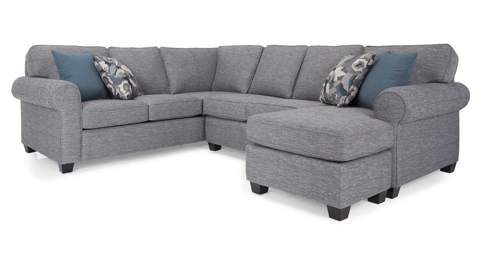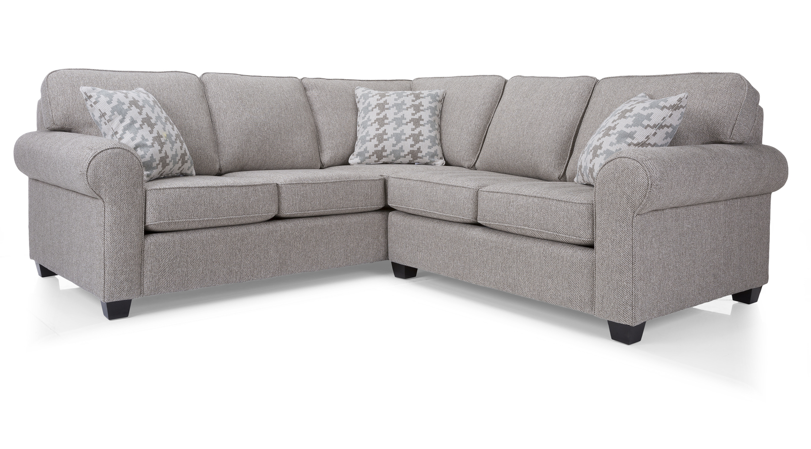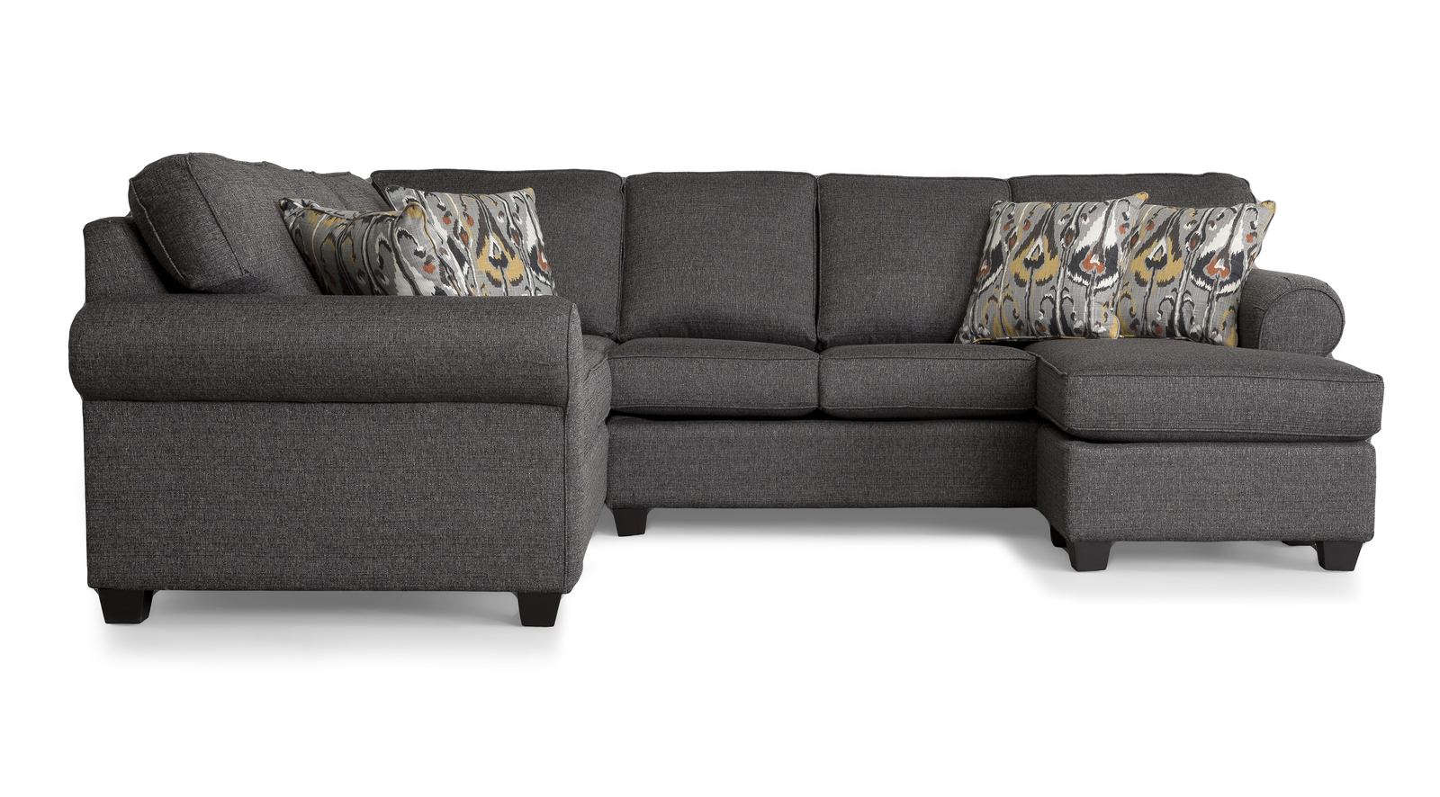 This transitional yet traditional style sectional features semi attached back with rolled arms and an abundance of toss pillows-resulting in a versatile foundation for your seating area. Hand-built by our dedicated upholster artisans in North America.