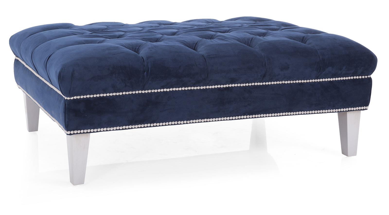 This expertly hand tufted Ottoman is a statement piece for any home. 7” Wood legs and optional nail studs give this ottoman an air of elegance. Can be used in a traditional or glamorous lifestyles depending on the fabric chosen.
