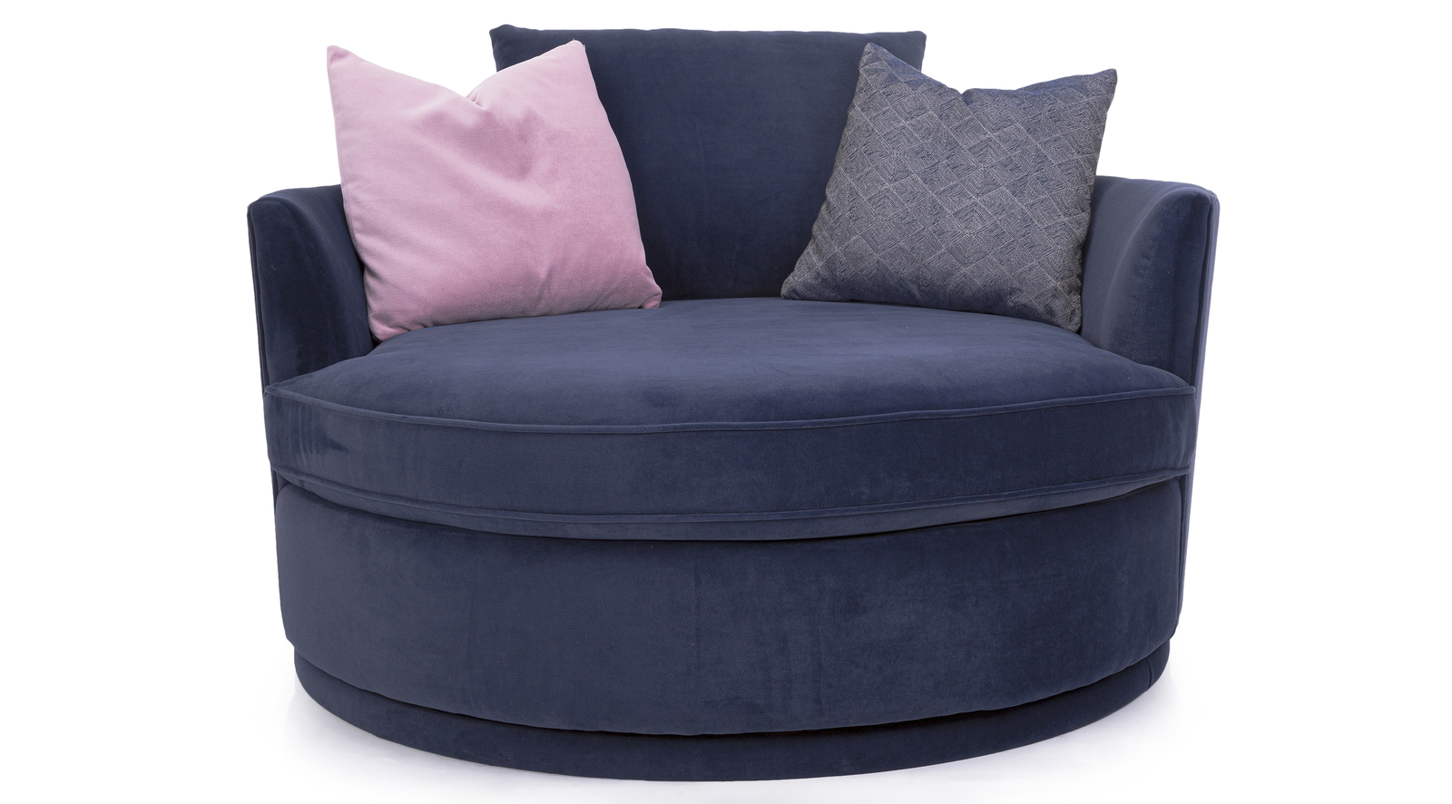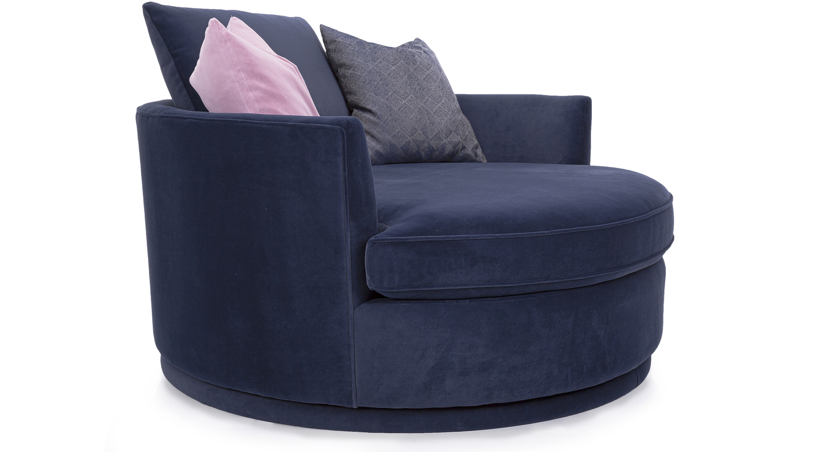 Round out your living room with the contemporary curves of this chair lounger. This inviting swivel chair beckons you to kick off your shoes and snuggle up. A tight barrel back completes the circle with a loss back pillow and several oversized throw pillows.