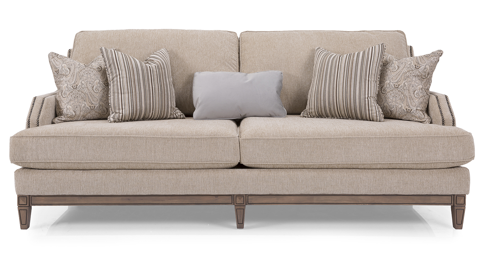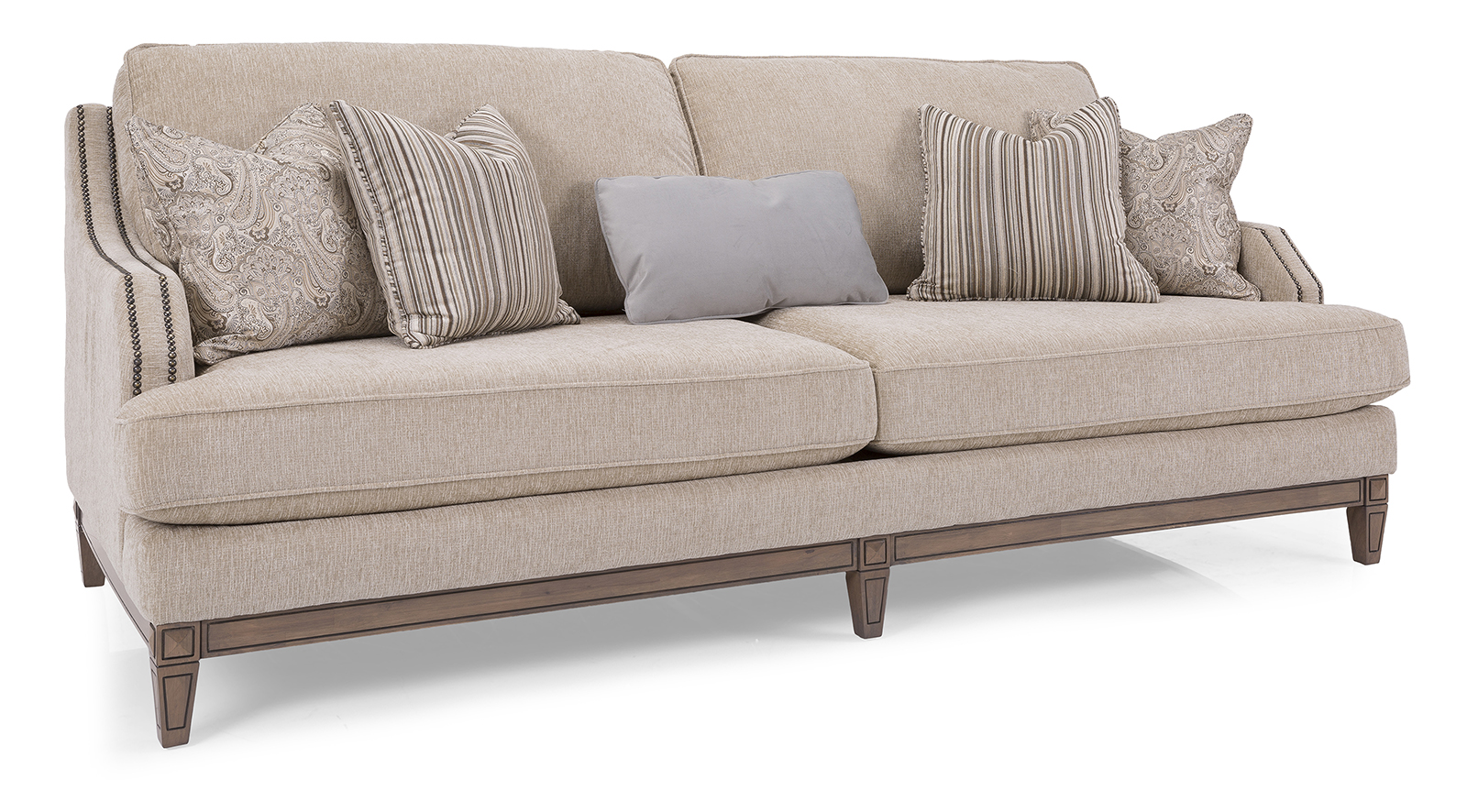 A sofa with many personalities. This beauty can fit easily into a traditional, transitional or glamourous lifestyle depending on the fabrics chosen. Full of refined details such as the double row of nail studs on arms, the engraved wood base and a plethora of pillows.