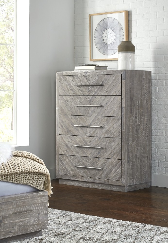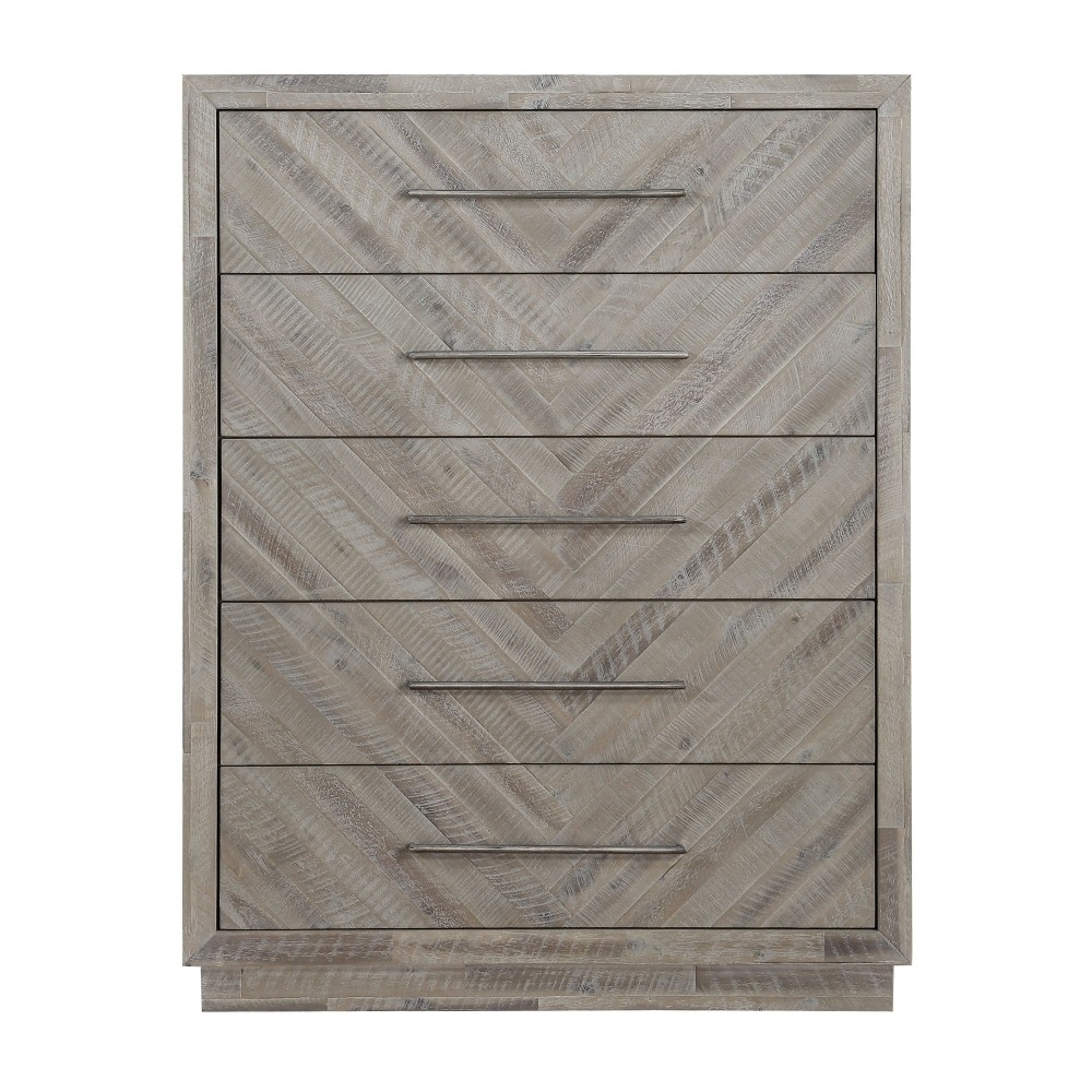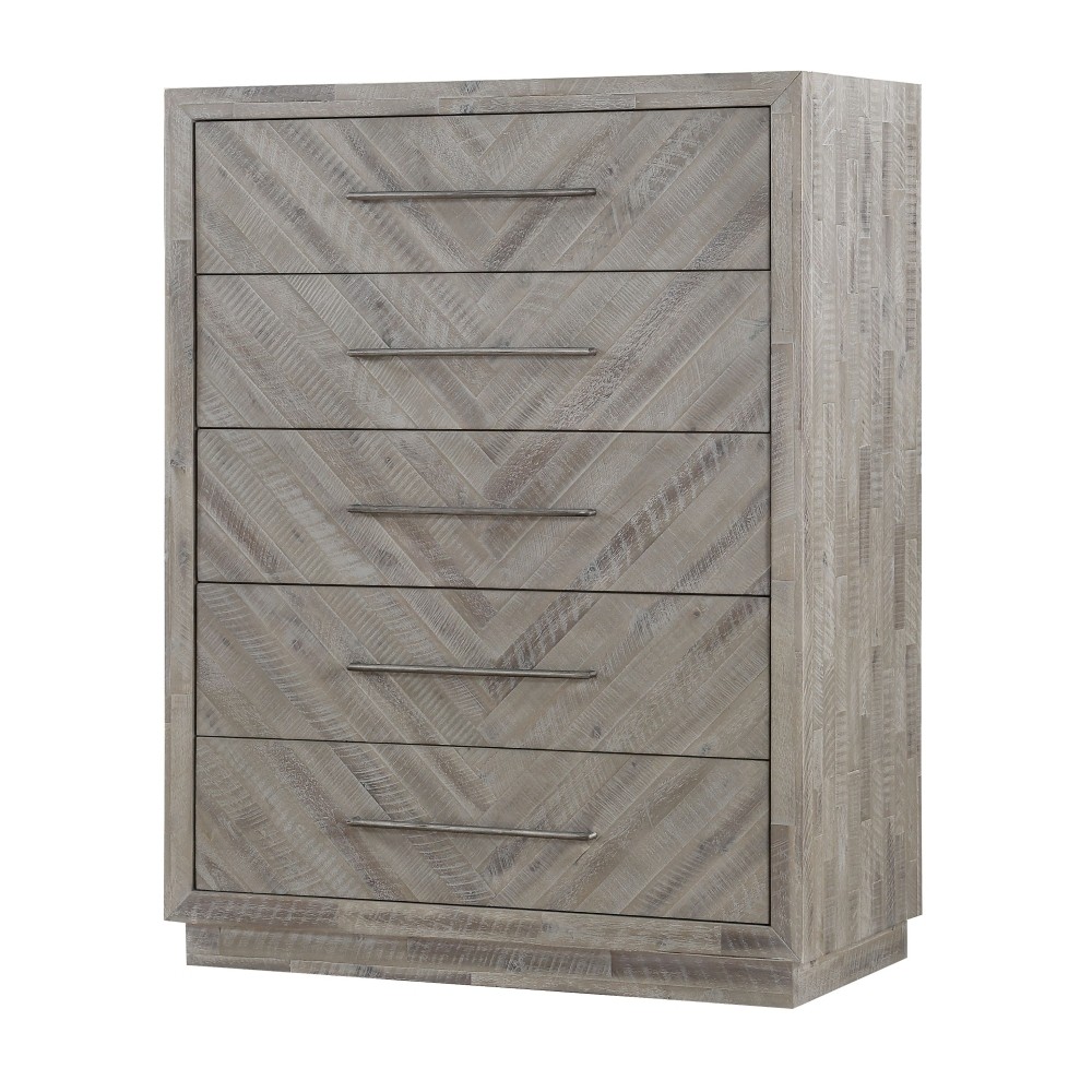 Rustic and contemporary. The Alexandra chest’s appeal comes from the roughhewn Acacia used in its creation. Hand-selected planks of solid wood are carefully sanded, stained and whitewashed for a driftwood appeal that accentuates the active grain and draws out natural knots and markings from the milling process. They are then inlaid over plywood to create a handsome herringbone pattern and finished with thin metal bar pulls for the crowning contemporary touch.