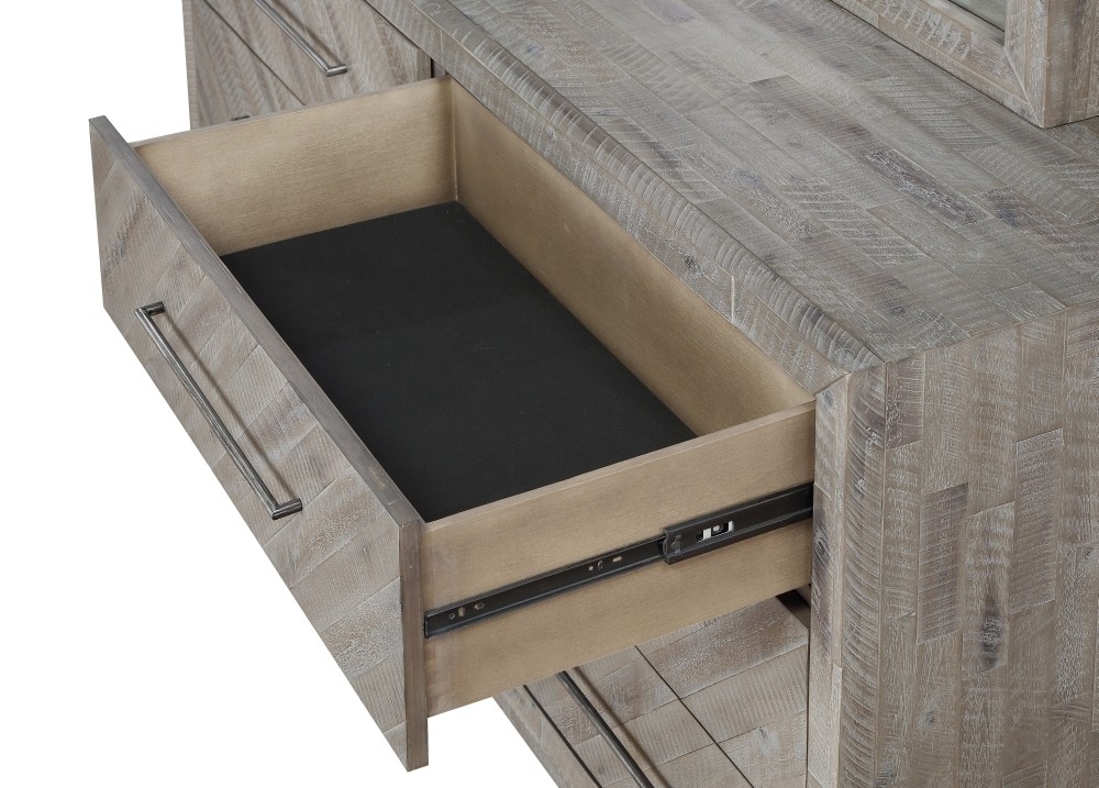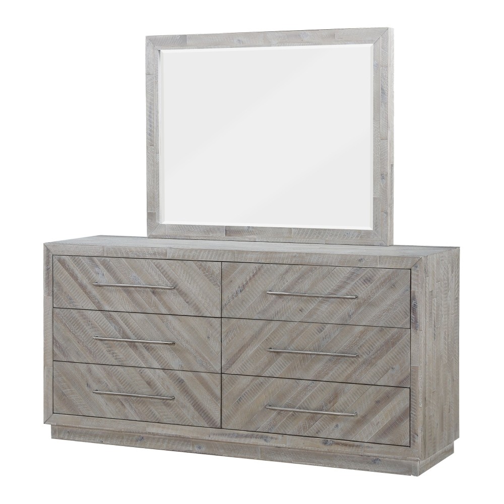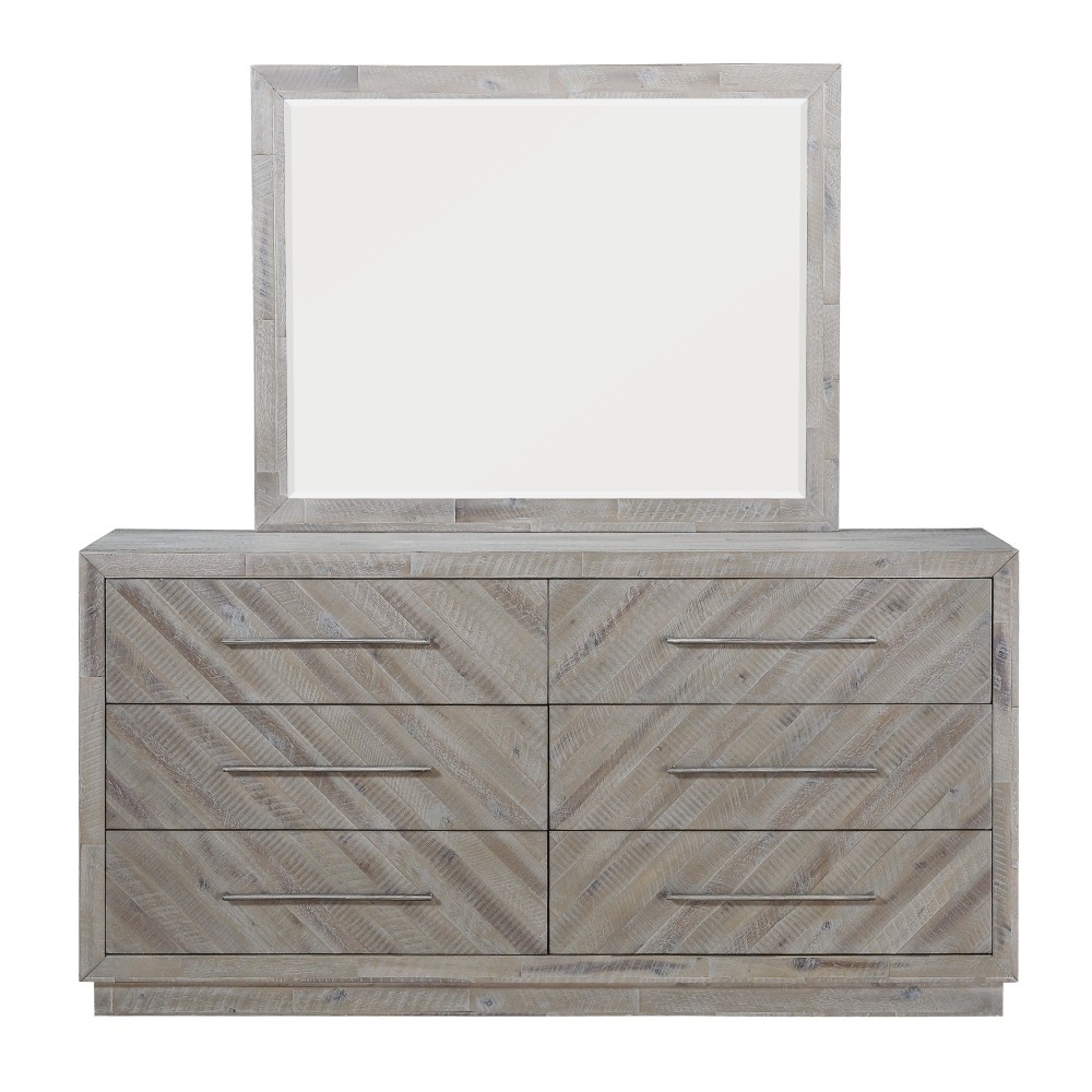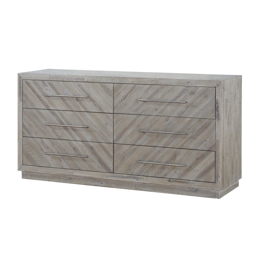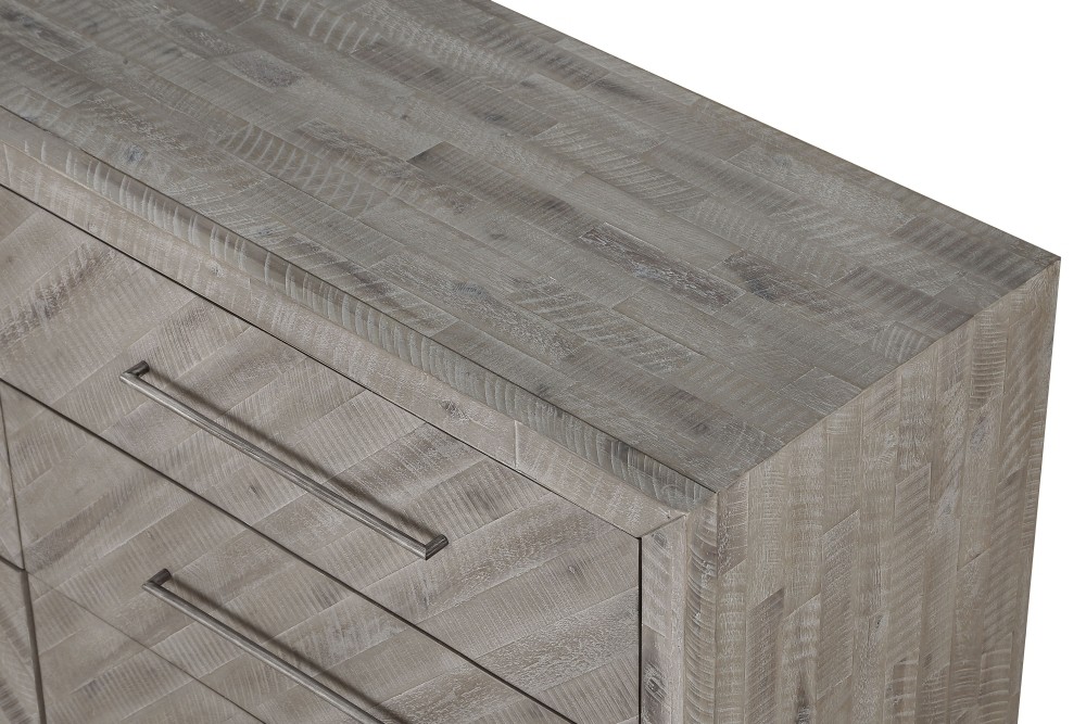 Rustic and contemporary. The Alexandra dresser’s appeal comes from the roughhewn Acacia used in its creation. Hand-selected planks of solid wood are carefully sanded, stained and whitewashed for a driftwood appeal that accentuates the active grain and draws out natural knots and markings from the milling process. They are then inlaid over plywood to create a handsome herringbone pattern and finished with thin metal bar pulls for the crowning contemporary touch.