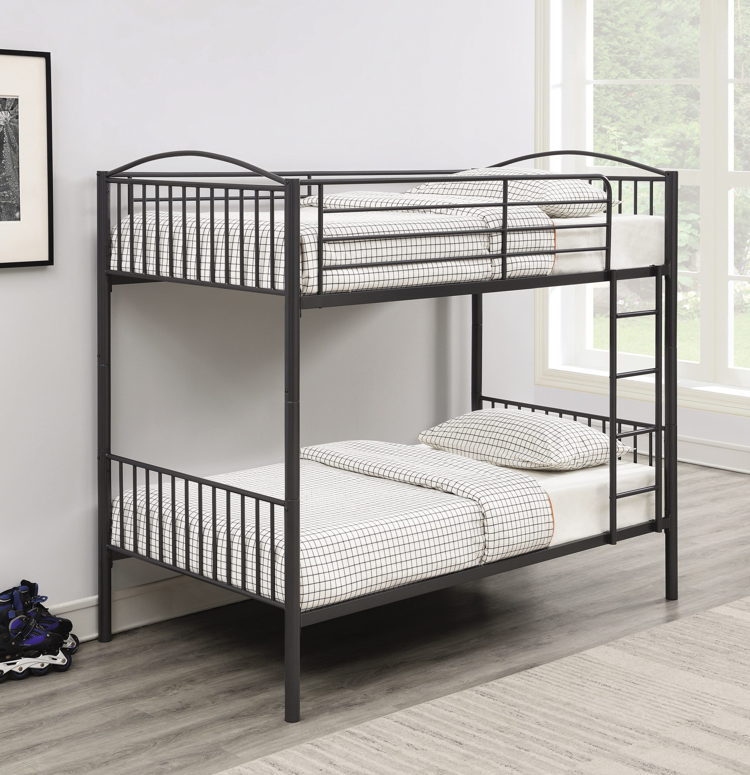 - Embrace modern design with this twin over twin heavy gauge steel bunk bed
