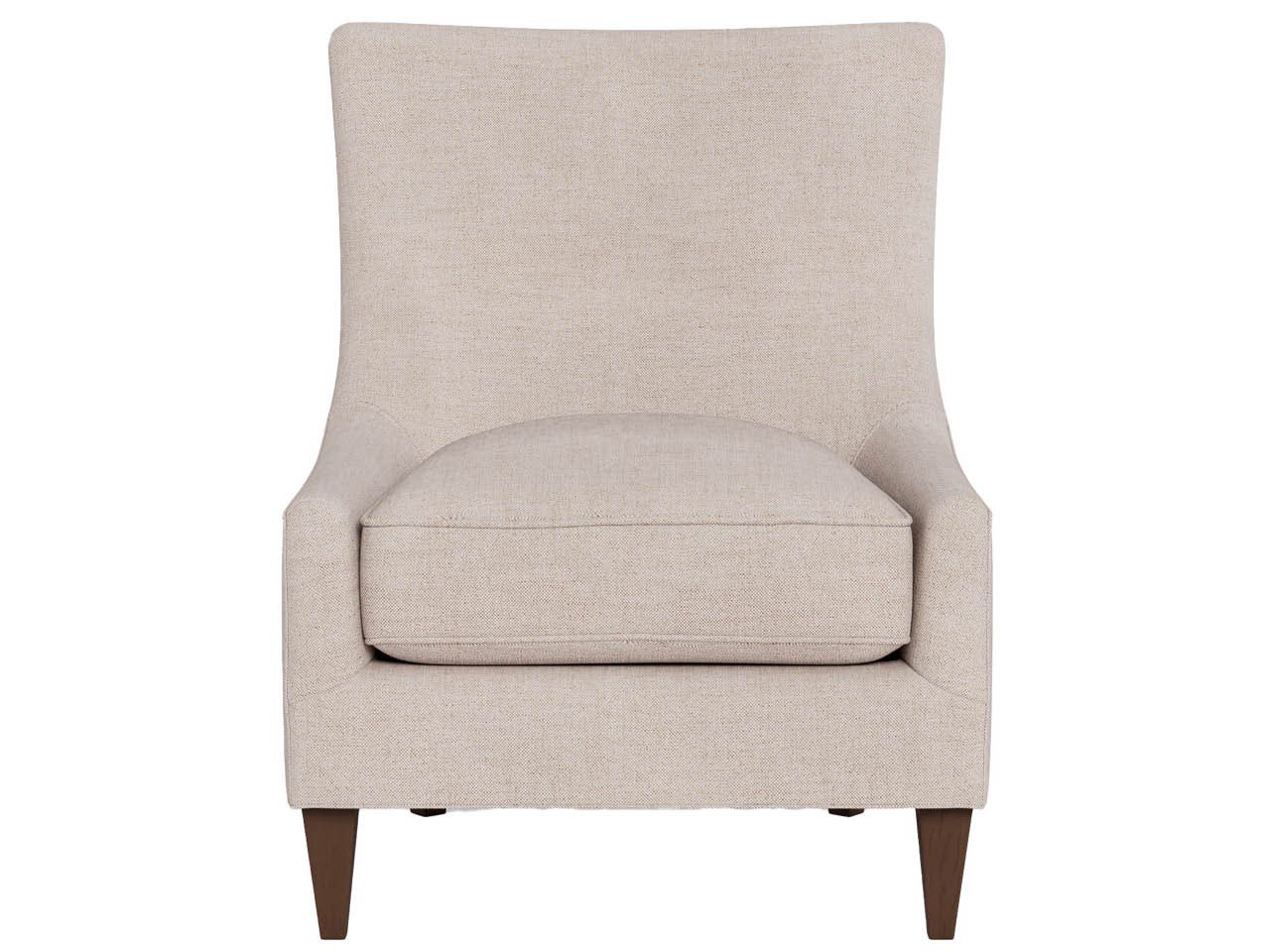 The Avery Chair exudes a refined simplicity, featuring a tall, slightly curved back accented by a plush seat cushion and tapered legs.