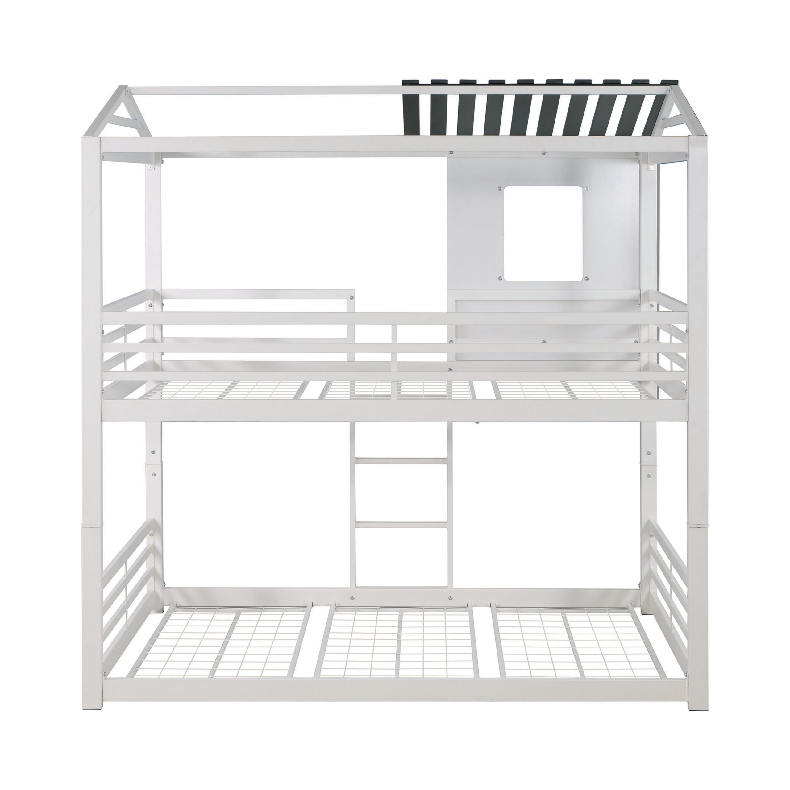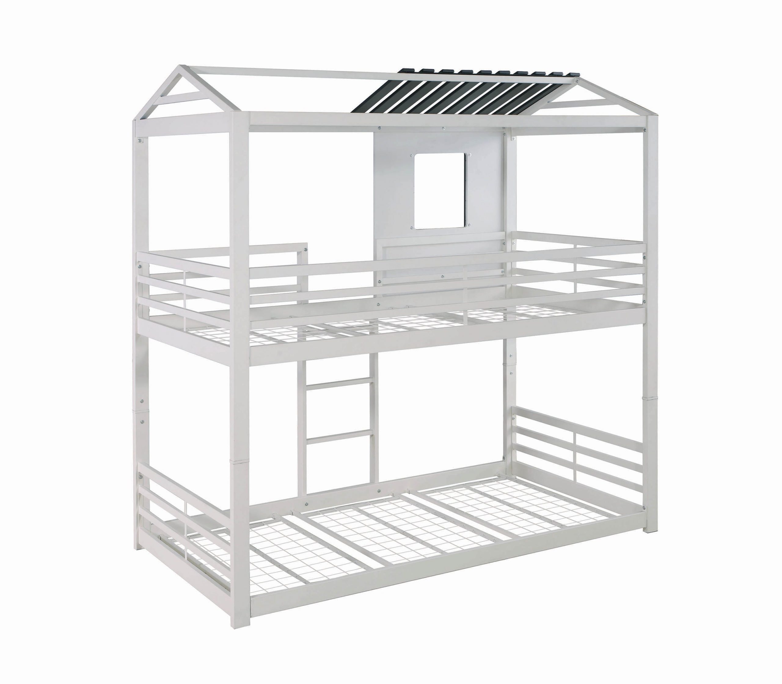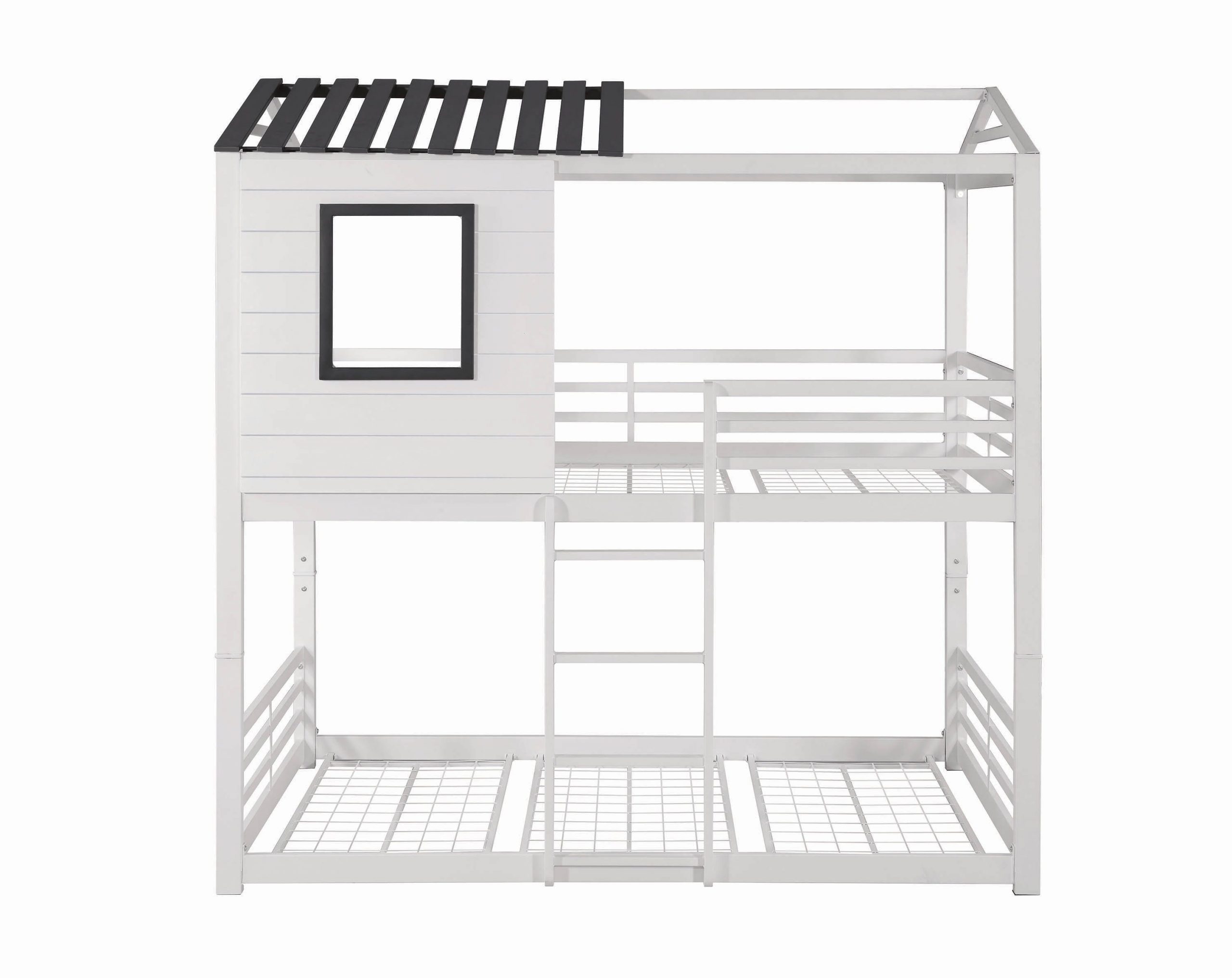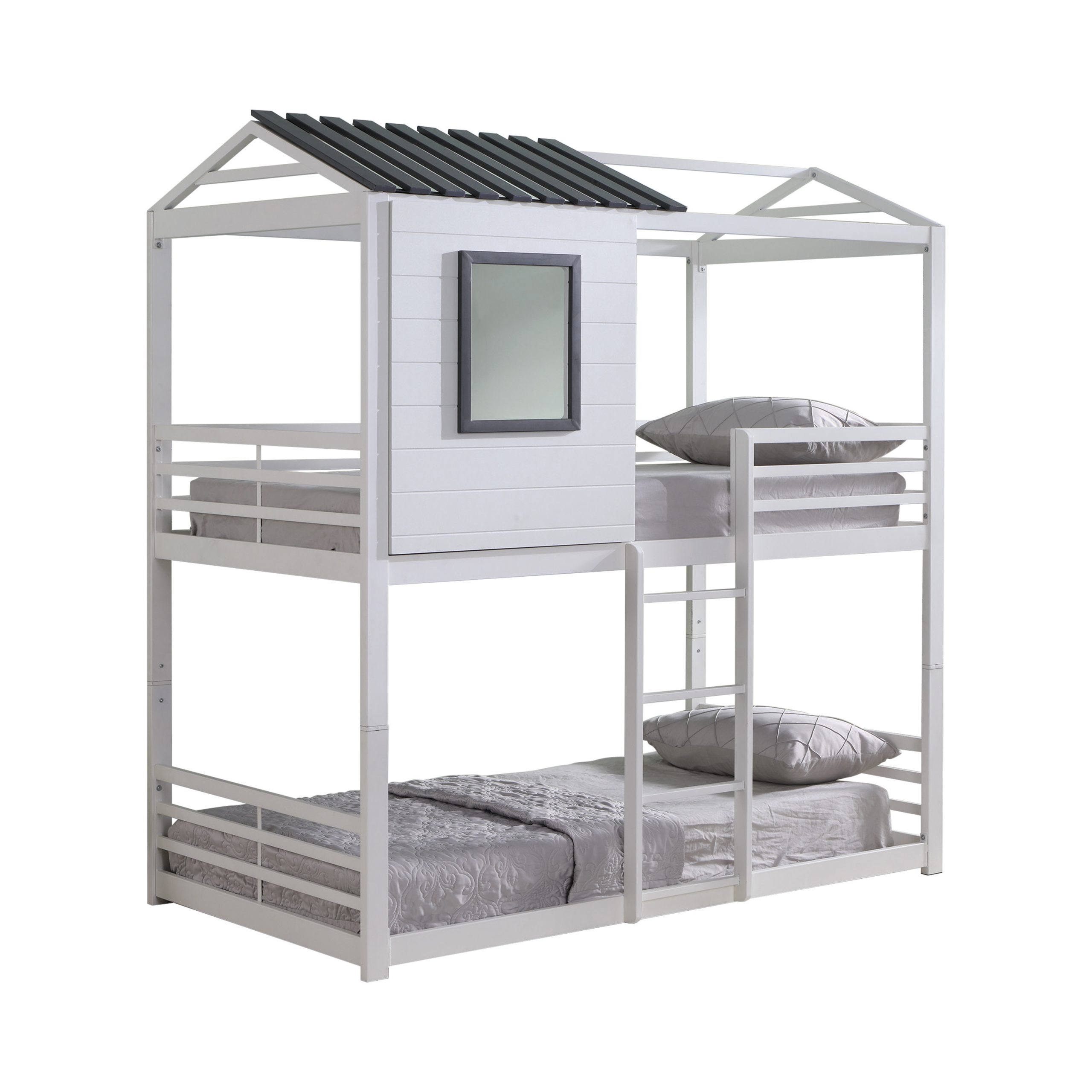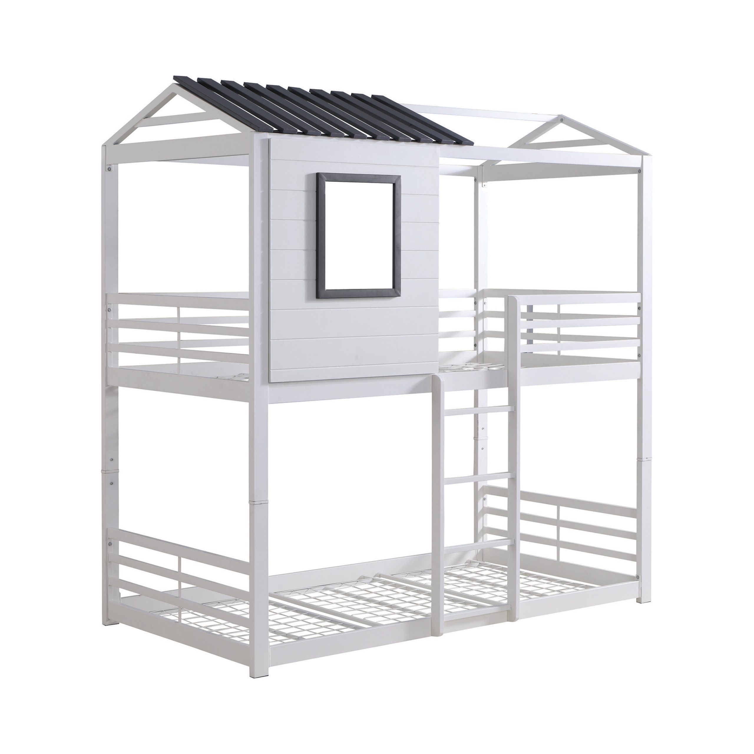 Decorate a child’s room with the playful features on this white bunk bed. Treehouse-inspired, the frame is designed with safety in mind as the bottom bunk rests on the floor while the top bunk is housed by an open panel. Adorned with grey details, the neutral colors look great in any space. Twin sized mattresses and a ladder running down the middle creates extra support for the bottom bunk. Dress up any shared room with the crisp and clean look.