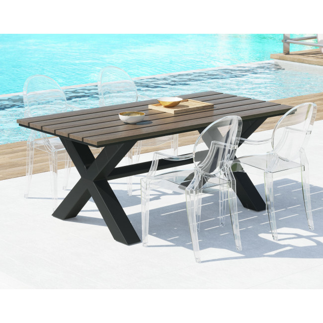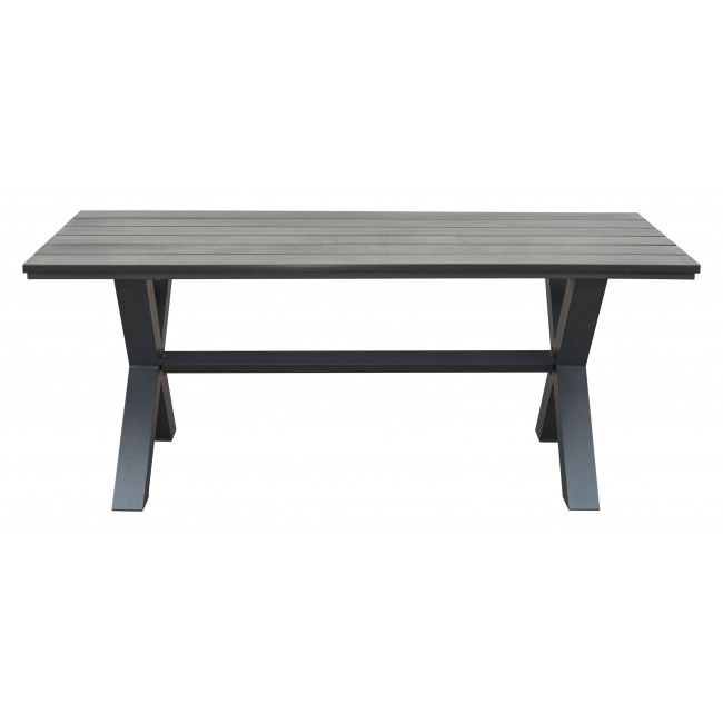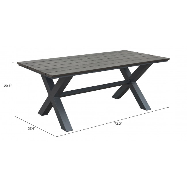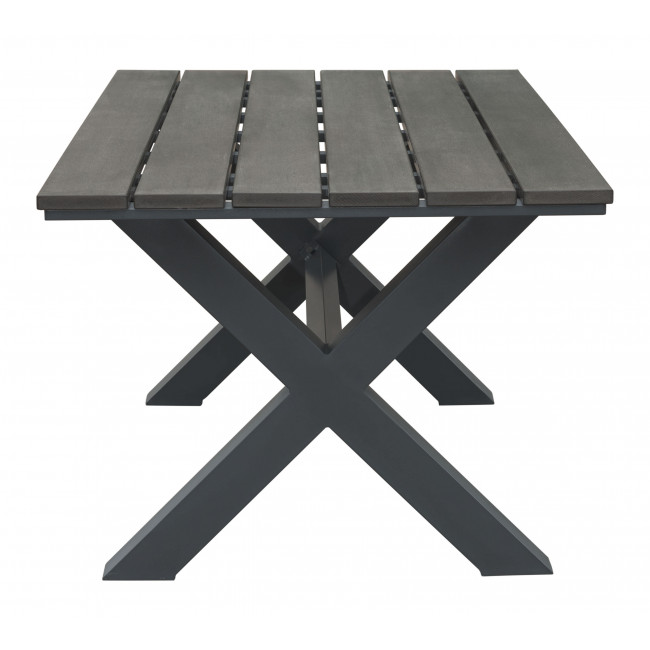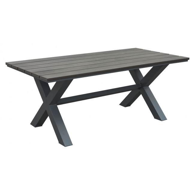 This industrial table with its classic X style base and plank style top is a great choice for casual outdoor dining. Made of weather-resistant faux wood in brown with a distressed grey wash overlay. Complete with natural grain texture its perfect for the great outdoors. Collection includes dining table and bench. Sold separately.
