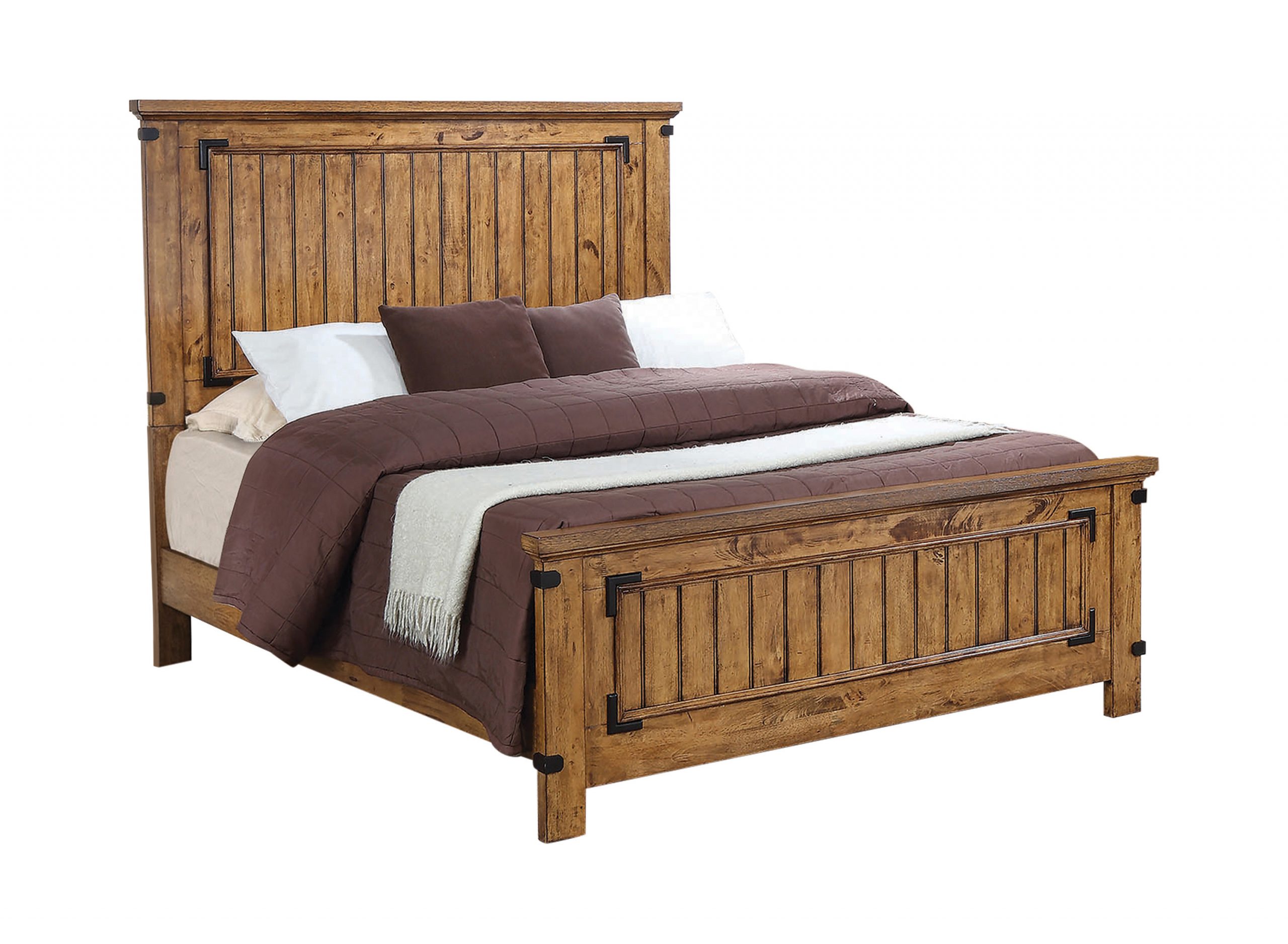 The Brenner collection brings you this countryside-inspired bed. It features elegant bucolic styling and classic clean lines. Both the imposing headboard and low footboard are built with handsome vertical paneling. The bed is finished in rustic honey with contrasting wood grain accents for a rustic appeal. This bed is perfect for a home with a pastoral, picturesque character.