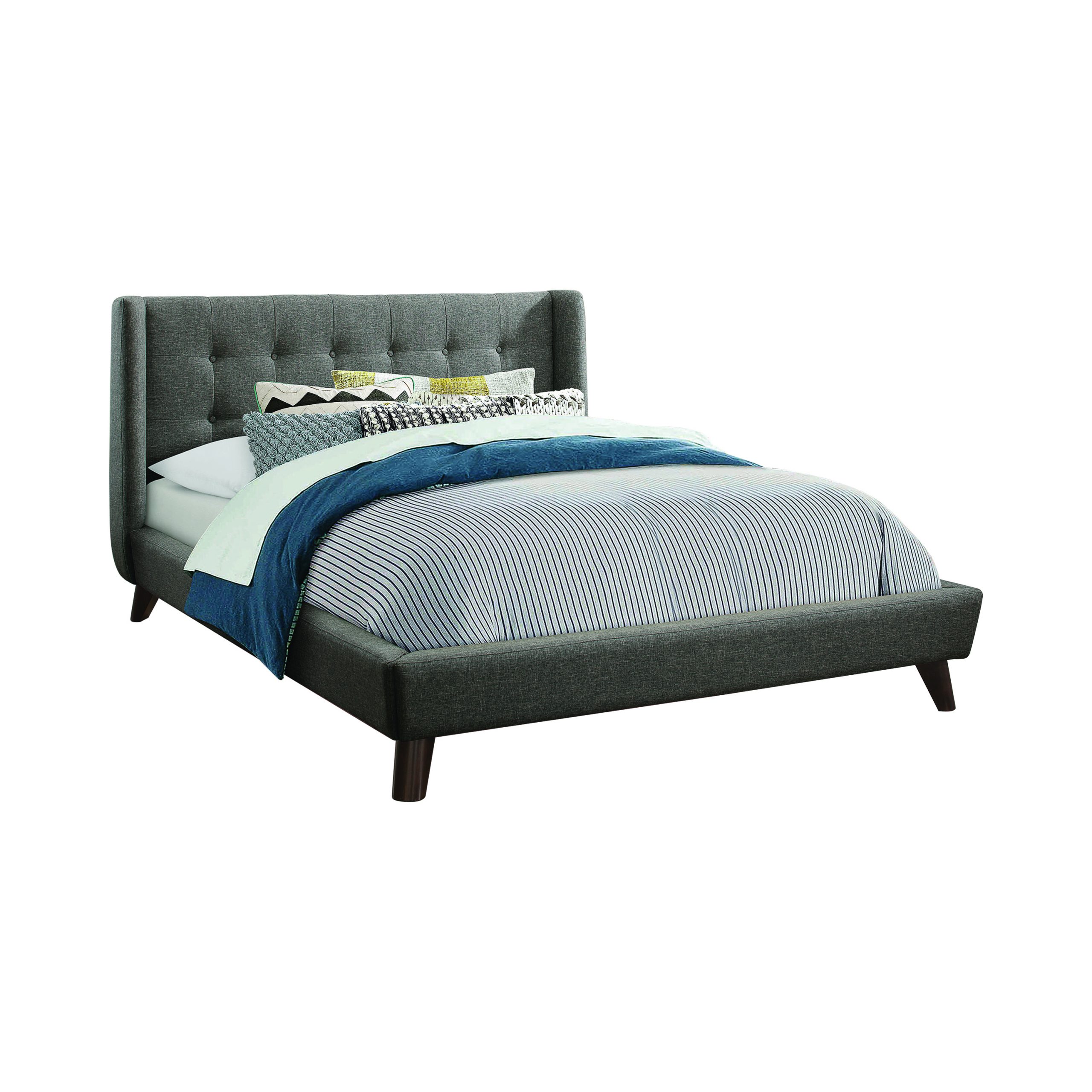 Go all-in on a retro motif with this mid-century modern-inspired bed frame. In a textured grey upholstery, the frame is soft and welcoming. Subtle button tufting along the low headboard adds chic glamour to the craftsman’s-like style. Full of structure, the headboard frames the streamlined silhouette. Angled and tapered, the wooden legs warm up a variety of decor schemes.