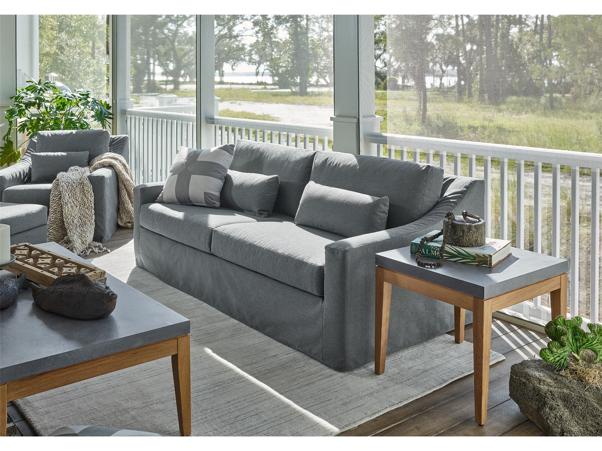 Perfect outdoor living spaces with the Chesapeake End Table, showcasing a smooth gray stone top which is offset by a natural wooden base.