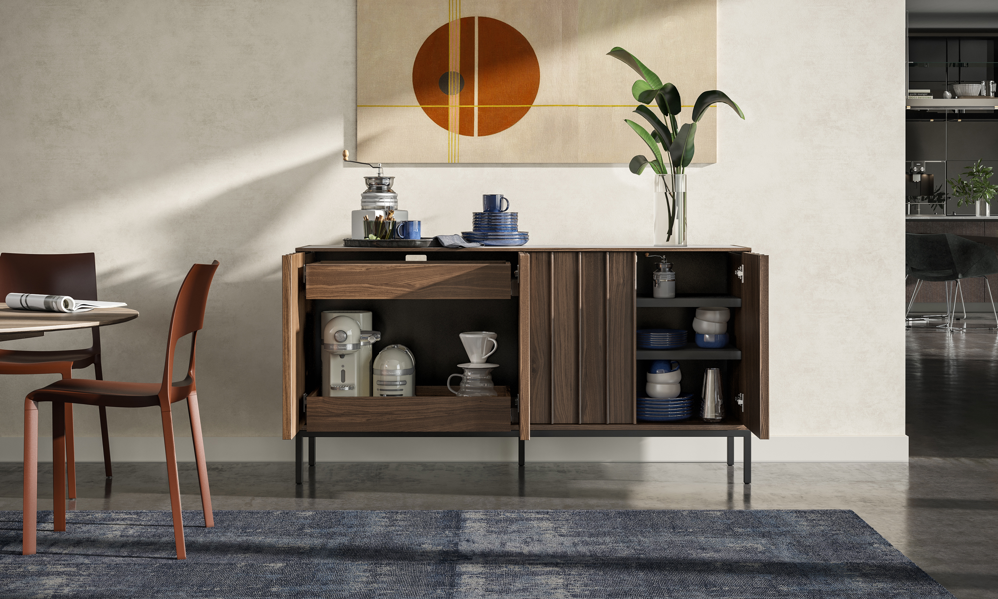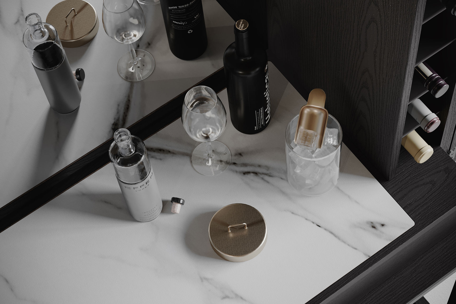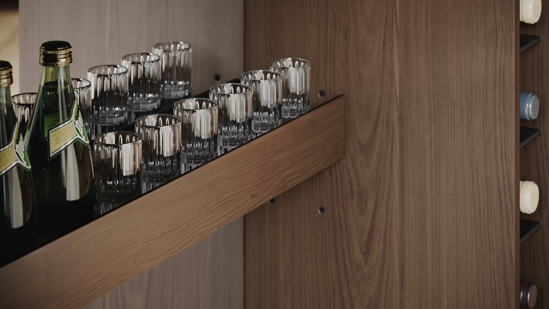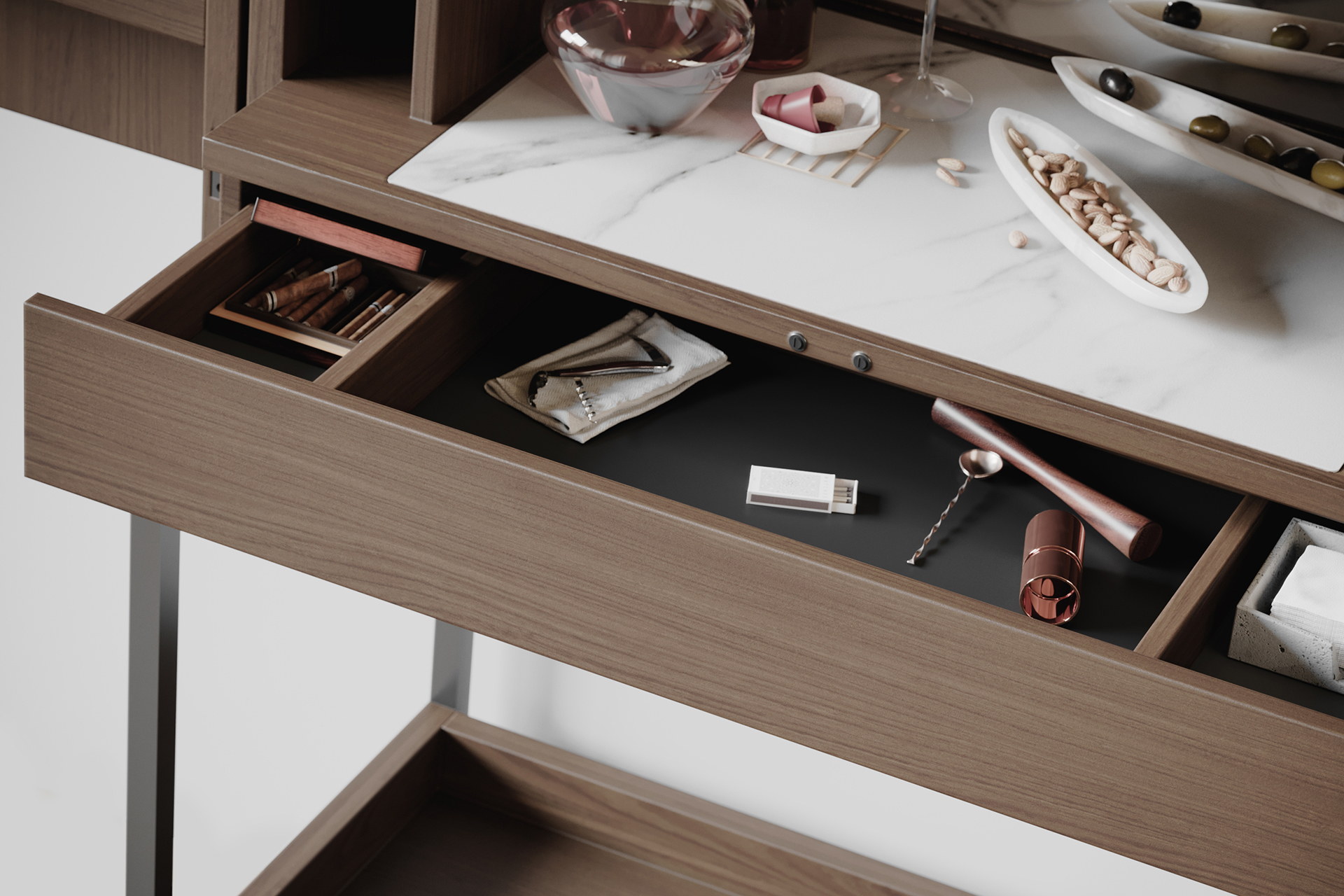 Refined and full-featured, Cosmo serves up a host of bar storage that can be neatly concealed when the good times come to an end.