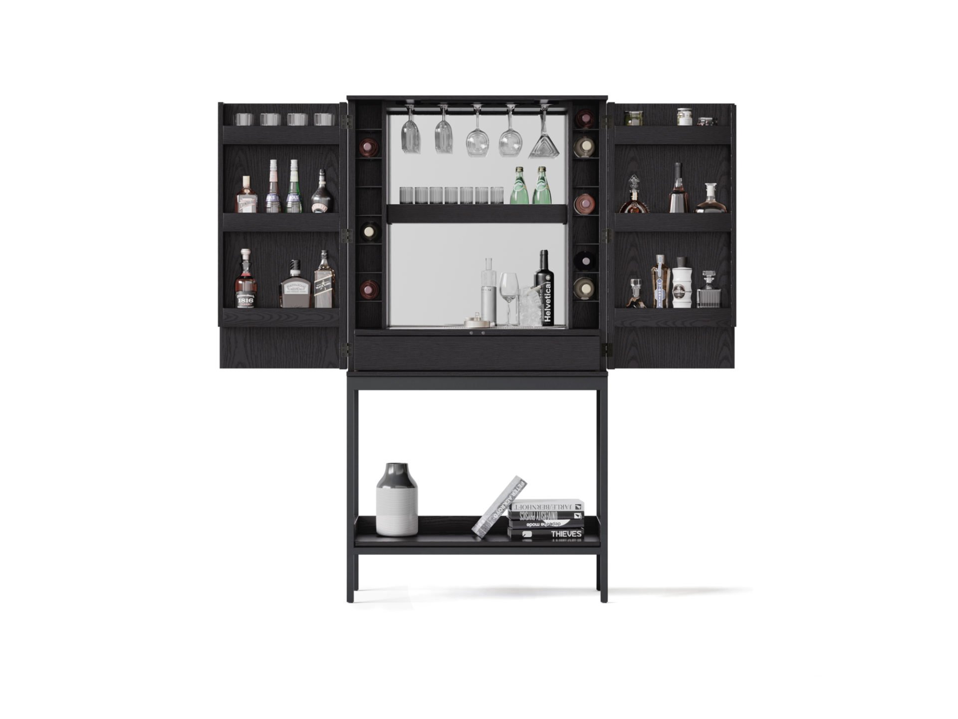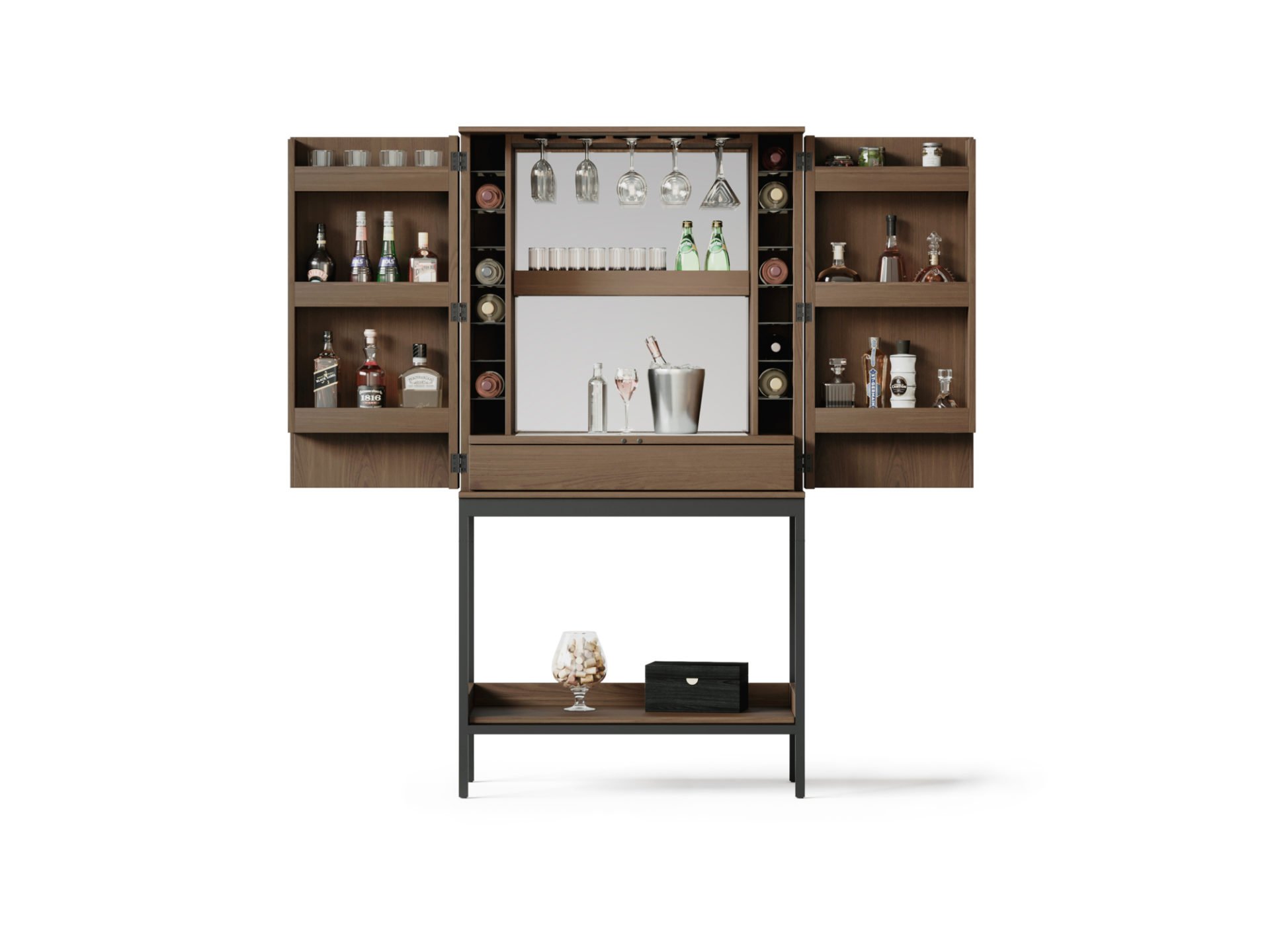 Refined and full-featured, Cosmo serves up a host of bar storage that can be neatly concealed when the good times come to an end.