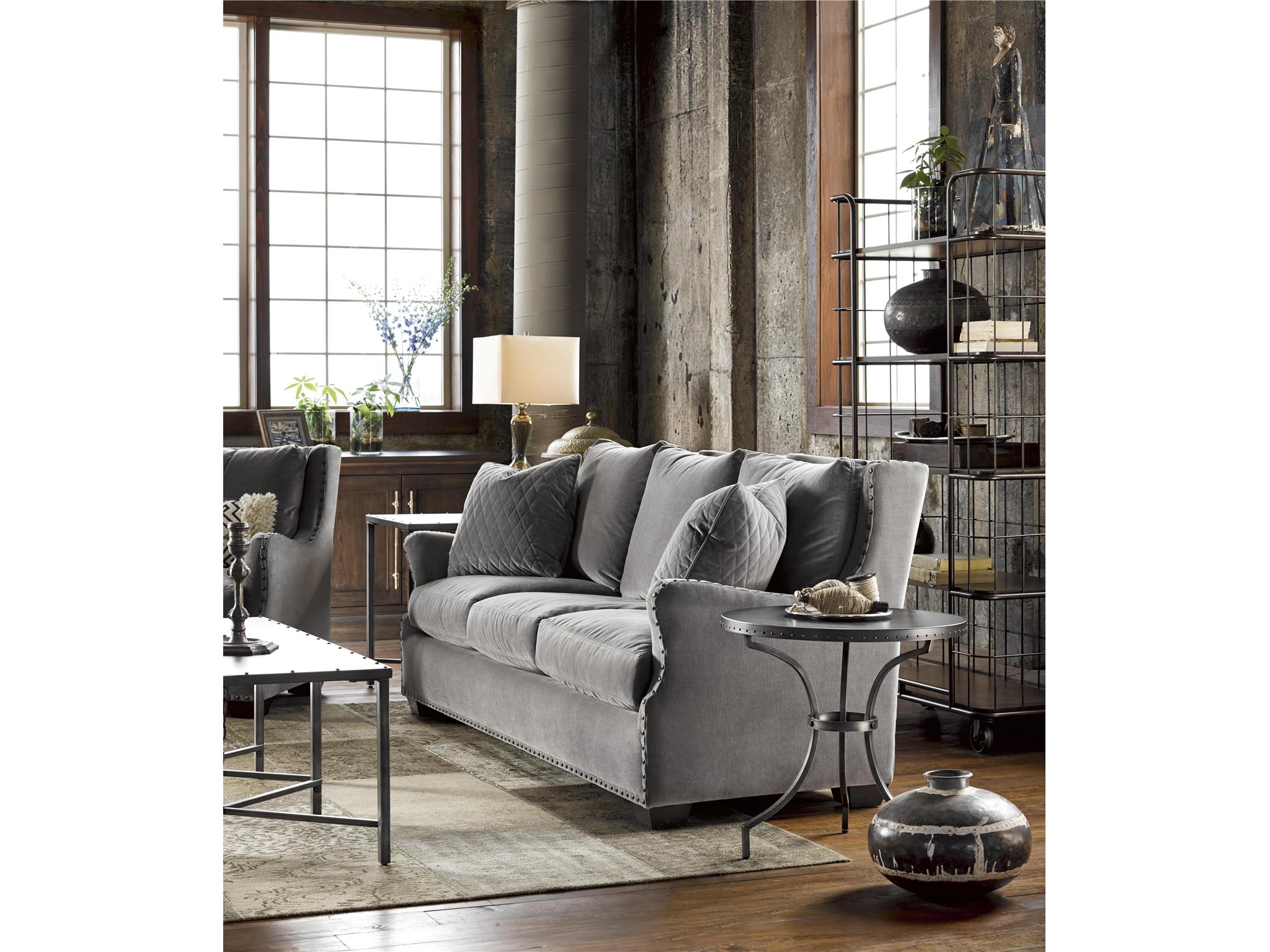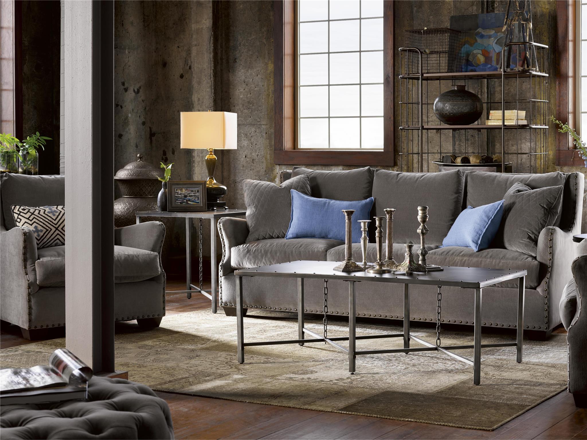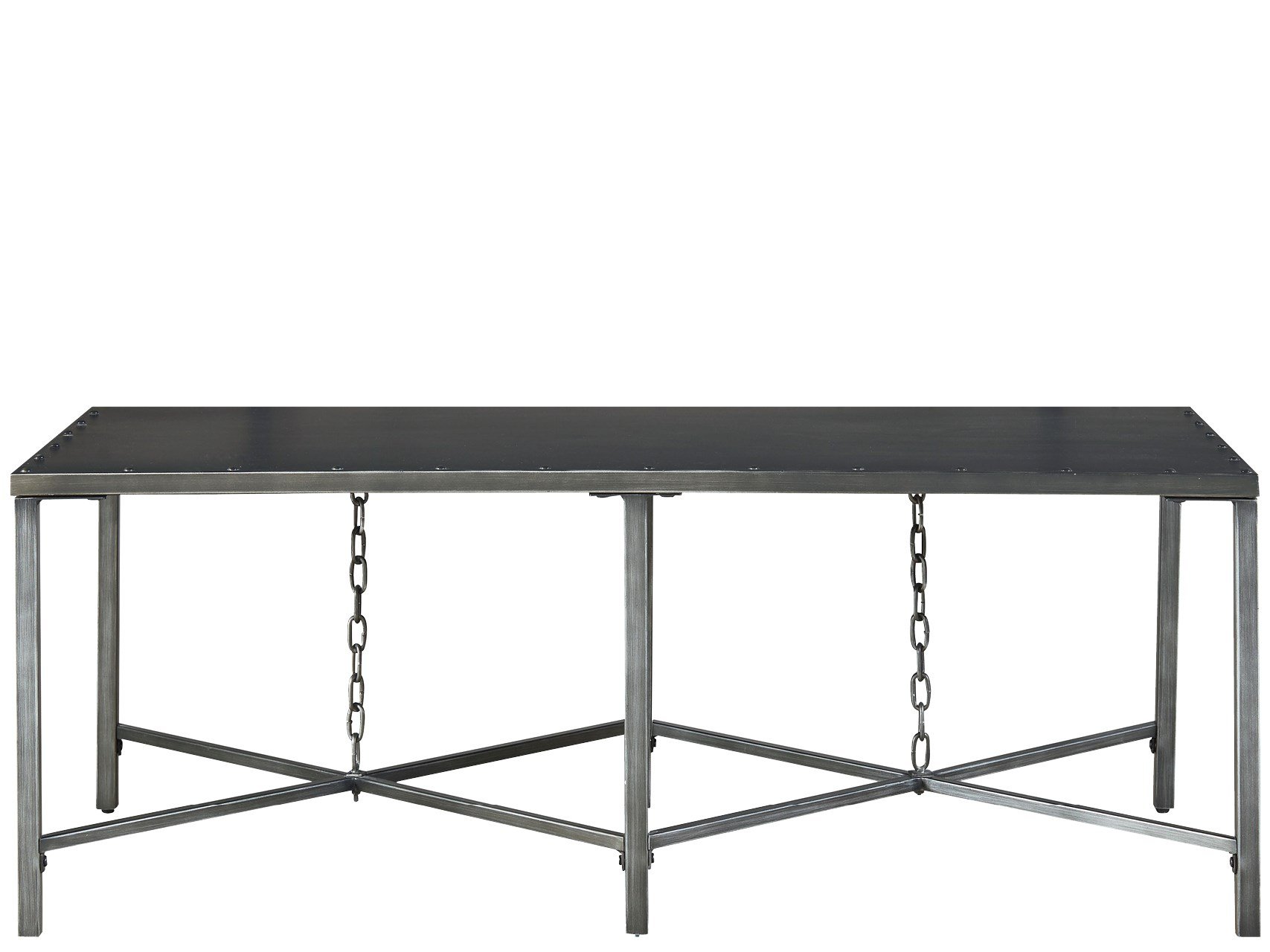 The Eliston Cocktail Table embodies industrial style at its best, with metal surfaces finished in Antique Pewter, a sturdy nail head trim, and an impeccably placed chain detailing.