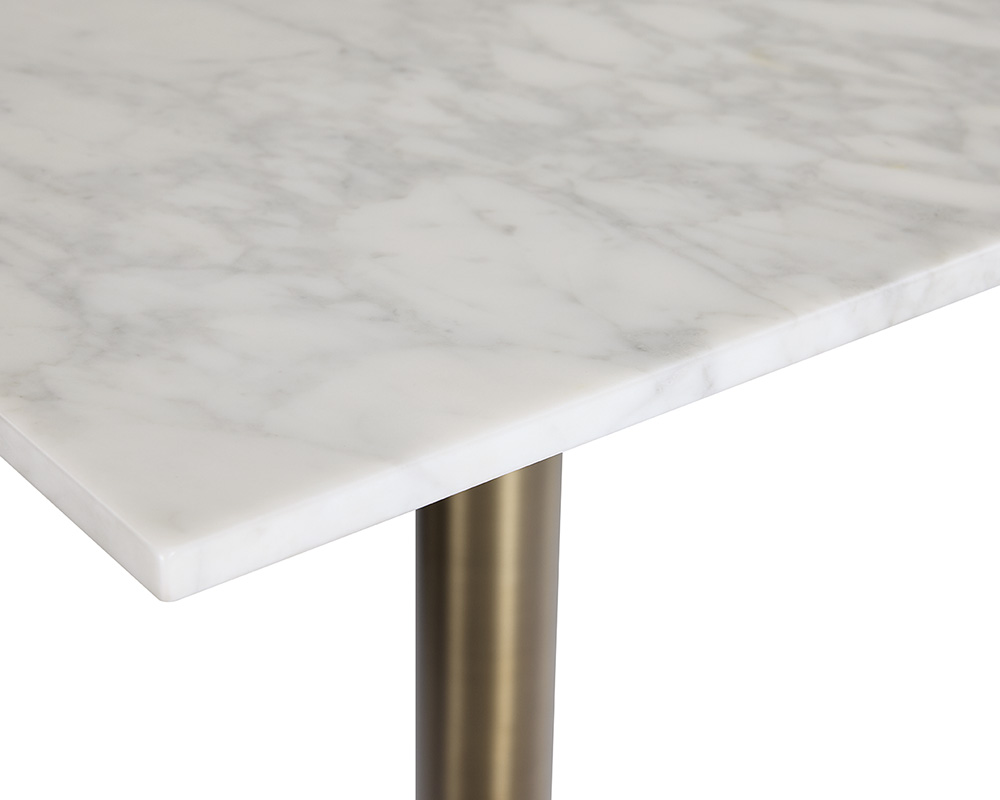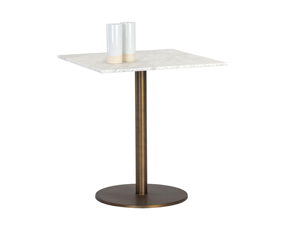 An Art Deco inspired square bar table, featuring a solid carrara marble top with an antique bronze steel base. Perfect for bars, lounges and restaurants. Also available in a round version. As marble is a natural material, unique veining, pitting, fissures, micro-cracks and colour variations are all characteristics that add to the uniqueness and beauty of each piece.