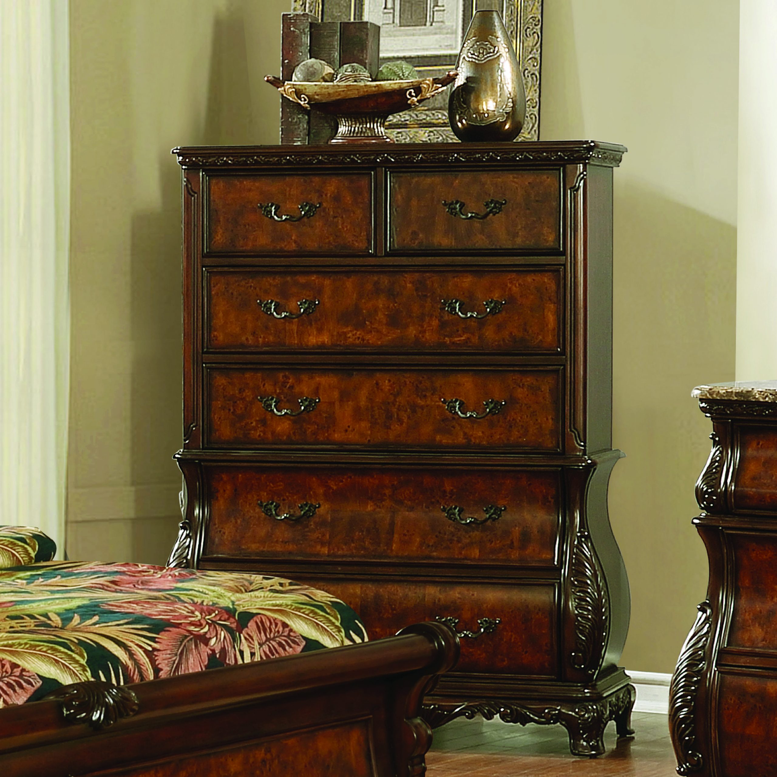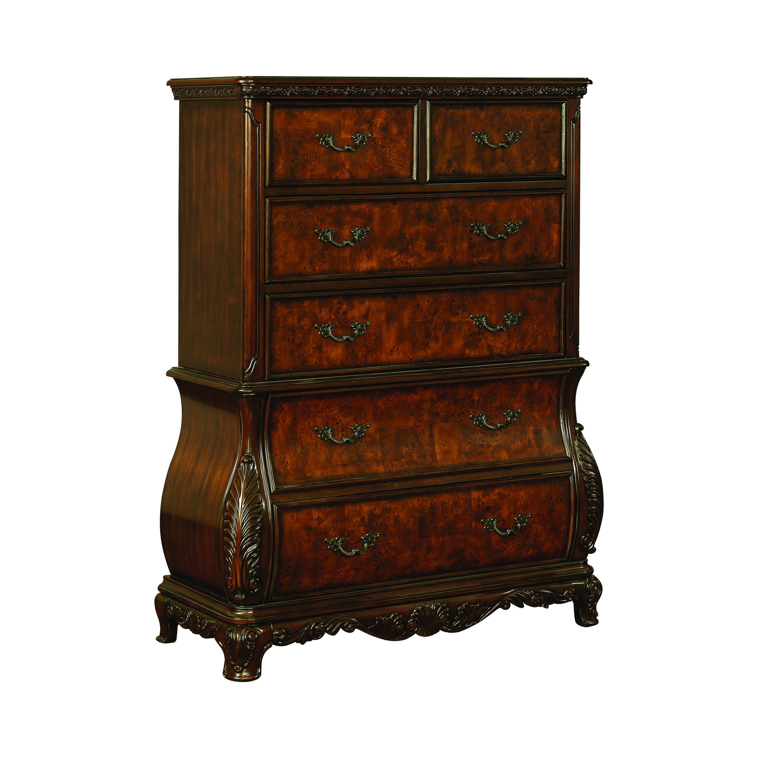 Inject Old World inspiration into your bedroom with this lovely six drawer chest from the Exeter collection. This traditional chest features ornate details and a dark burl finish that shows off the ripples in the wood beneath. Two small top drawers are anchored by four larger ones beneath, offering plenty of options for neatly arranging your clothing and accessories. This bombe shaped chest is an artfully crafted furniture piece, sure to delight even the most discerning taste. Would make a perfect addition to a Mediterranean theme bedroom, or even a handsome accent in a traditional study.