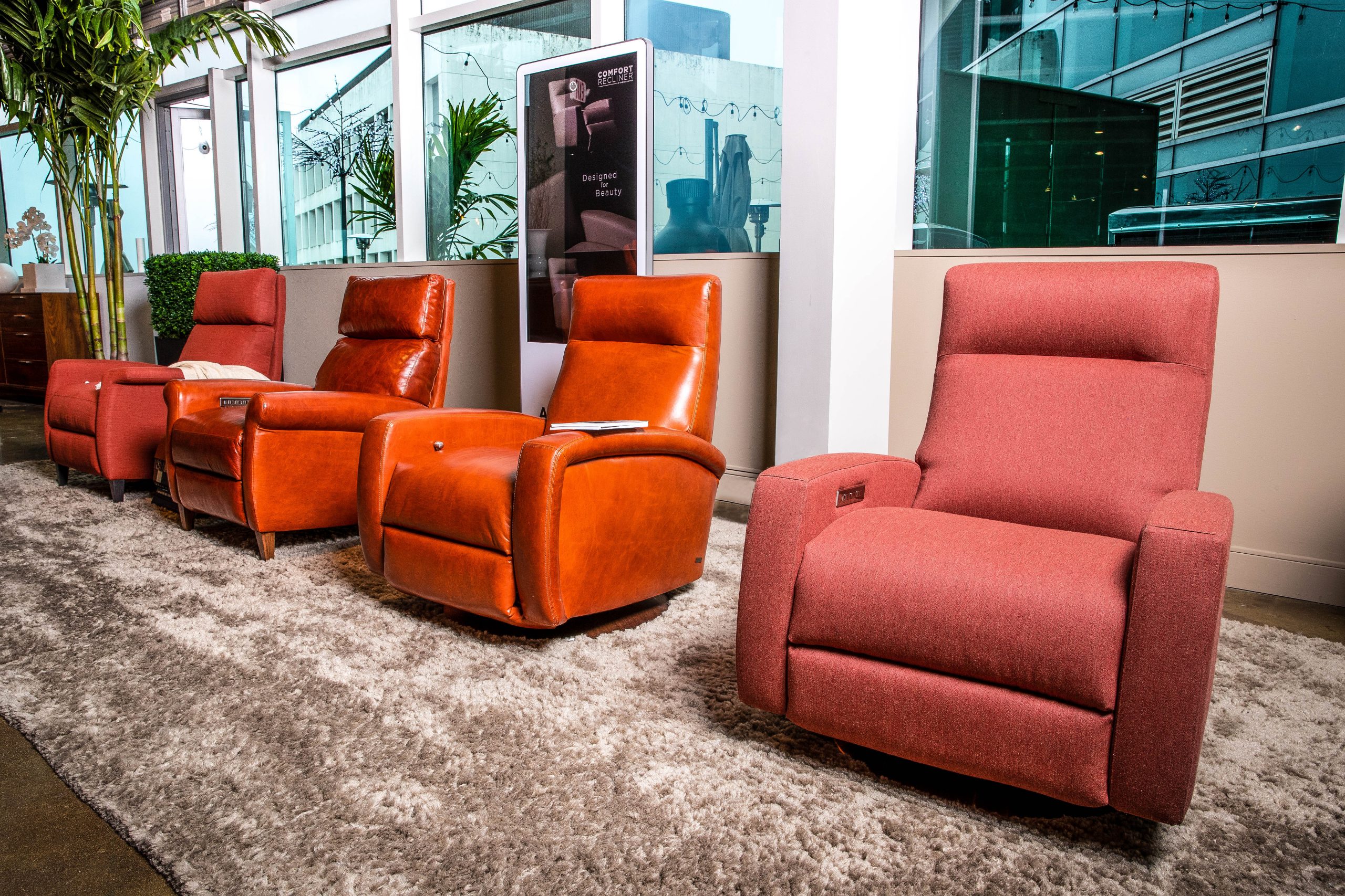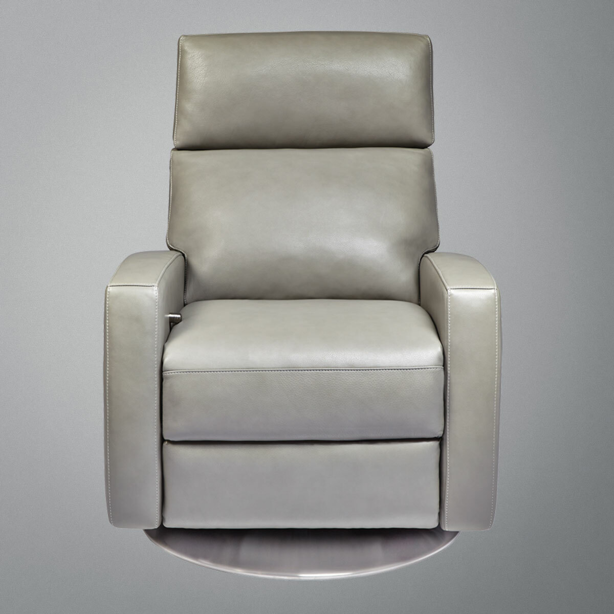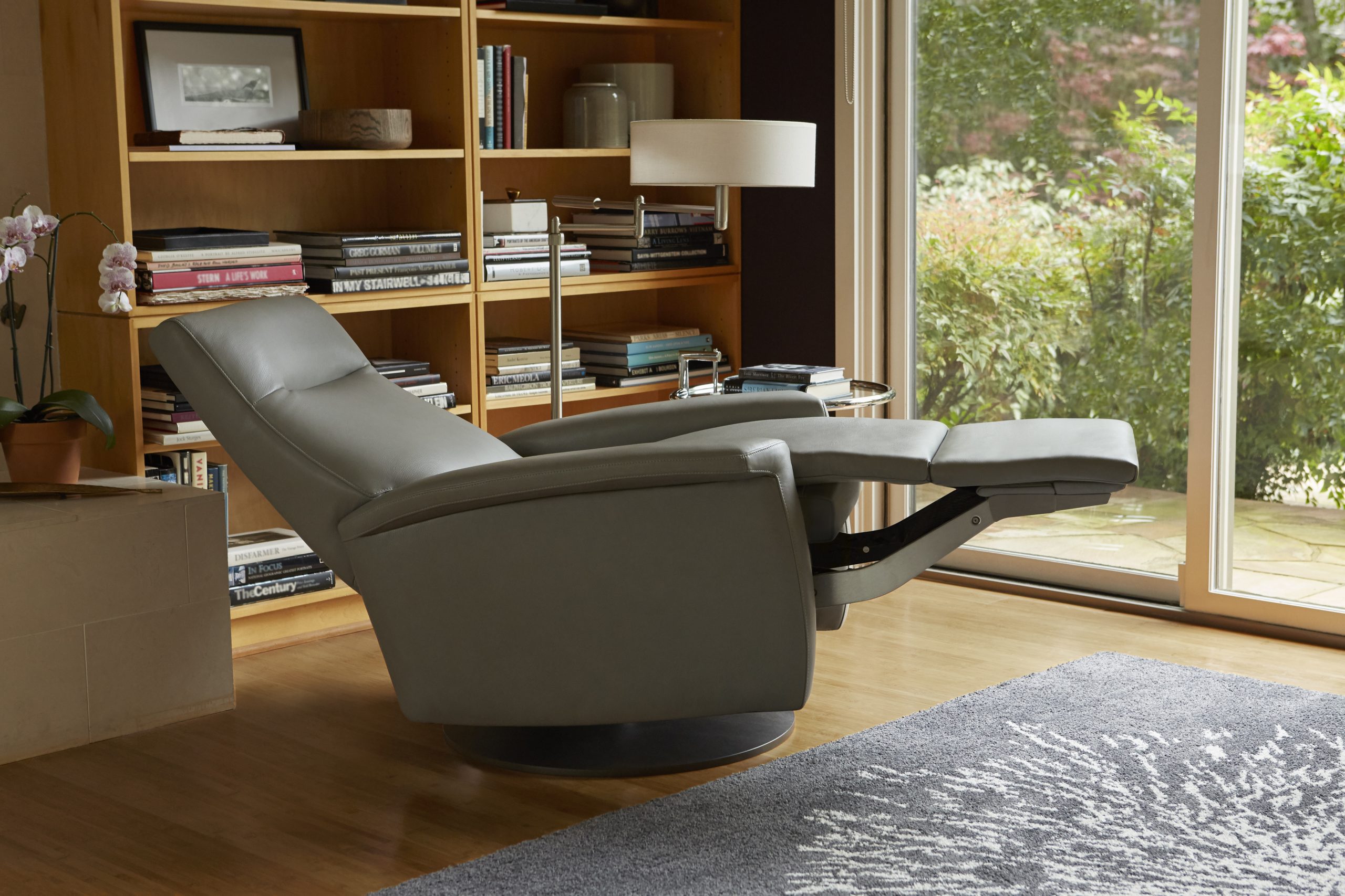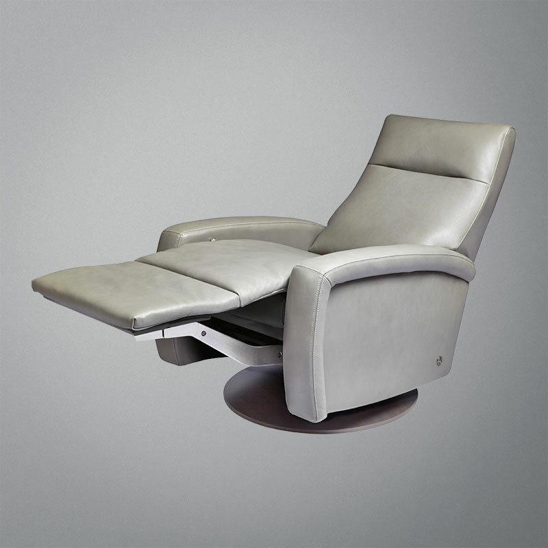 With thin arms that gently angle back, the Fallon is just as fierce as it is comfortable. The Fallon is available in two sizes and features a patented reclining mechanism, providing the ultimate in comfort. The back and footrest operate independently to provide a perfectly customized relaxation experience. Make the Fallon yours by selecting a Brushed Metal swivel-base or a solid wood base available in Gray Ash or Natural walnut. You can also select stationary wooden legs available in either Gray Ash or Natural Walnut