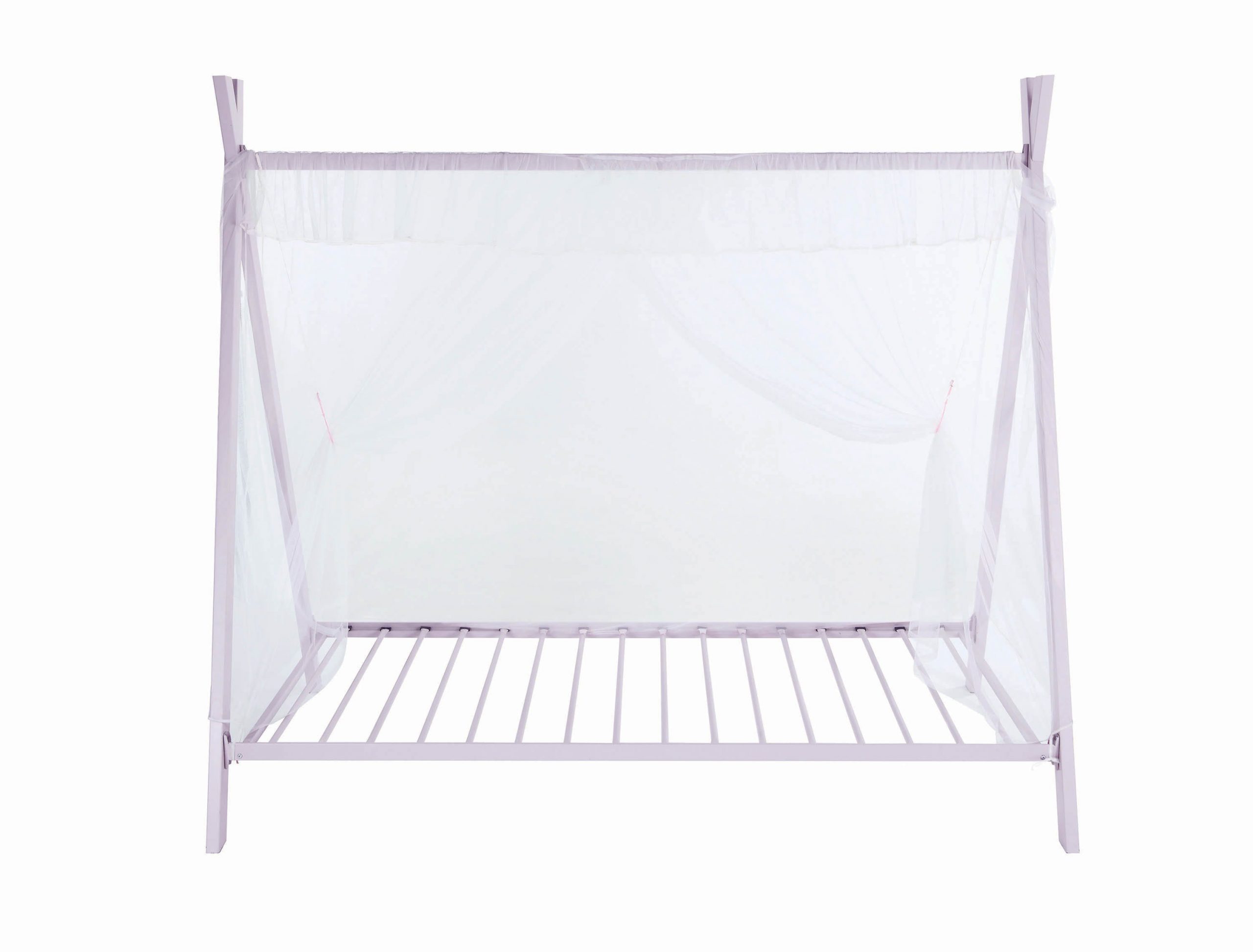 Create a playful aura in a child’s room with this twin tent bed. The silhouette is full of elongated metal lines that crisscross to create a modern tent shape. Complete the charming contemporary style with a crisp pink finish and thin fabric details. Angled legs add depth to the center or corner of a room. Create an up-to-date spin on rustic charm with the soft, bright hues and fun shape.