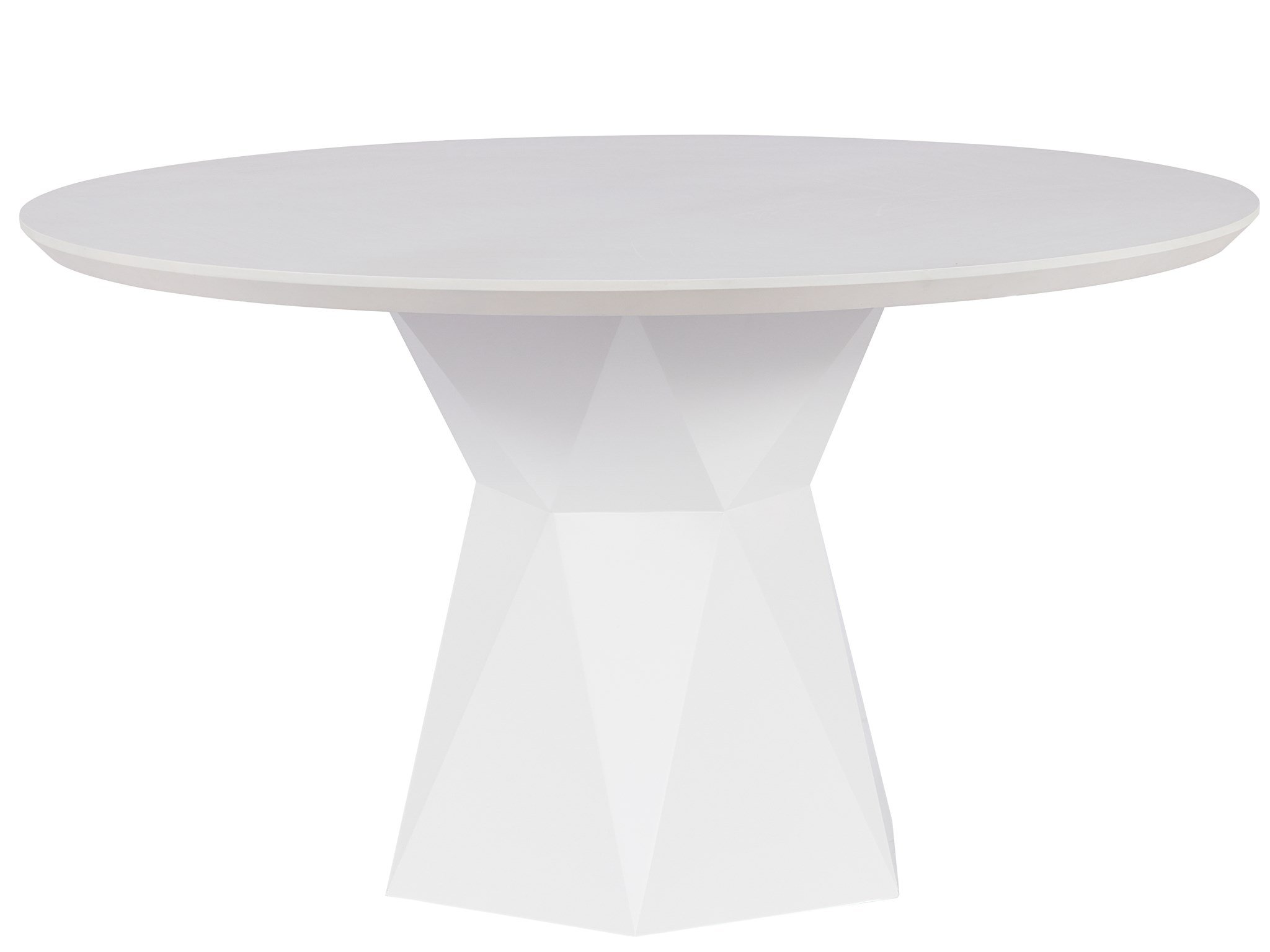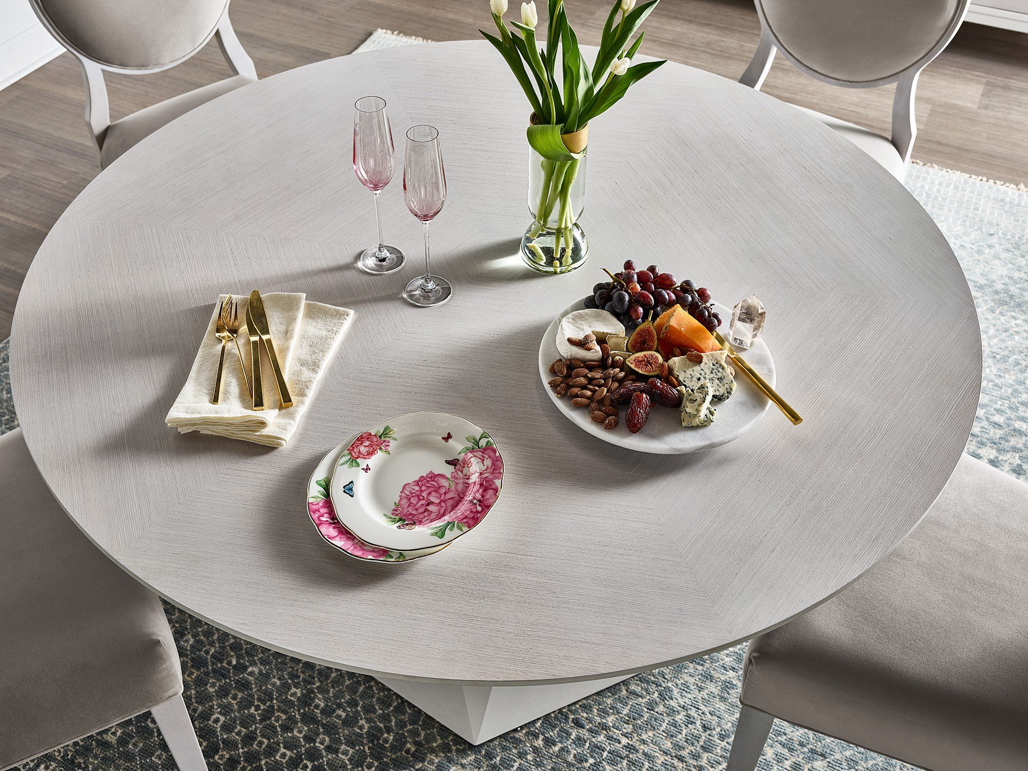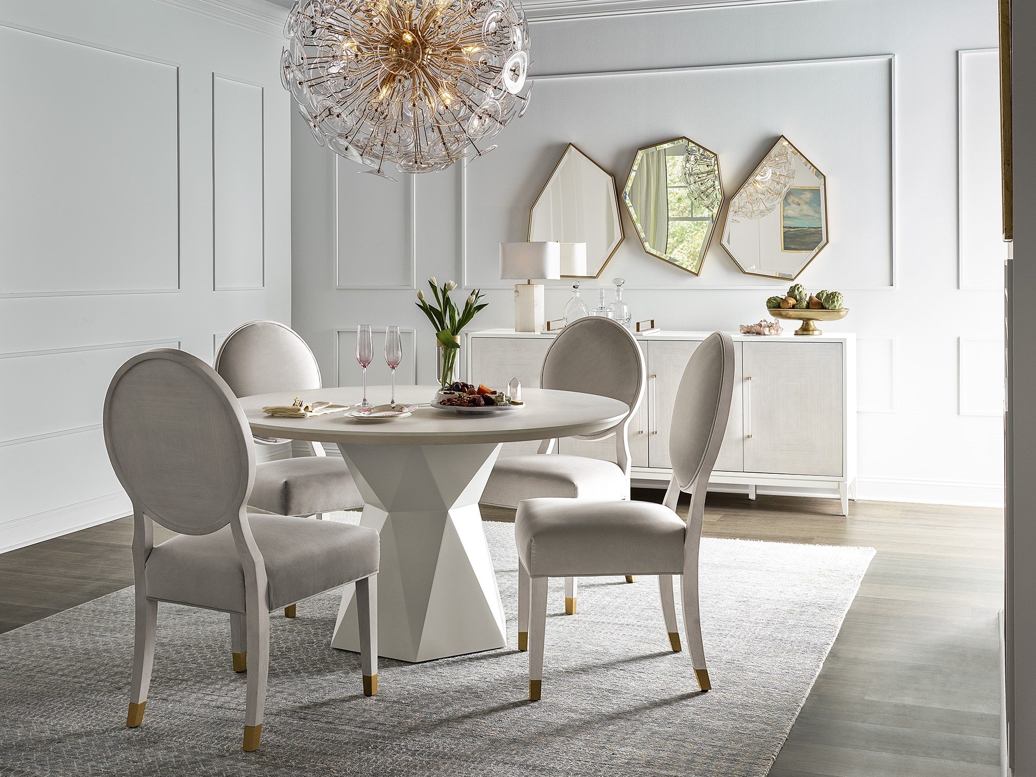 Simple yet exceedingly enchanting, the Geranium Dining Table enriches spaces with a sleek rounded top in an Alabaster finish and a geometric-style base in a white lacquer finish.