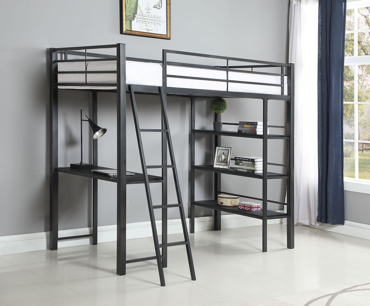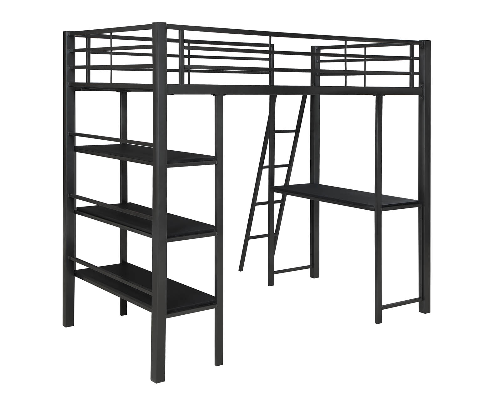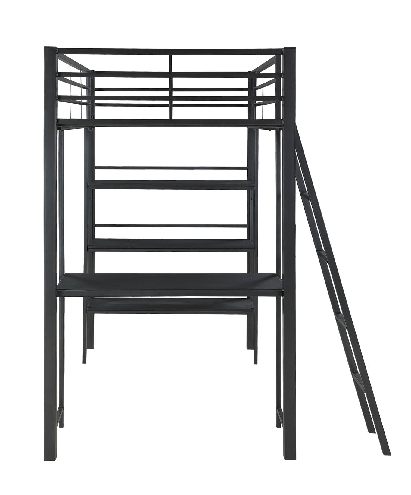 Make a teen’s or child’s room a haven for productivity. This twin workstation loft bed covers all the bases. A top bunk perches over a workstation setup with a desk and shelving, and a bottom bed that provides seating. Finished in gunmetal, it brings an eye-catching and versatile palette. This twin workstation loft bed is a perfect answer for a compact space.