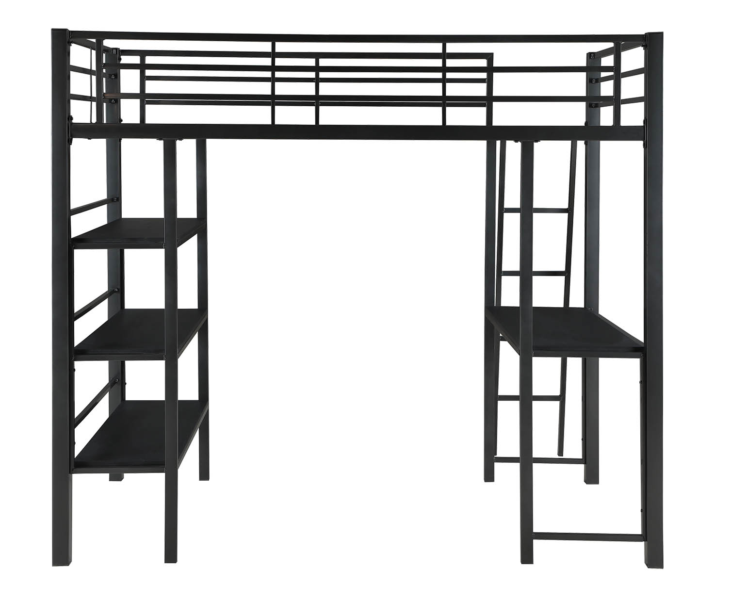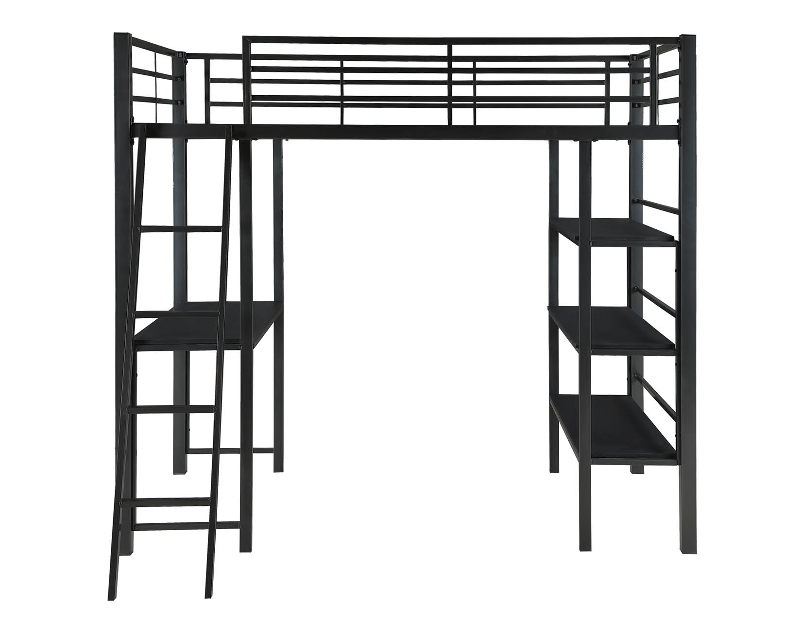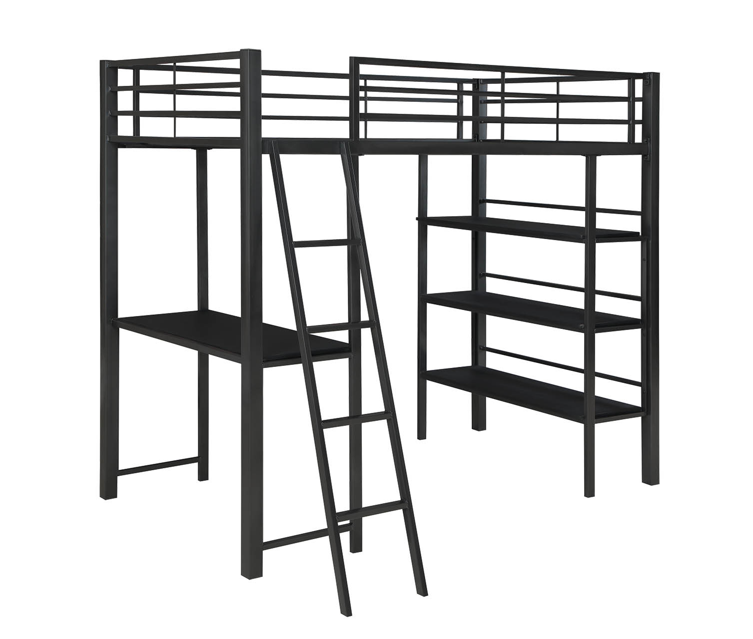 Make a teen’s or child’s room a haven for productivity. This twin workstation loft bed covers all the bases. A top bunk perches over a workstation setup with a desk and shelving, and a bottom bed that provides seating. Finished in gunmetal, it brings an eye-catching and versatile palette. This twin workstation loft bed is a perfect answer for a compact space.
