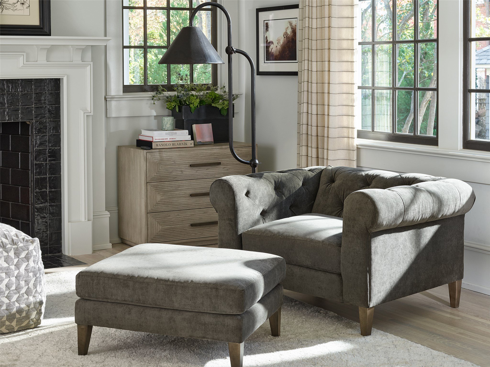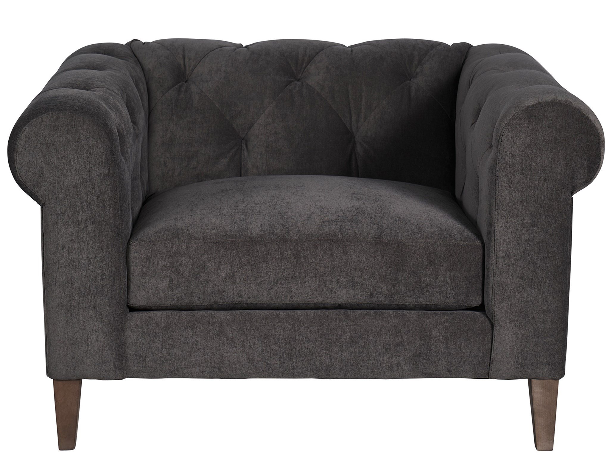 Regal and commanding of attention, the Hugh Chair boasts an inviting upholstered body, elegantly rolled armrests, and button-tufting details for added richness and depth.