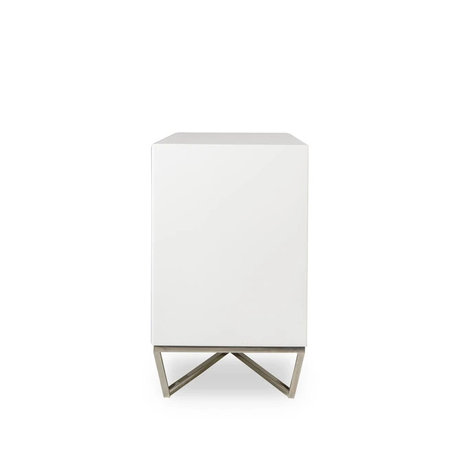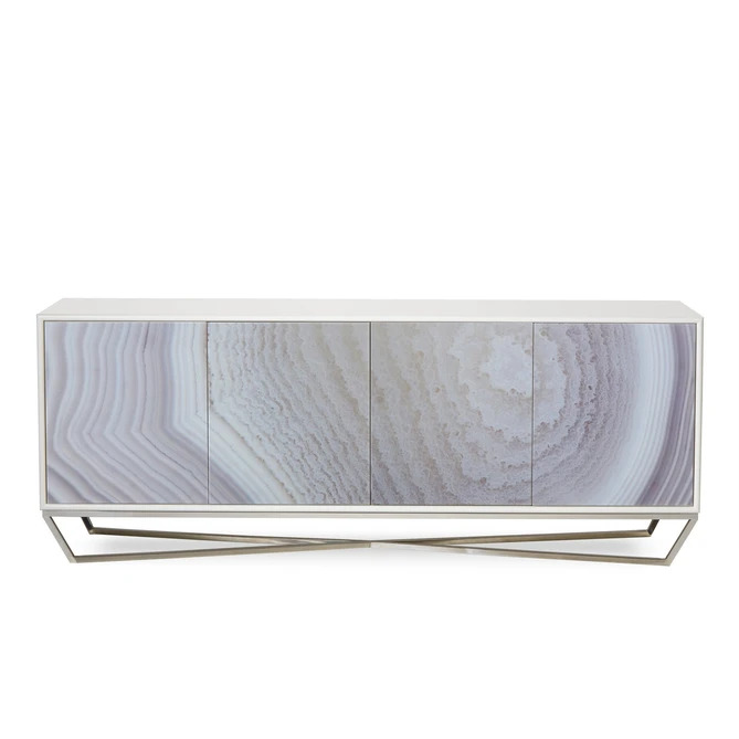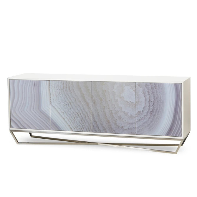 This spacious credenza exudes clean-lined, contemporary elegance. A sleek, polished nickel cross base tapers inwards underneath the table, and is paired with printed malachite glass cabinet fronts, in a versatile taupe and sand coloration that suits any space. The cabinet is wrapped in a snow white lacquer case, which sits beautifully alongside the colored, printed glass.