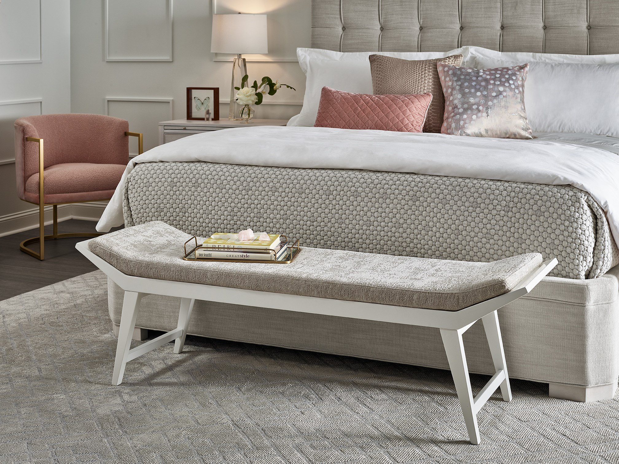 Equally beautiful as a stand-alone piece or at the foot of a bed, the Love Joy Bliss Bench evokes a casual elegance with a Bubbly Champagne upholstered seat nestled within a subtly curved white lacquer body.