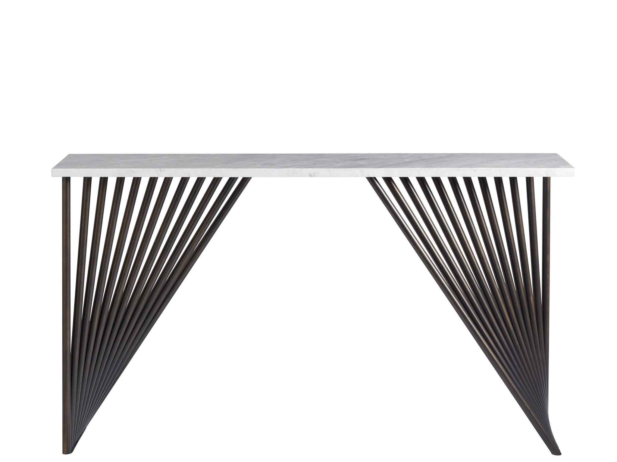 Ornament a hallway with the Marcel Console Table, a strongly angled statement piece featuring a smooth stone top set atop a bronze metal finished base.
