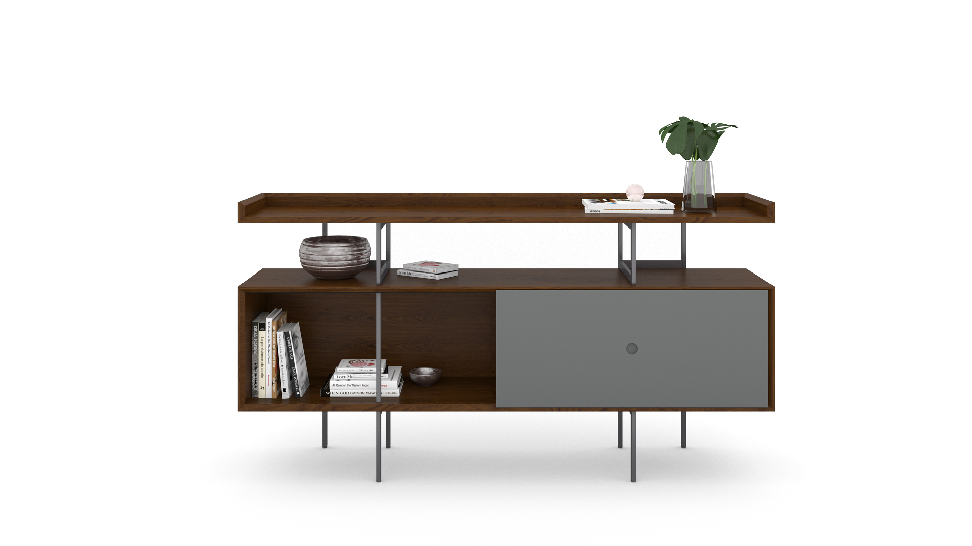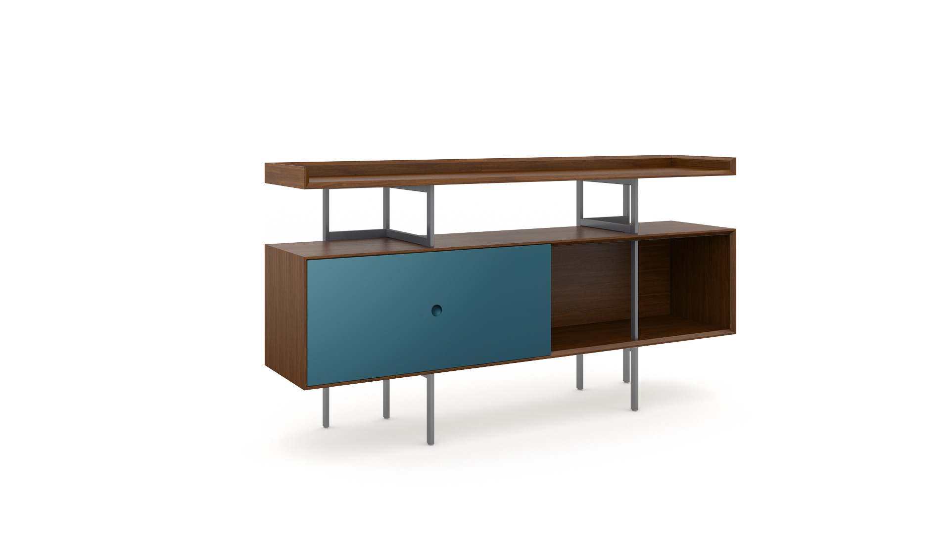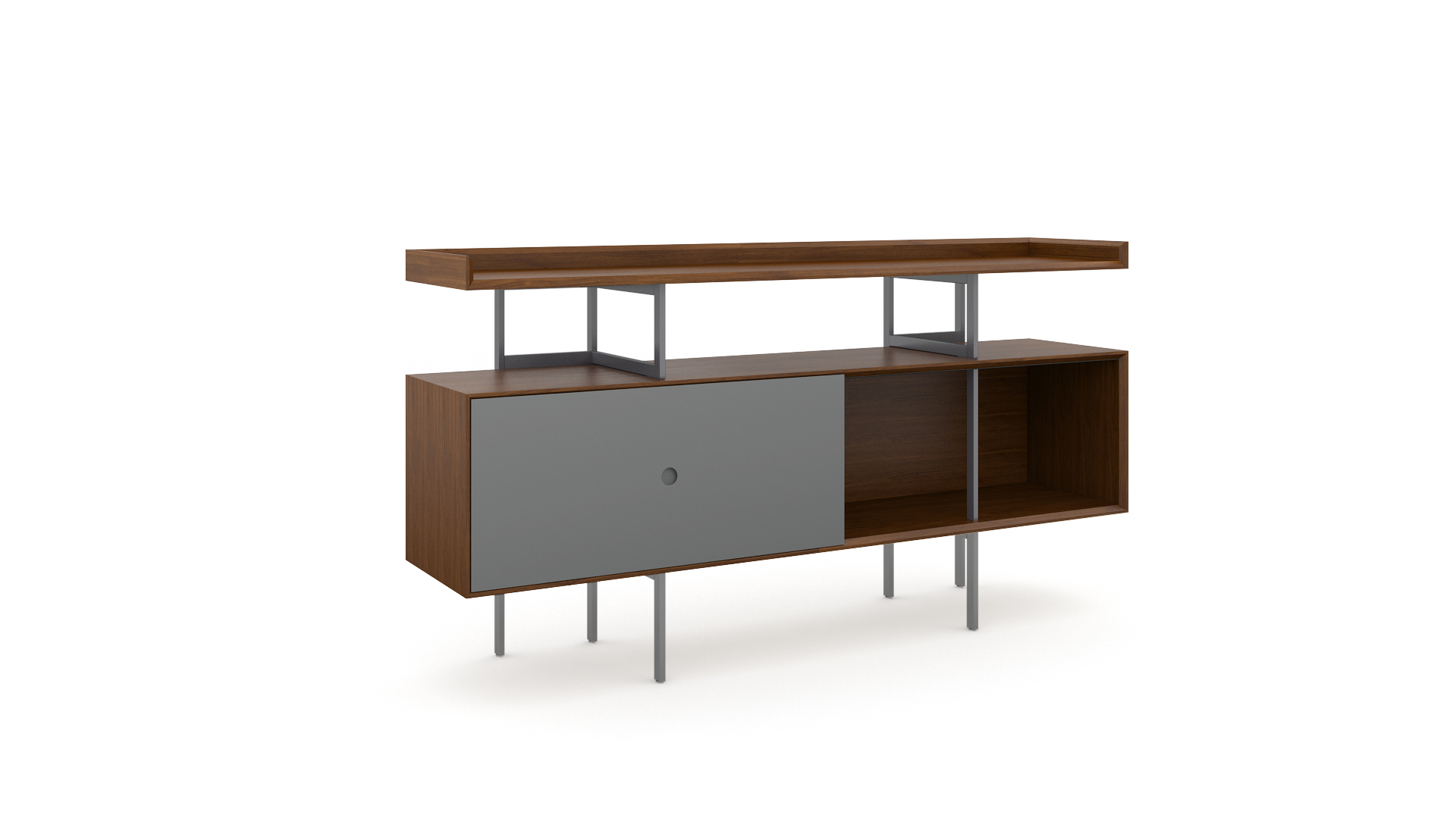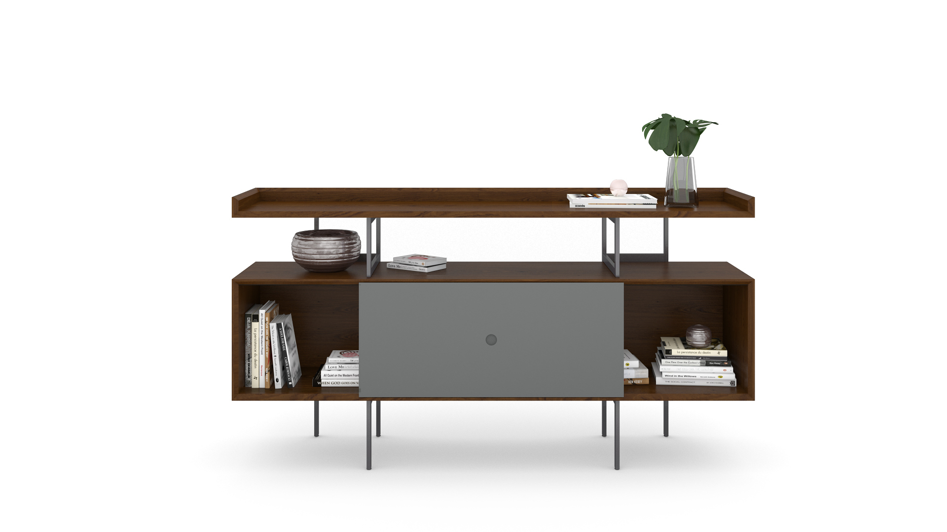 A distinctive three-sided top shelf appears to float above the console, providing open display space, and can even accommodate up to a 65″ flat-screen television for light AV use. Ample storage compartments below are ideal for a host of personal items, whether concealed behind an ultra-smooth self-closing door or in full view. Part of the Margo Collection.