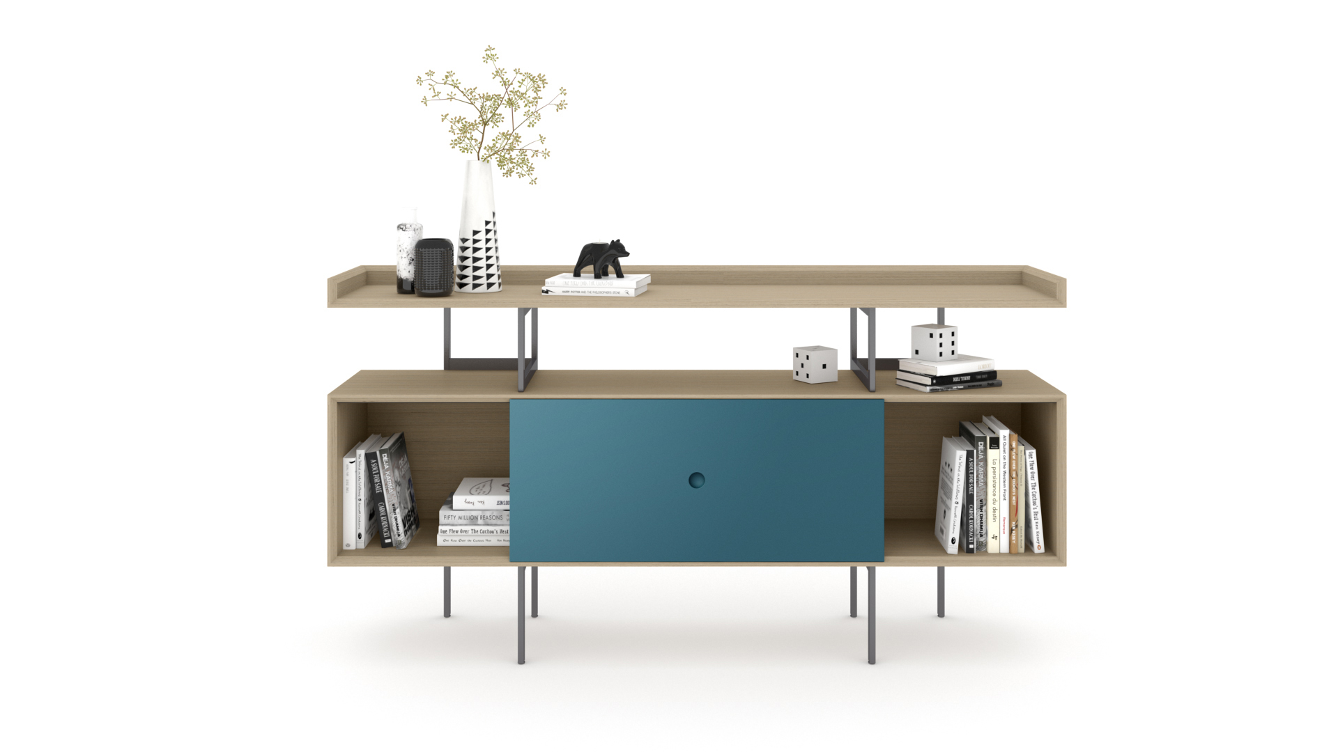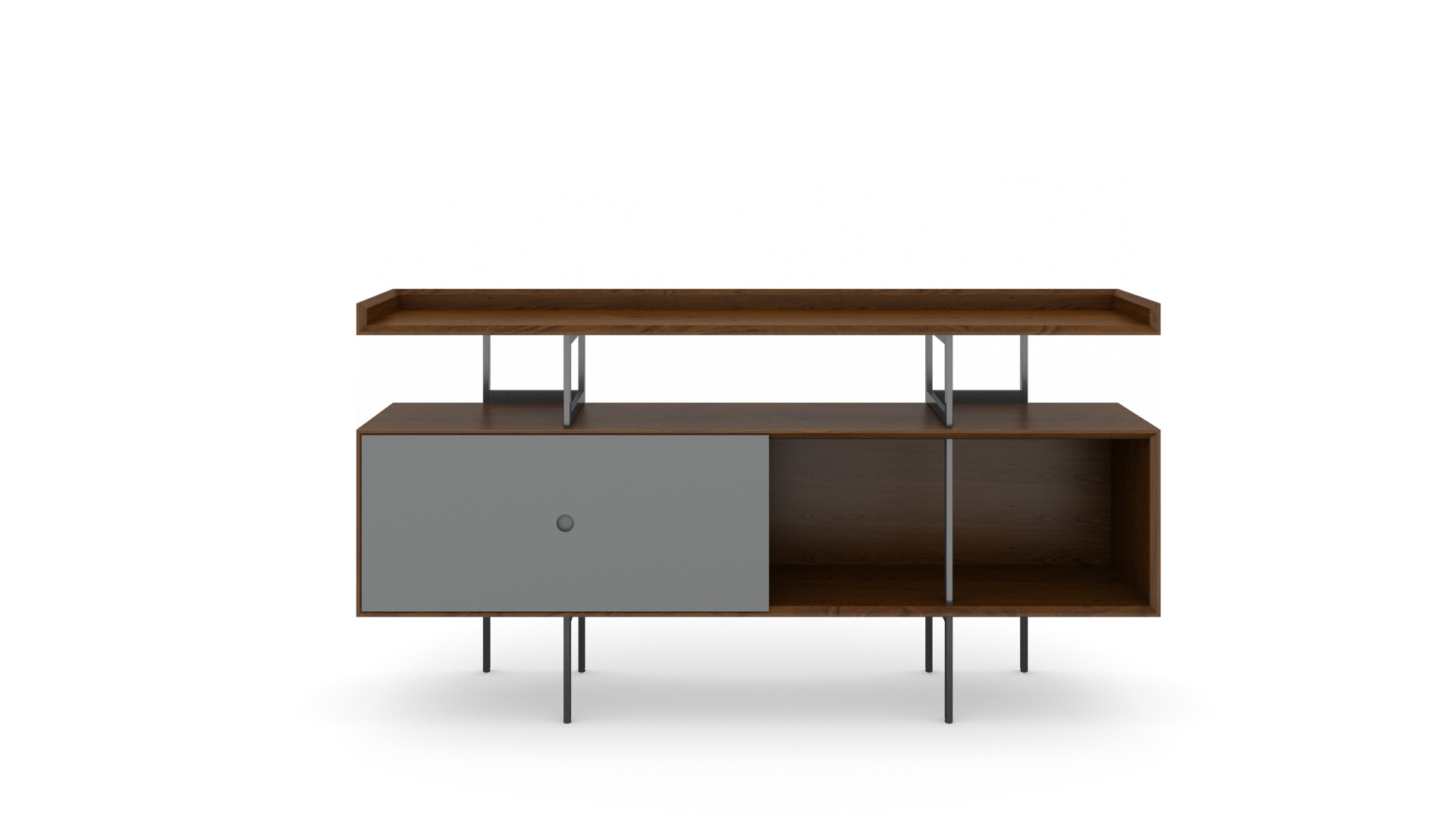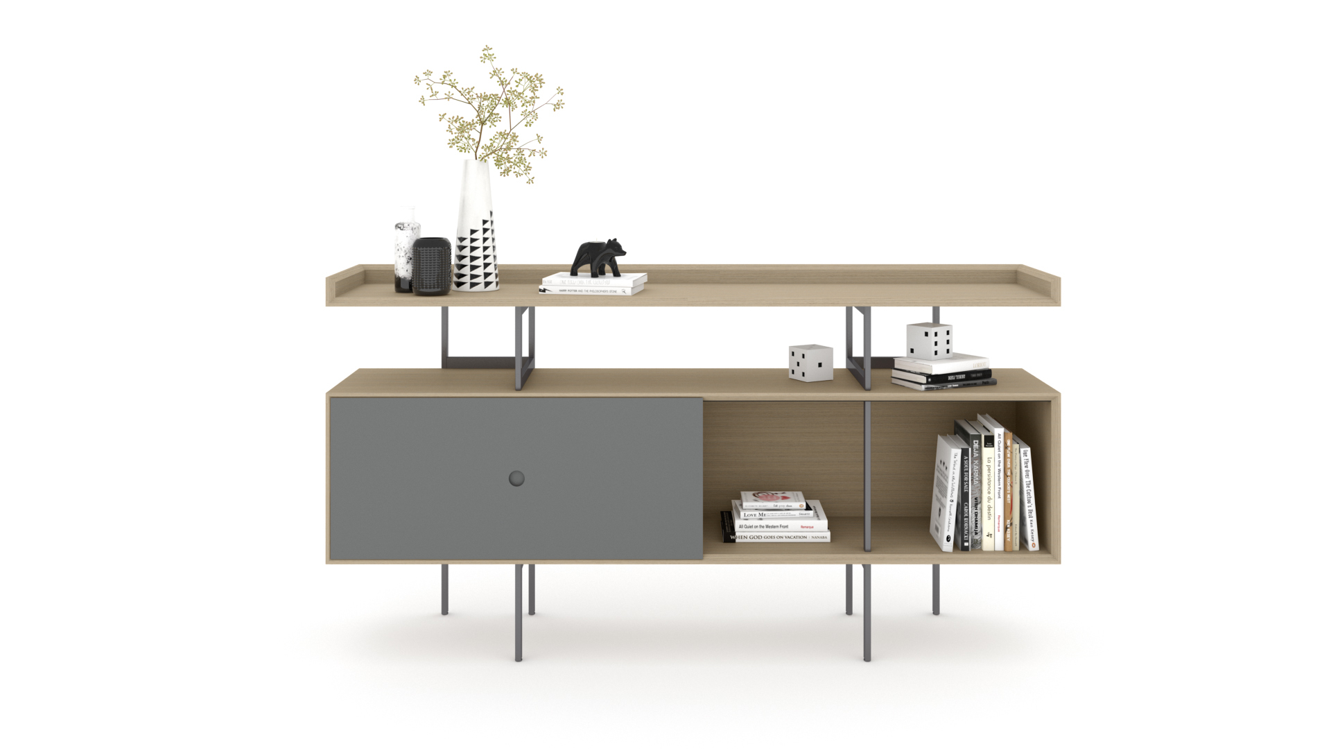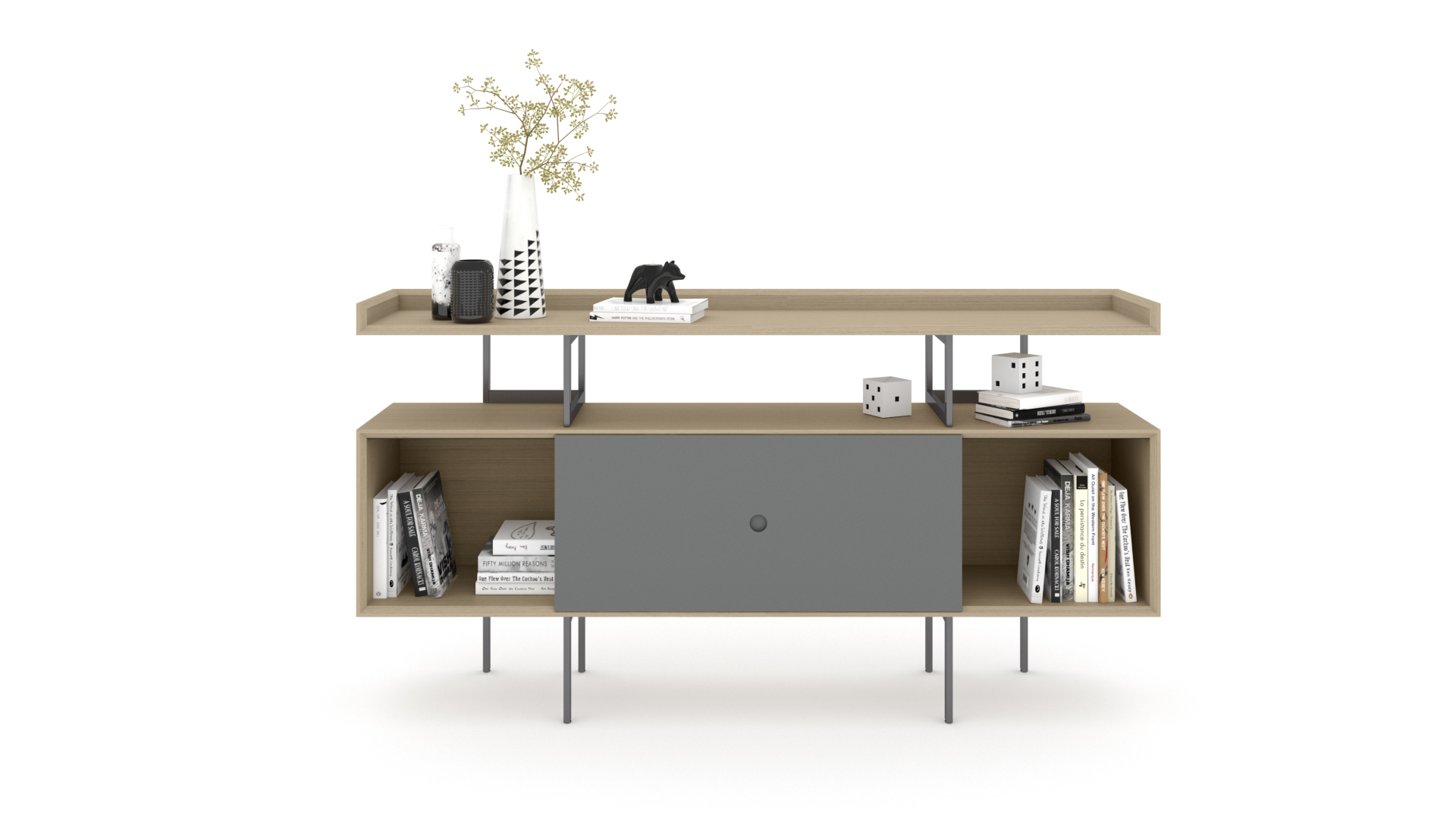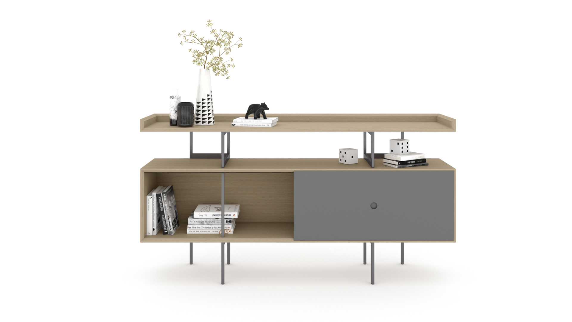 A distinctive three-sided top shelf appears to float above the console, providing open display space, and can even accommodate up to a 65″ flat-screen television for light AV use. Ample storage compartments below are ideal for a host of personal items, whether concealed behind an ultra-smooth self-closing door or in full view. Part of the Margo Collection.
