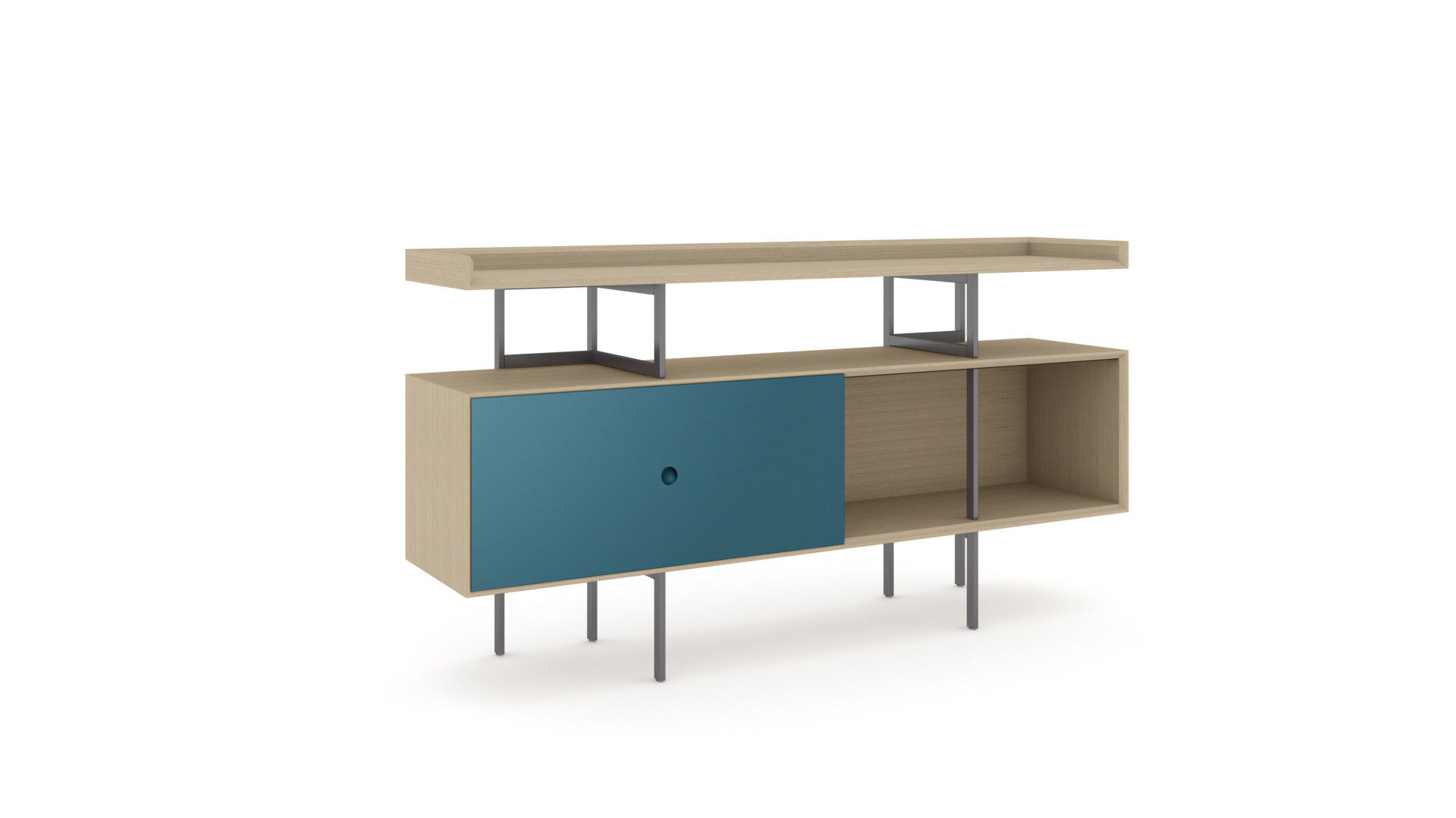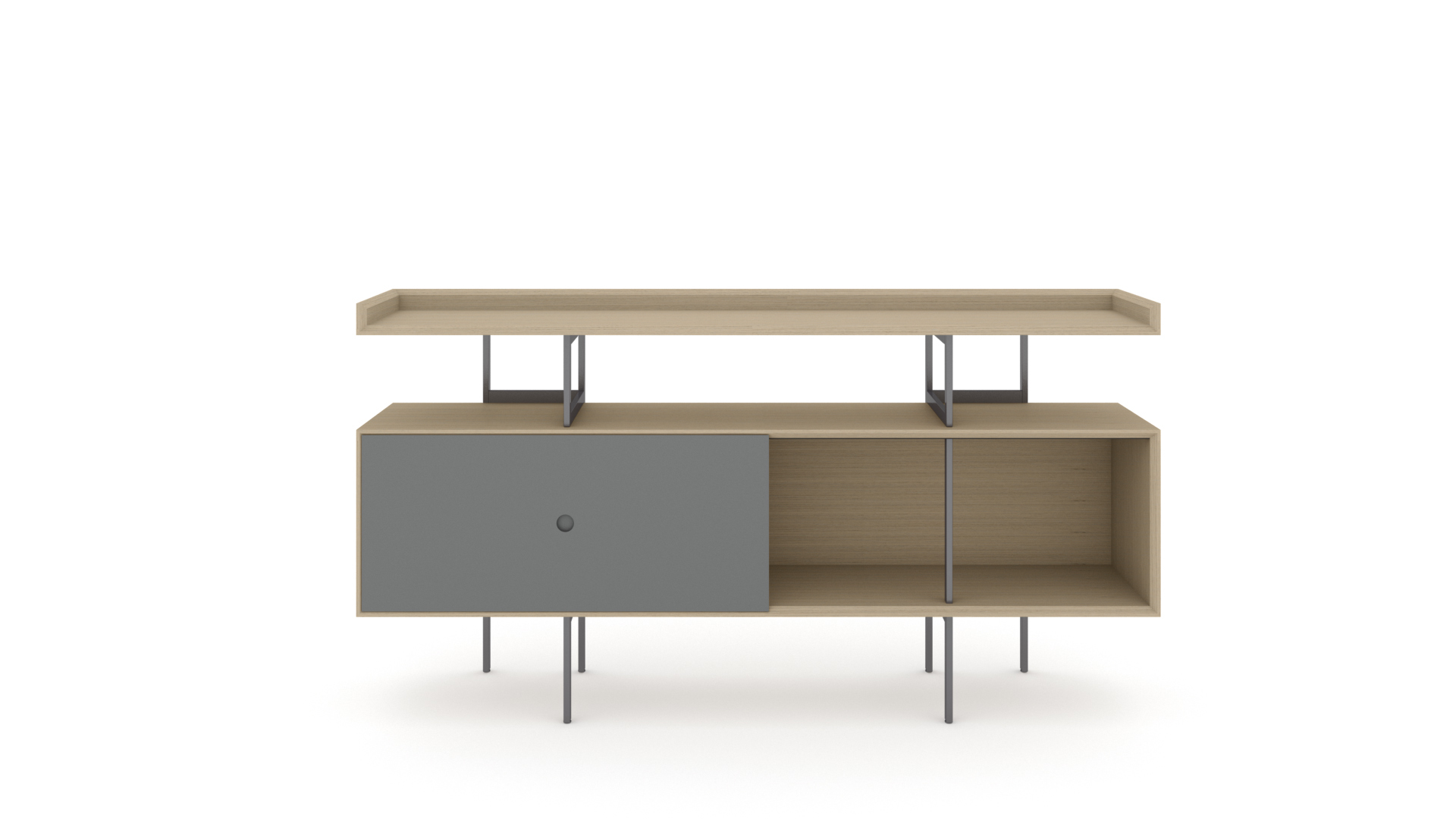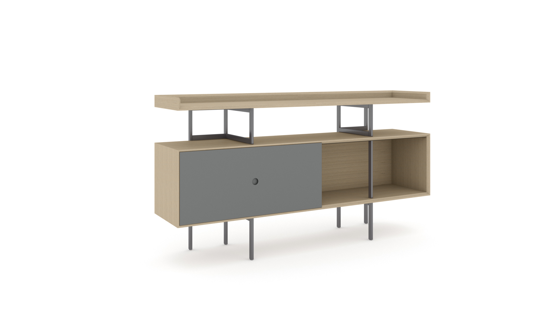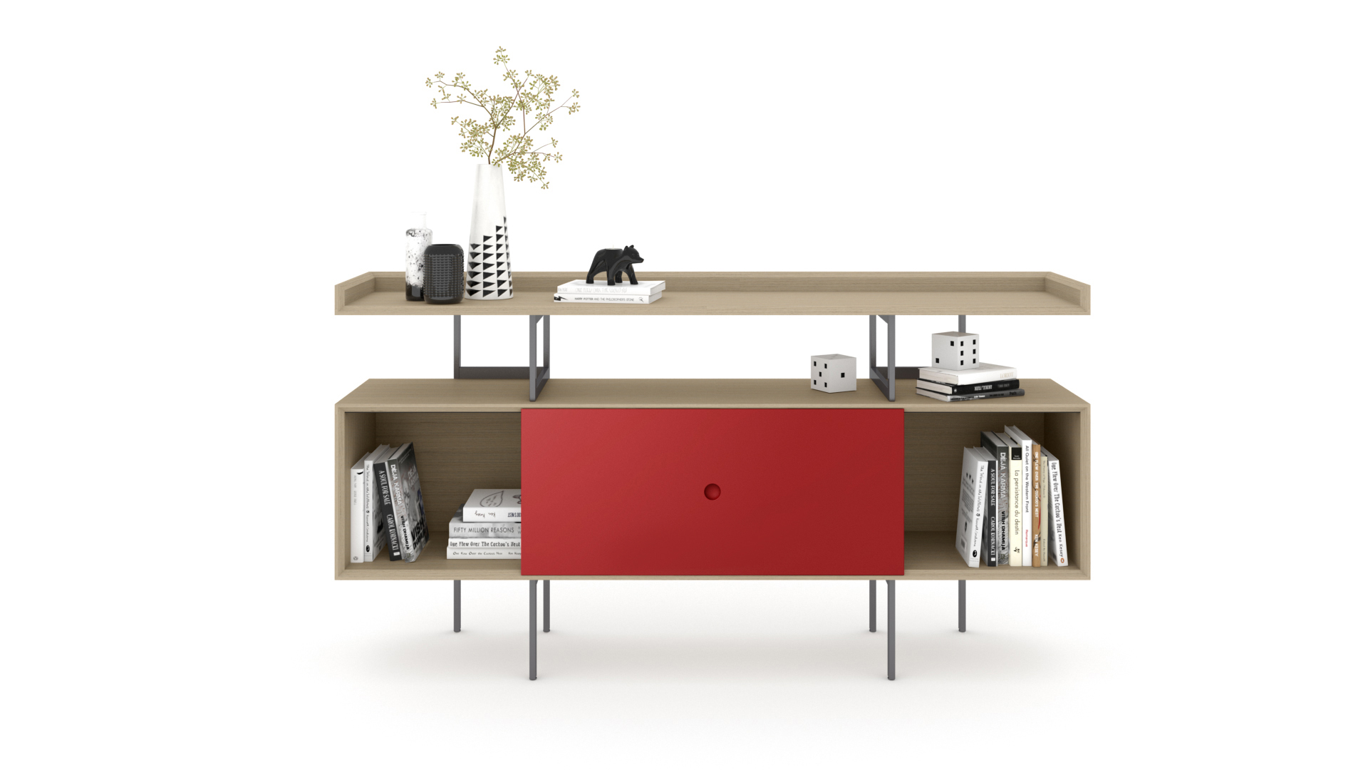 A distinctive three-sided top shelf appears to float above the console, providing open display space, and can even accommodate up to a 65″ flat-screen television for light AV use. Ample storage compartments below are ideal for a host of personal items, whether concealed behind an ultra-smooth self-closing door or in full view. Part of the Margo Collection.