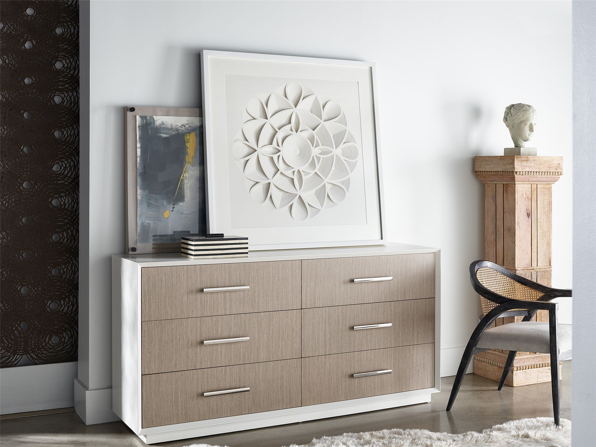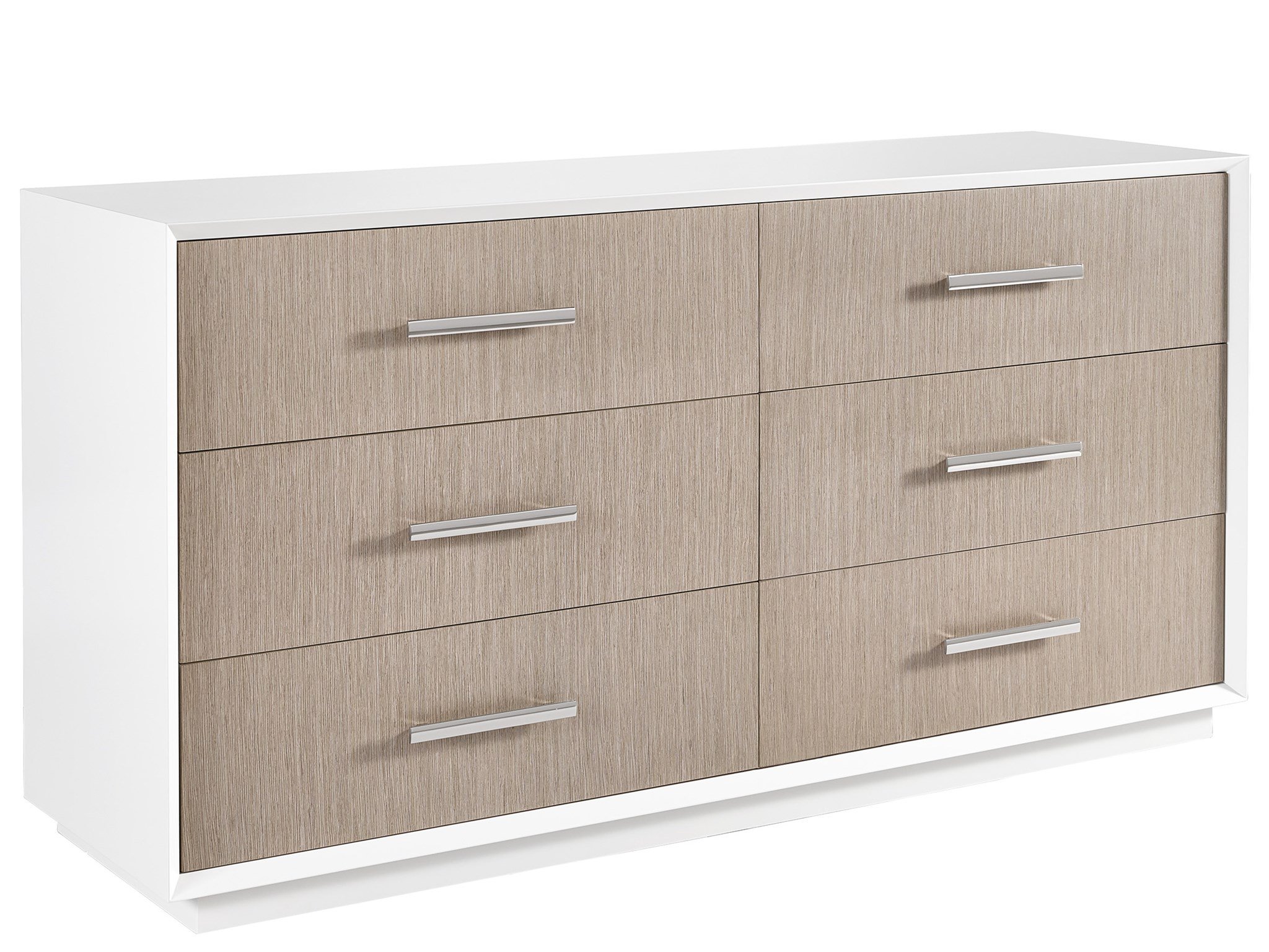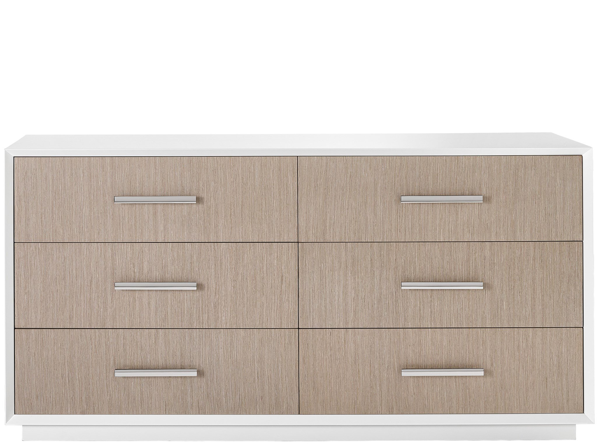DETAILS Defined by clean Pumice-finished wood front drawers and wrapped with a sleek Glacier top and sides this modern dresser features six roomy drawers and modern metal pulls.
