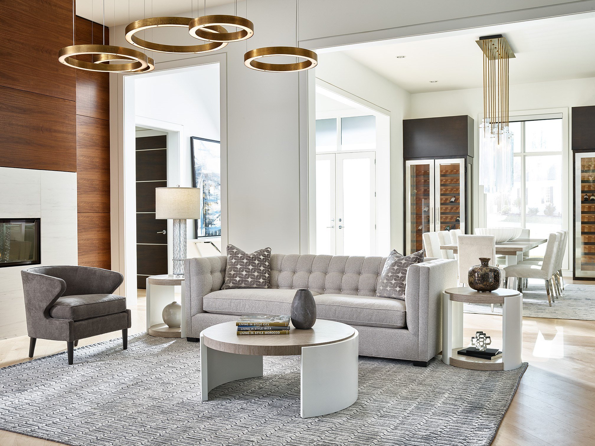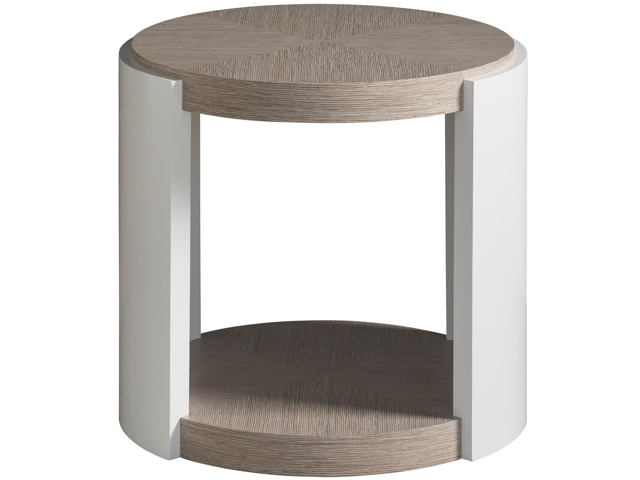 The Round End Table strikes an intriguing balance between light and robust, featuring neutral tabletops cradled within a subtly curved, clean white base.