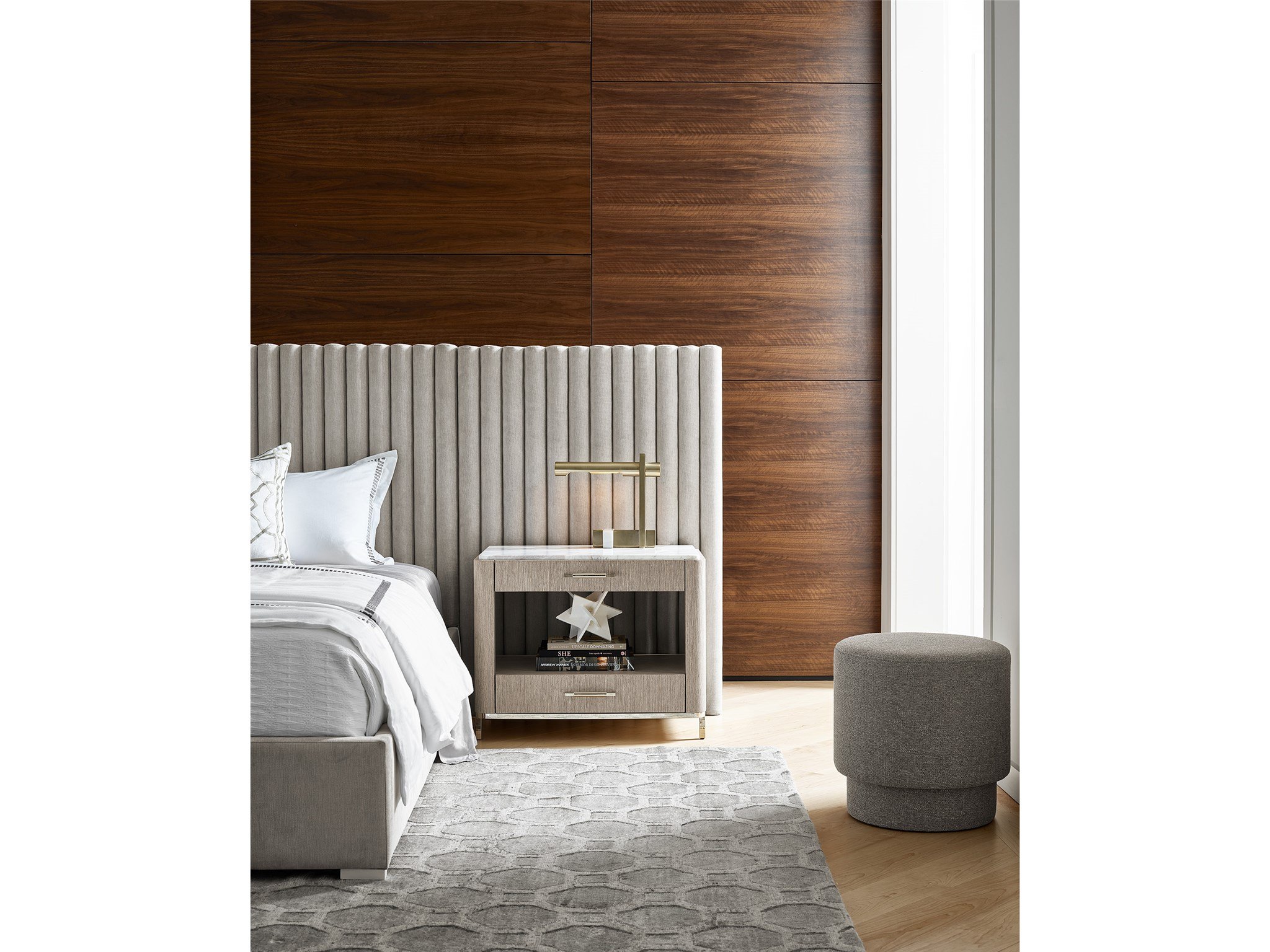 The Soren Bedside Table is a gorgeous marriage of texture and materials, featuring a stone top, sleek bar hardware and a metal base. It includes two spacious drawers and one open-air display shelf.