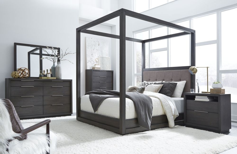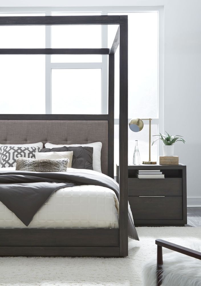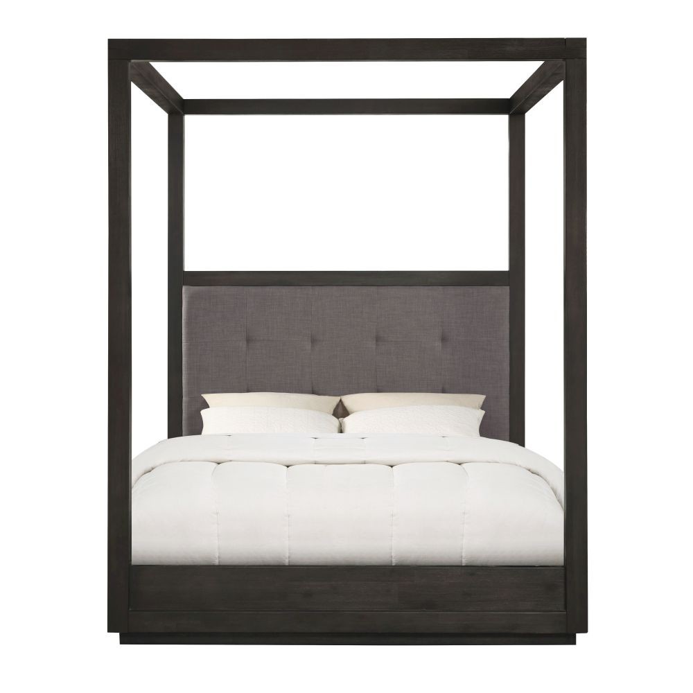 The sleekly tailored Oxford collection makes a striking first impression with bold proportions, crisp, modern lines and a weathered finish. Smartly accented with top-mounted nickel plated pulls, concealed footboard storage, and a floating plinth base. Available in Basalt Grey. Solid Acacia with Acacia veneer Mitered top and side panels Wire brushing enhances natural grain patterns Button-tufted headboard panel in yarn dyed gray linen, 100% polyester