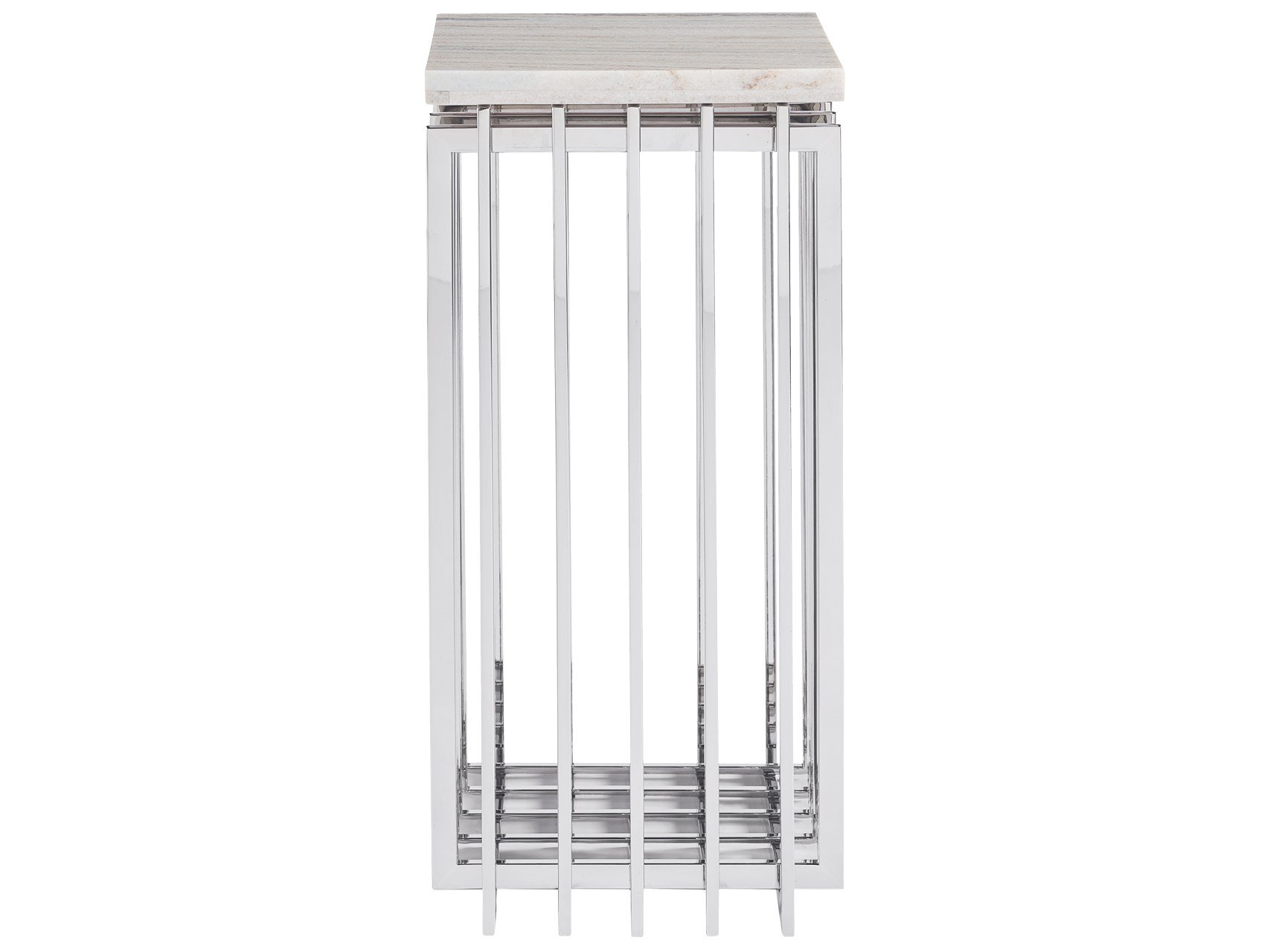 DETAILS Add stylish convenience to living spaces with the Paradox Chairside Table, made truly unique by a series of gleaming silver legs offset by a smooth marble top.