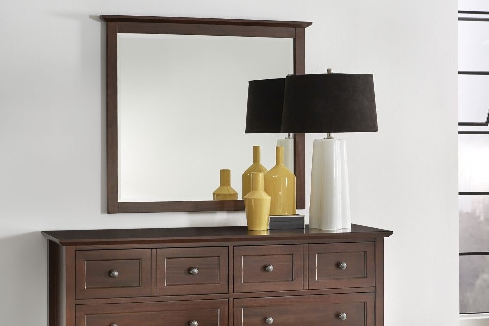 Get a fresh take on classic Shaker style with the Paragon bedroom from Modus Furniture. Crafted entirely from solid Mahogany in an opaque Truffle finish, this group features a simple, framed panel design with reverse bevel floating tops. Casegoods rest atop tapered legs with a gently arched lower side cross.