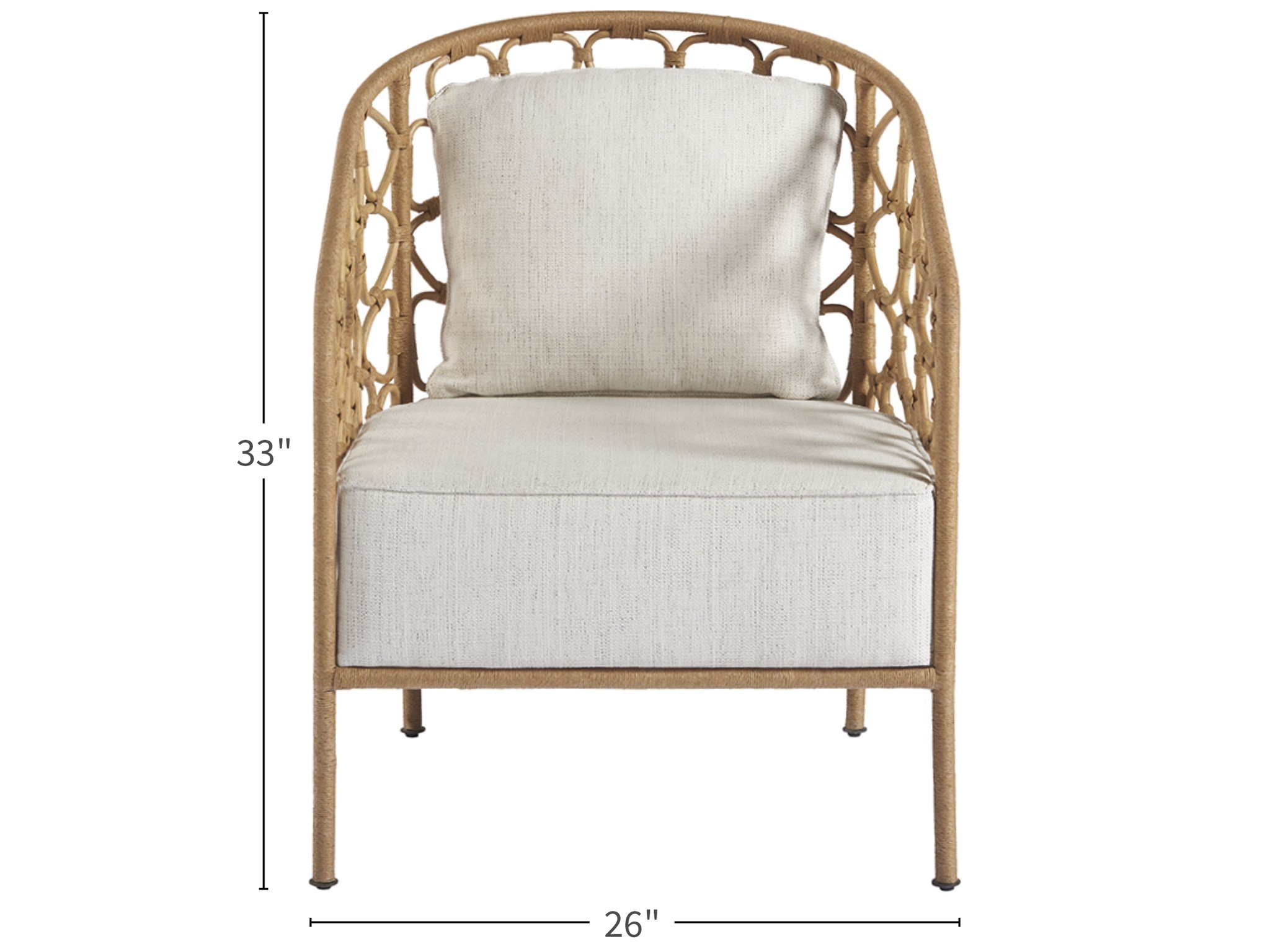 A sweetly curved silhouette intertwined with freely shaped rattan, as well as an upholstered seat and kidney pillow, define the Pebble Accent Chair, a warm yet wonderfully breezy home furnishing.
