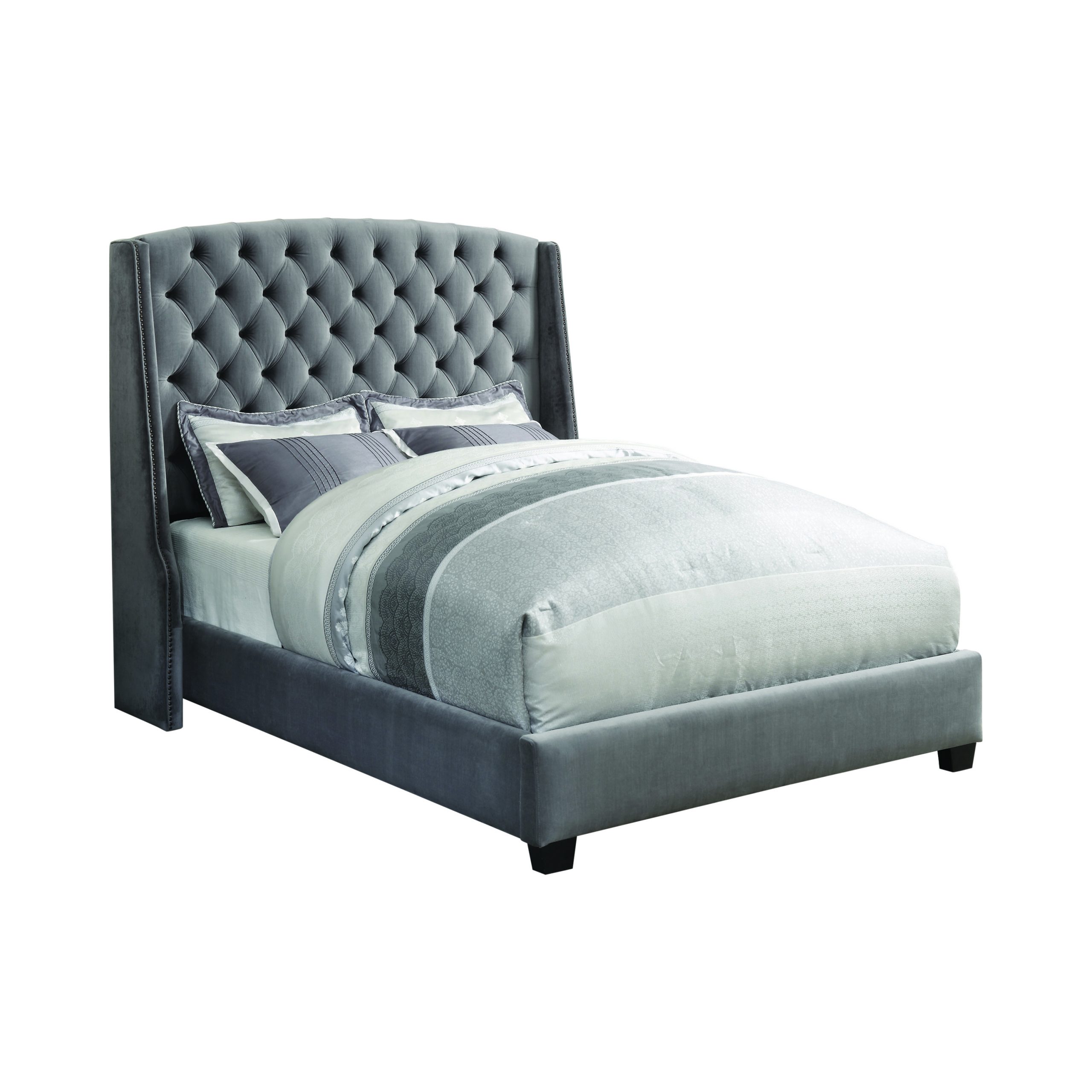 This majestic bed adds sophistication and charm to the bedroom decor. From the Pissarro collection, the bed is crafted in a charming wingback design. It’s upholstered in velvet with a luxurious button-tufted headboard that features meticulous individual nailhead trim. Solid wood-turned legs are finished in rich contrasting cappuccino. This bed is an elegant centerpiece for the bedroom.